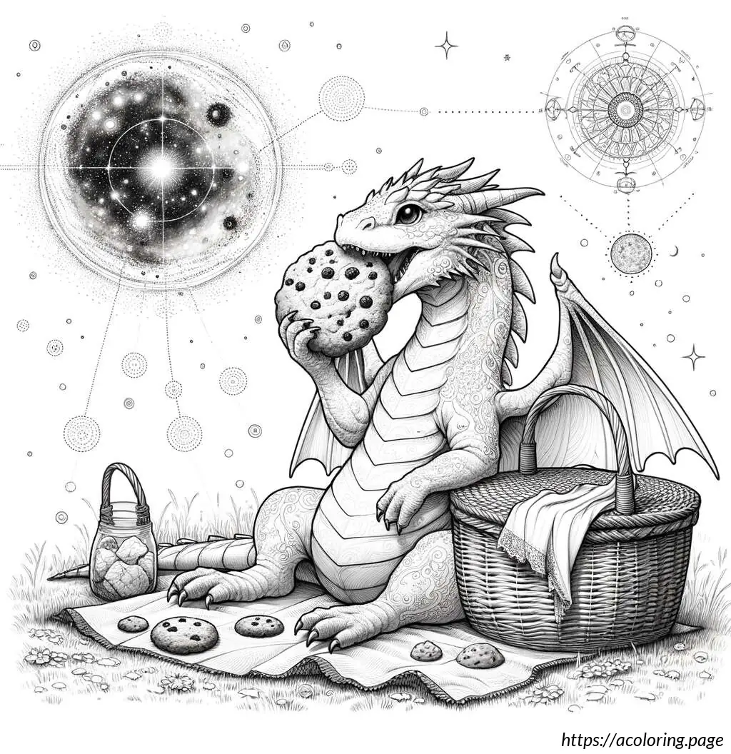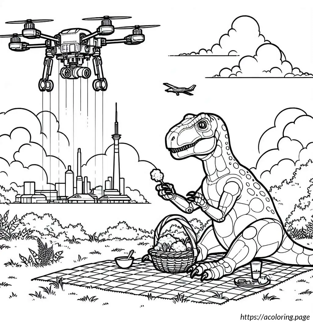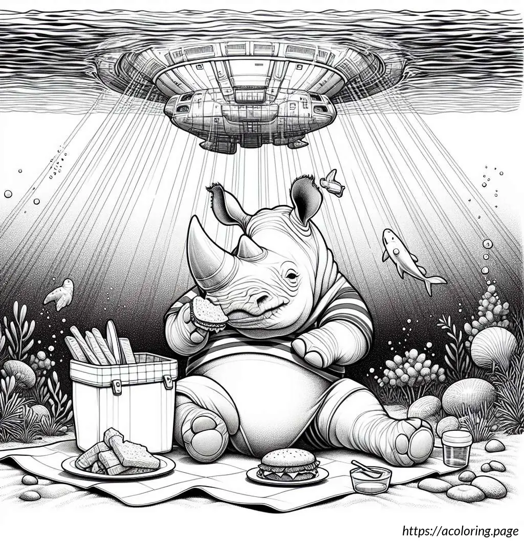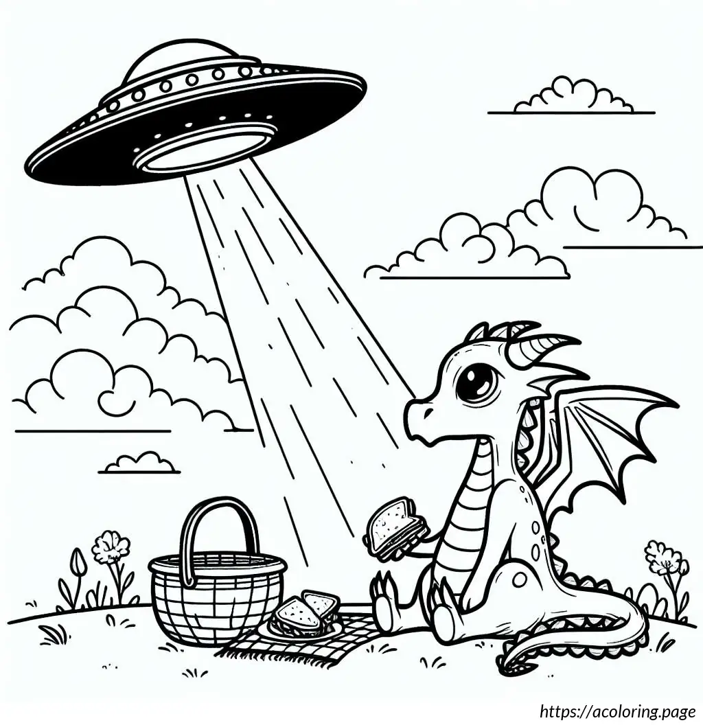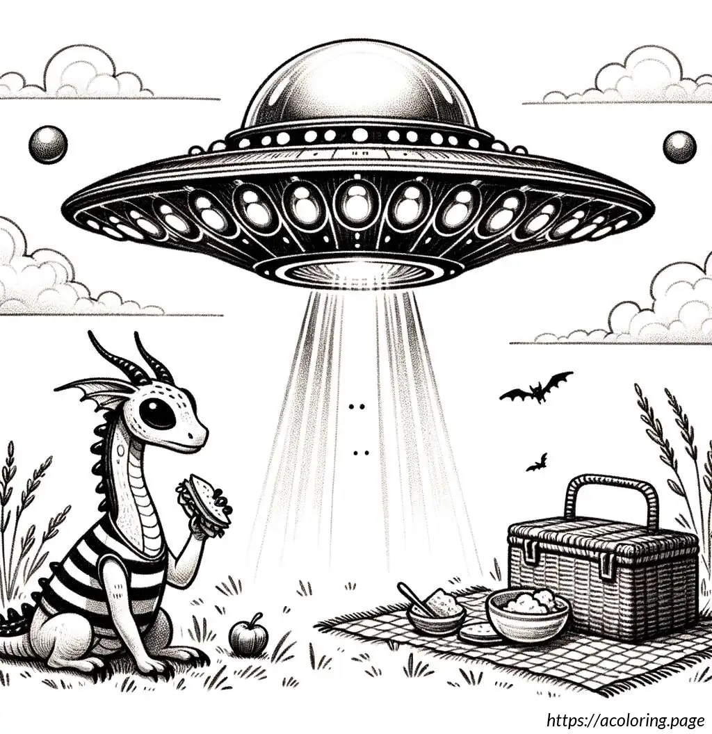 This image is a whimsical black-and-white illustration that features a cartoon dinosaur sitting on grass, looking surprised as it is being abducted by a flying saucer. The UFO, depicted above the dinosaur, emits a beam of light which envelops the dinosaur, drawing it upwards. The dinosaur, which has horns on its head and appears somewhat perplexed, is holding a sandwich. Next to the dinosaur, there’s a picnic basket on a small blanket, suggesting that the dinosaur was in the middle of a meal outdoors when this unexpected event began to unfold. There are also a couple of fluffy clouds in the sky, adding to the outdoor, daytime setting of the scene.