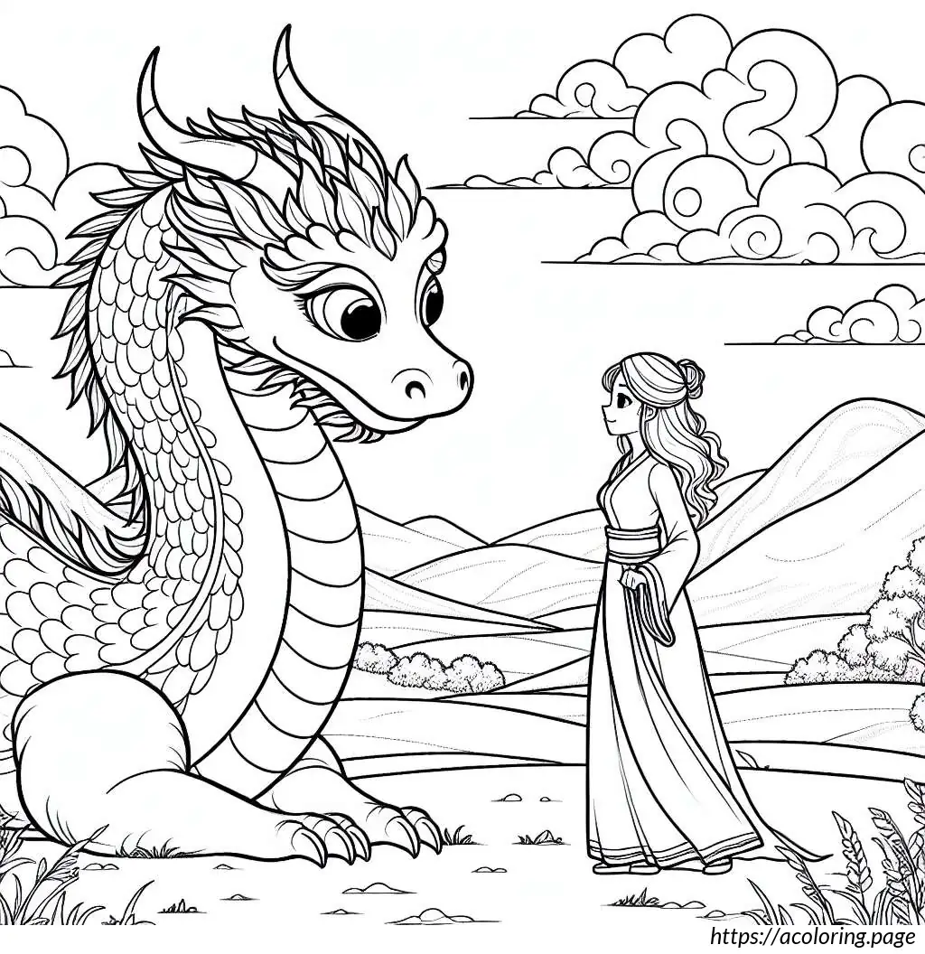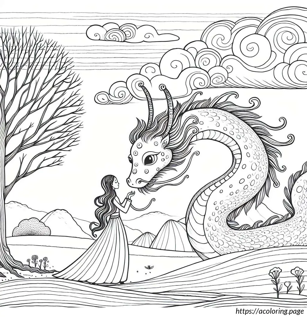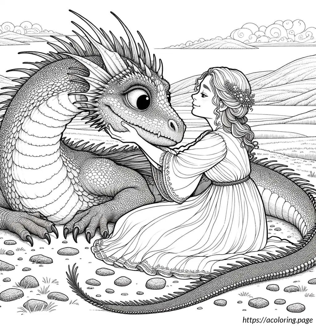 Beside the dragon, there is a young woman with a gentle expression, wearing a long, flowing dress. She is interacting affectionately with the dragon, placing one hand on the dragon’s cheek and looking directly into its eyes.