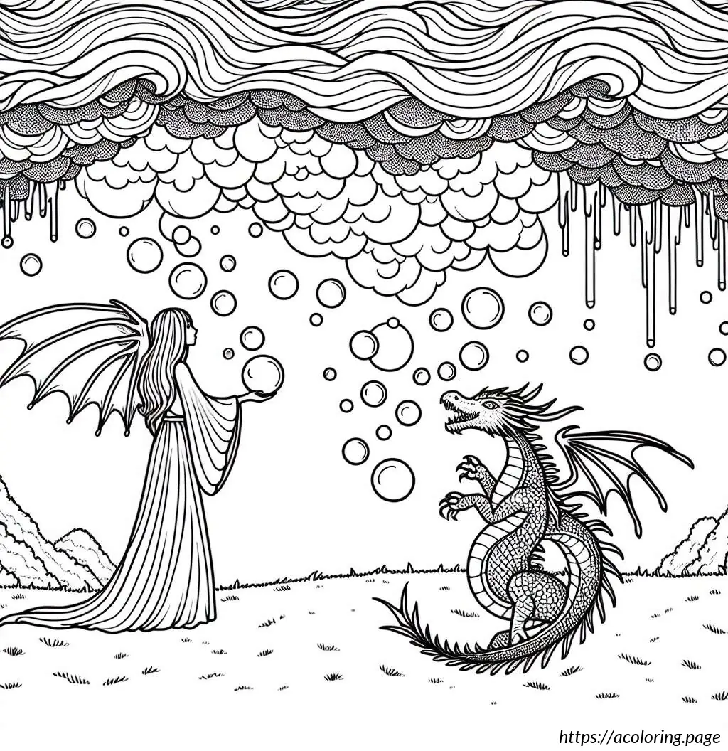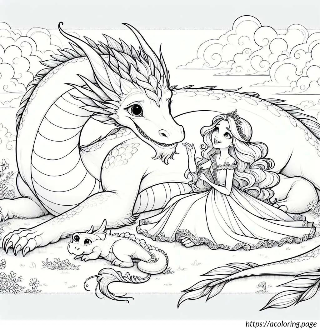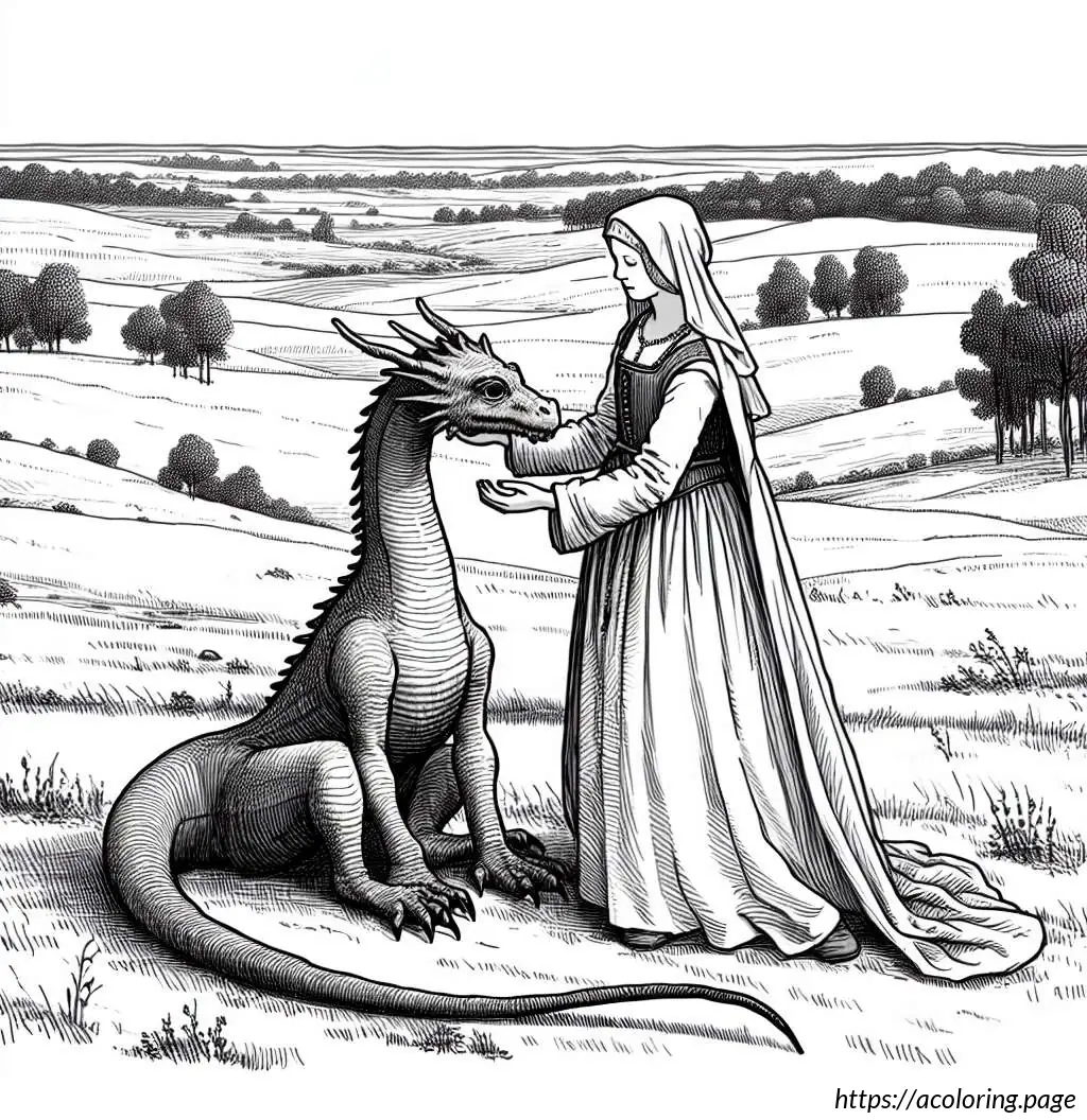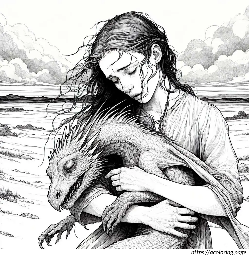 Beside the dragon, there is a young woman with a gentle expression, wearing a long, flowing dress. She is interacting affectionately with the dragon, placing one hand on the dragon’s cheek and looking directly into its eyes.
