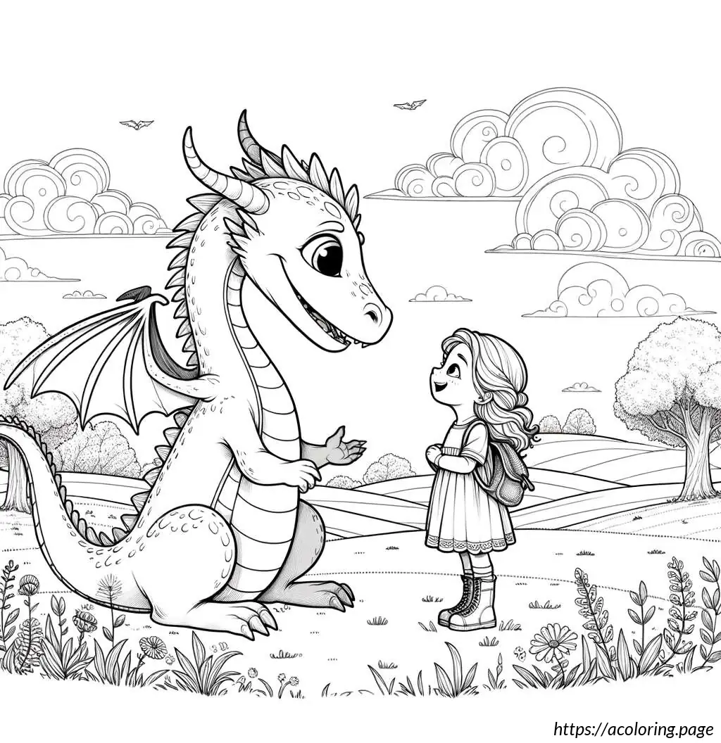 The background includes a simple landscape with hills and a few clouds in the sky. The overall scene suggests a moment of friendship or connection between the human and the dragon, set in a peaceful natural environment.