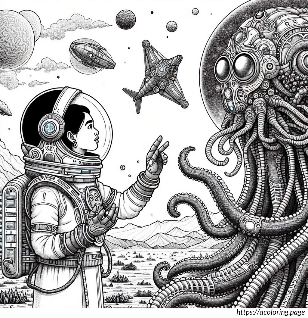 This is a black and white line drawing that depicts a fantastical scene in an outdoor setting. There is a dragon lying on the ground, portrayed with a friendly and somewhat surprised expression. The dragon has large eyes, scaly skin, and spiky protrusions along its head and body. Its tail is long and spiky, extending off the side of the image.