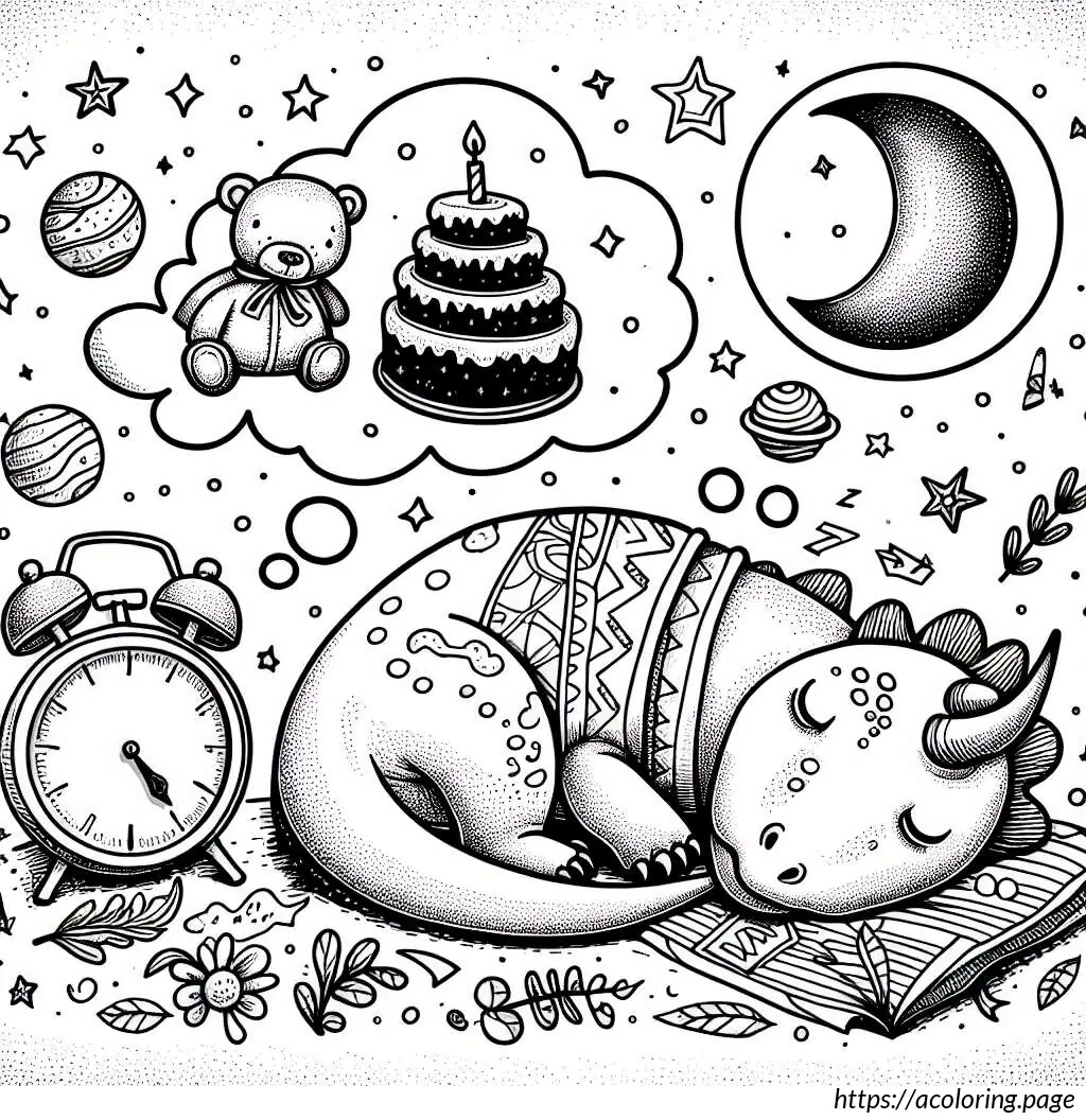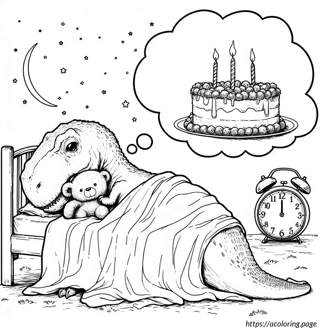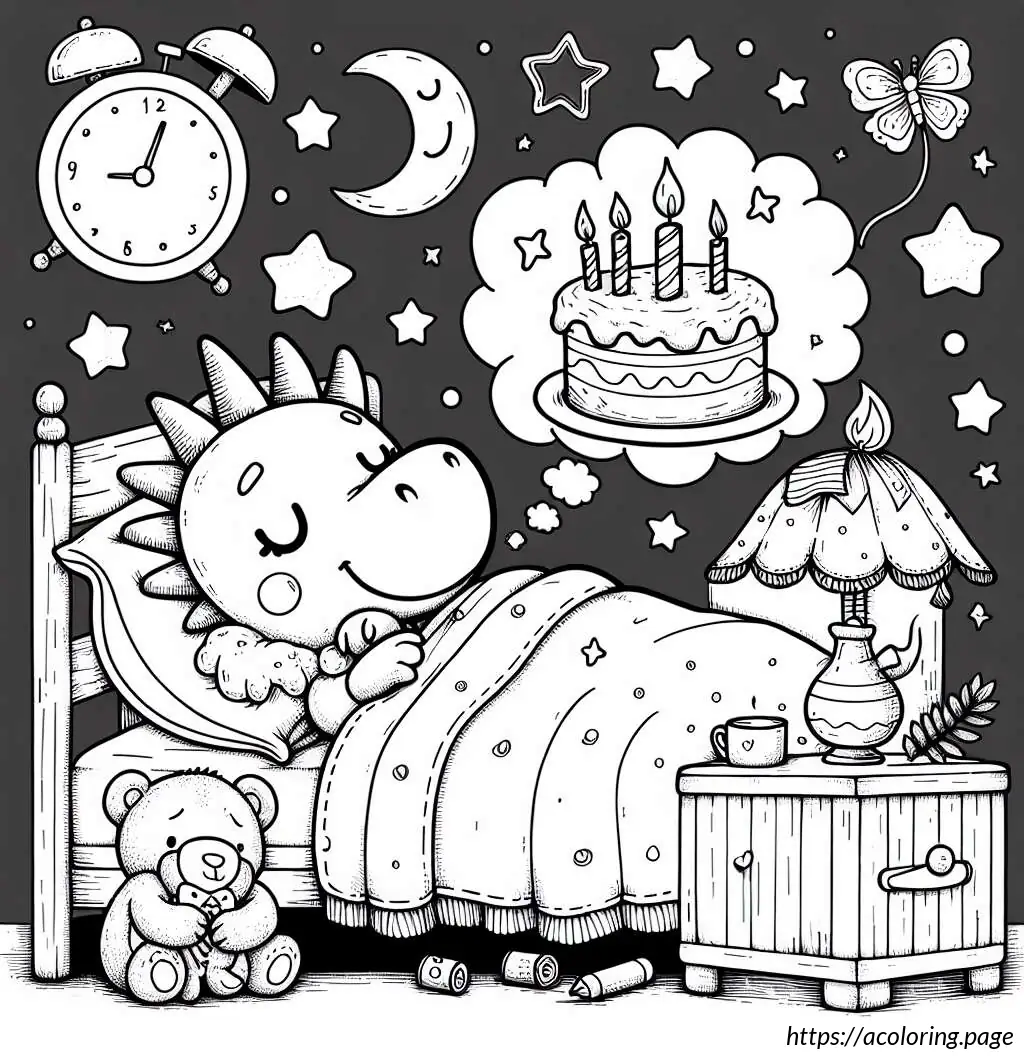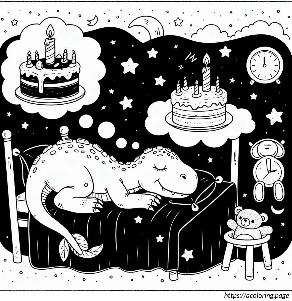 This image is a black and white illustration depicting a sleeping dinosaur. The dinosaur is lying on its side and appears to be dreaming, as indicated by a thought bubble. Inside the bubble, there’s an image of a birthday cake with a single lit candle. The cake sits on a small plate. The scene is set in a whimsical atmosphere, accompanied by a stylized crescent moon and a few stars in the background. Near the sleeping dinosaur, there is an alarm clock to the right and a small teddy bear to the left, suggesting a cozy bedtime scenario. The entire image exudes a gentle, dreamy quality.