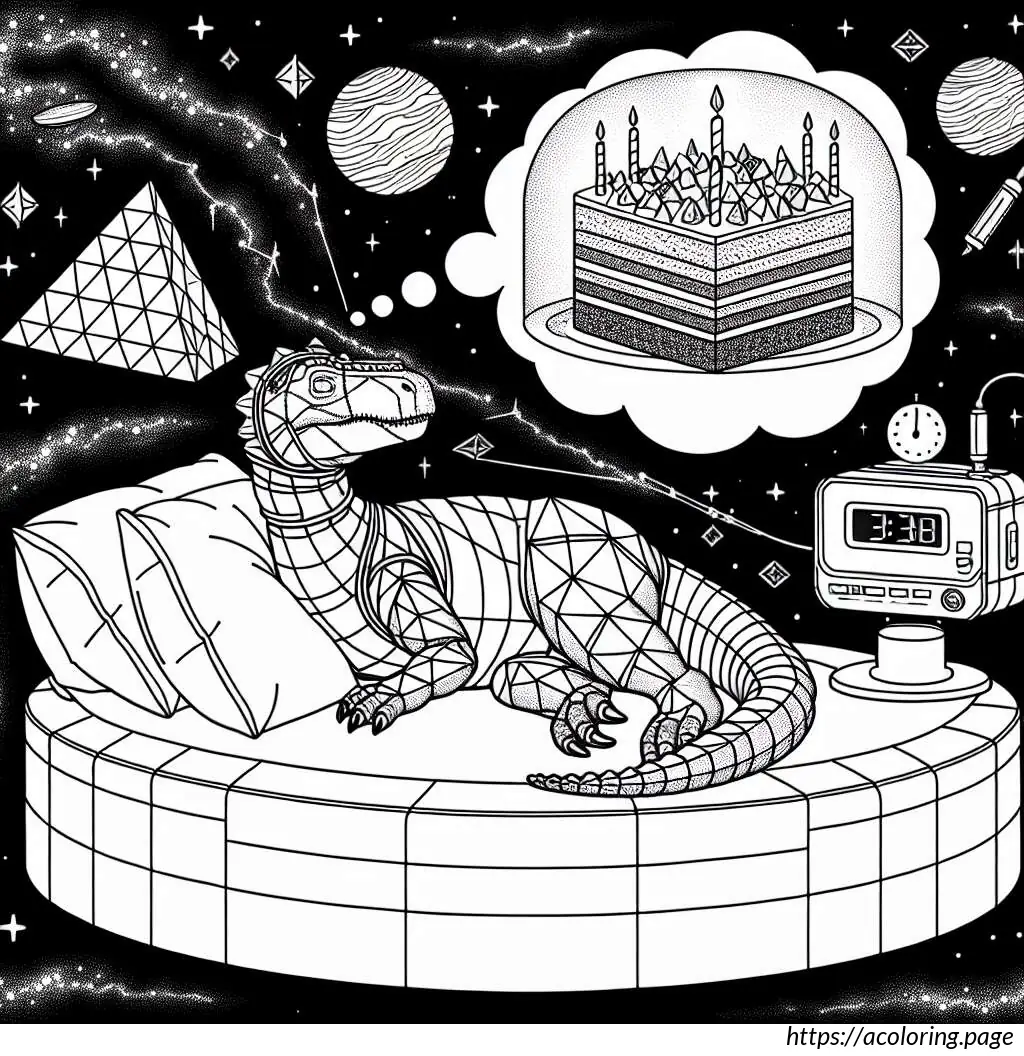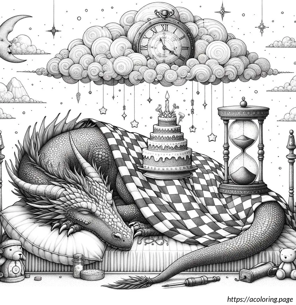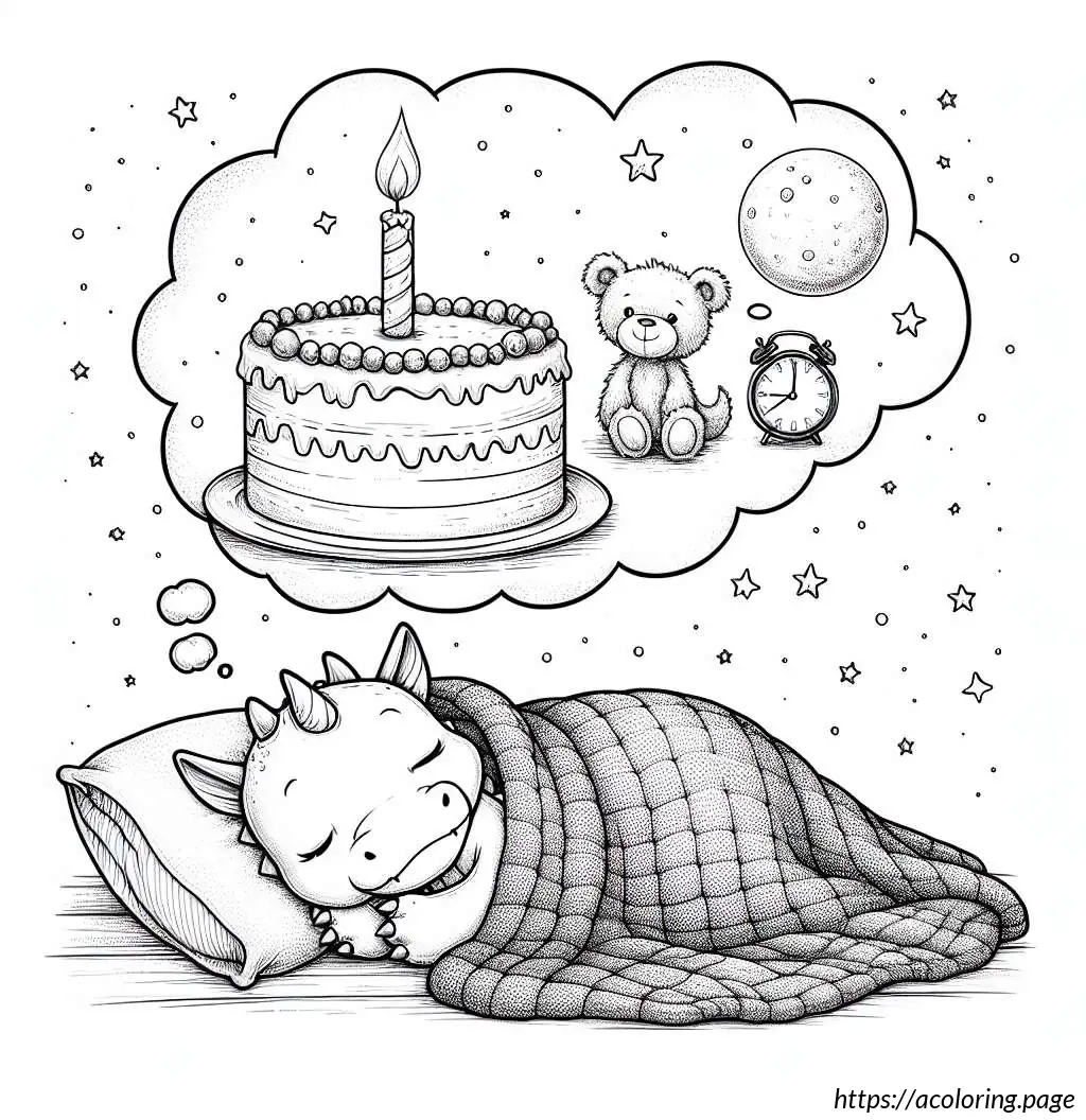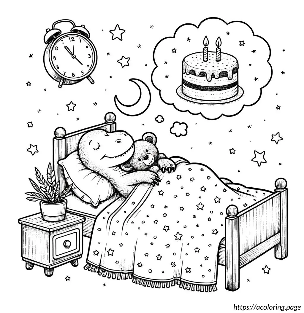 This image is a black and white illustration depicting a sleeping dinosaur. The dinosaur is lying on its side and appears to be dreaming, as indicated by a thought bubble. Inside the bubble, there’s an image of a birthday cake with a single lit candle. The cake sits on a small plate. The scene is set in a whimsical atmosphere, accompanied by a stylized crescent moon and a few stars in the background. Near the sleeping dinosaur, there is an alarm clock to the right and a small teddy bear to the left, suggesting a cozy bedtime scenario. The entire image exudes a gentle, dreamy quality.