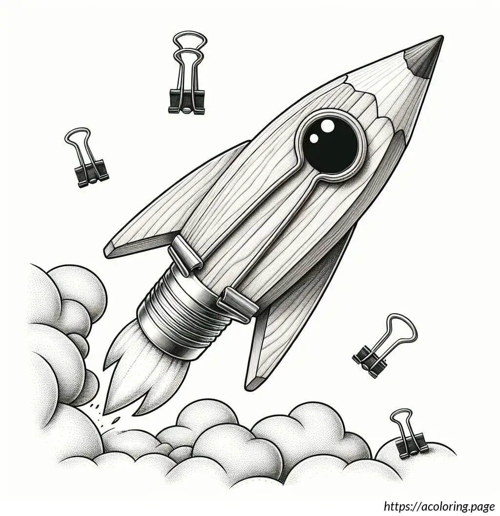 The image features a cartoon-style drawing of a creative interpretation of a rocket. This makeshift “rocket” appears to be constructed from a wooden clothespin acting as the body, with a pencil mounted on the back-end pointing backwards, metaphorically functioning as the propulsion system. The pencil emits a cloud, suggesting motion. The front of the rocket is adorned with a binder clip, symbolizing the nose or head, which has two small black eyes and a circular mouth, adding an anthromorphic character to the rocket.