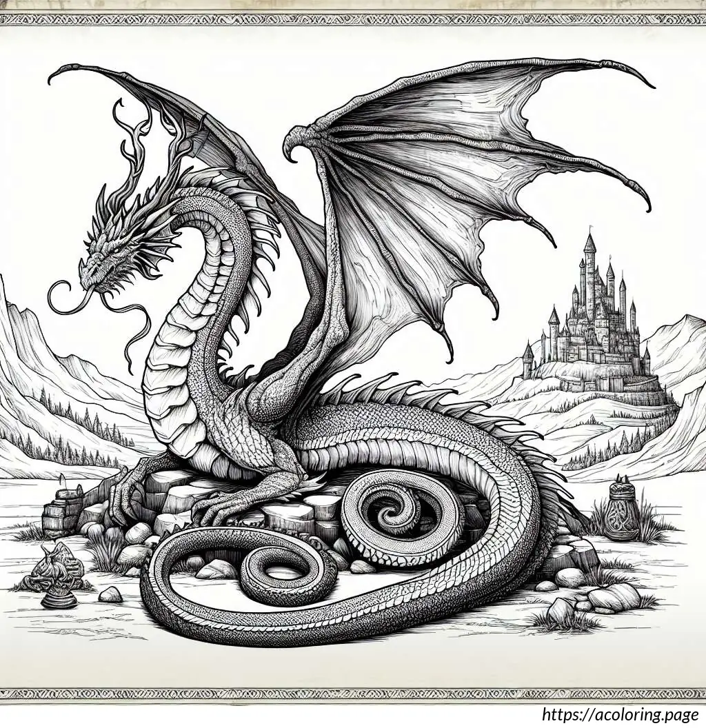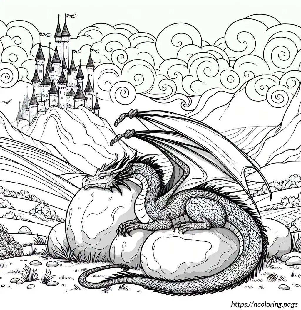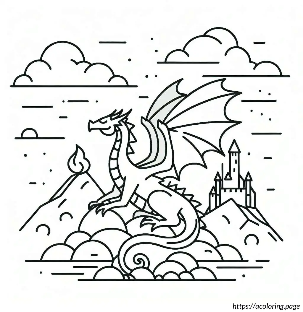 In the background, there are cloud-like, wavy lines in the sky which suggest movement or wind, adding a dynamic feel to the scene. Below the dragon, the landscape is rough, with large rocks and boulders cluttered around. Farther behind the dragon, a stylized, medieval castle can be seen, adding a fantastical, storybook element to the illustration.