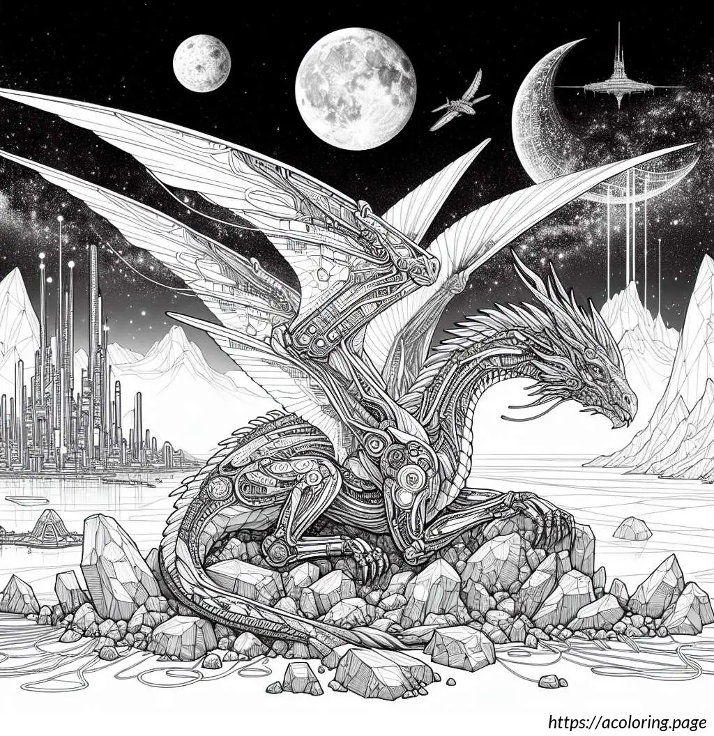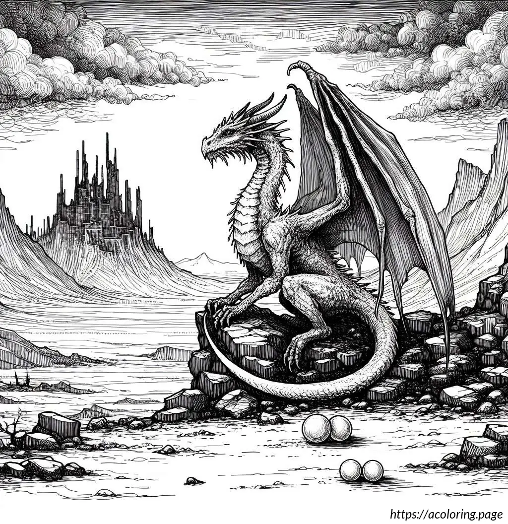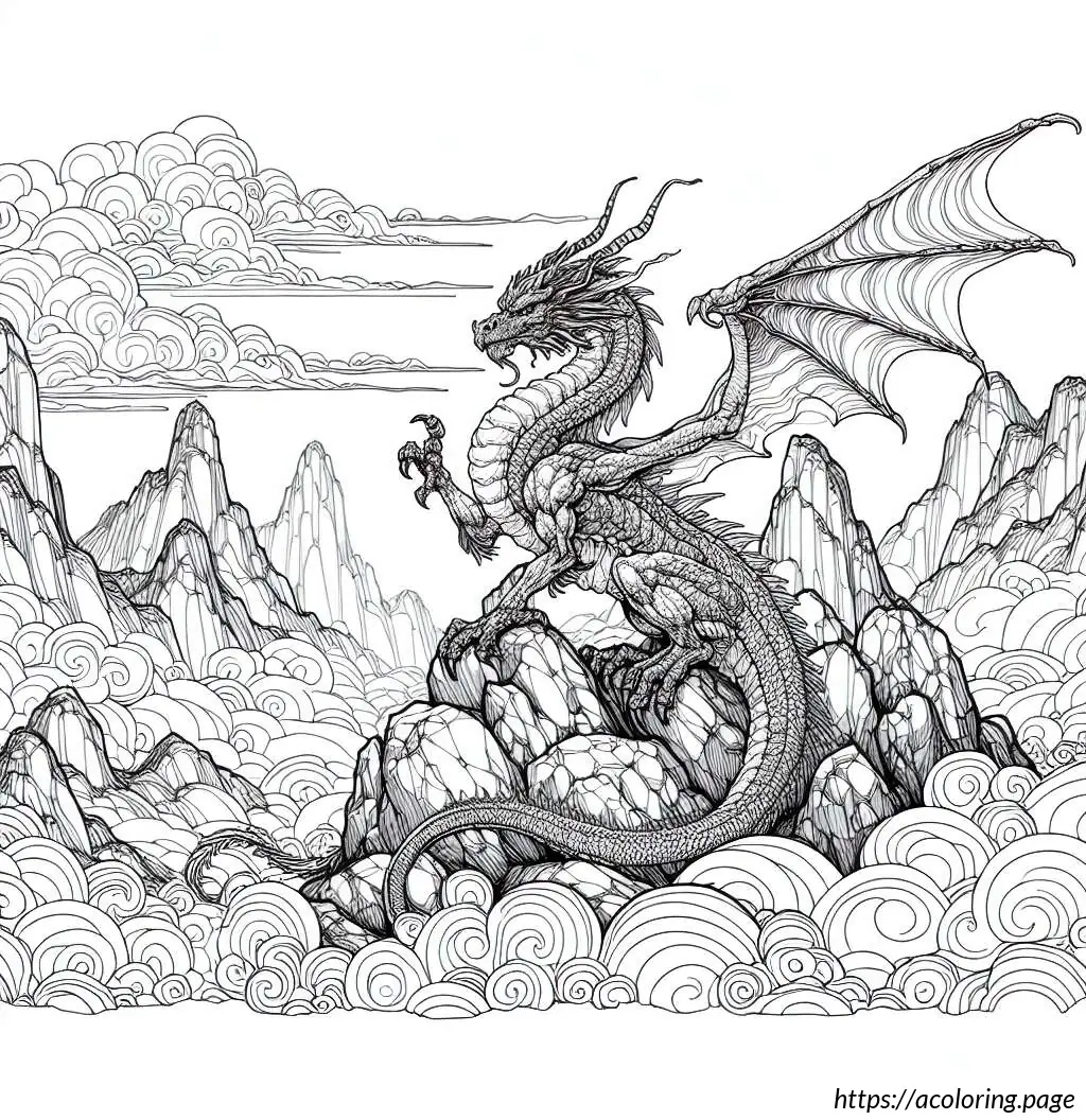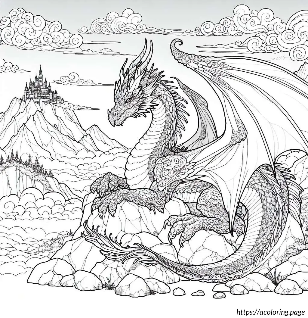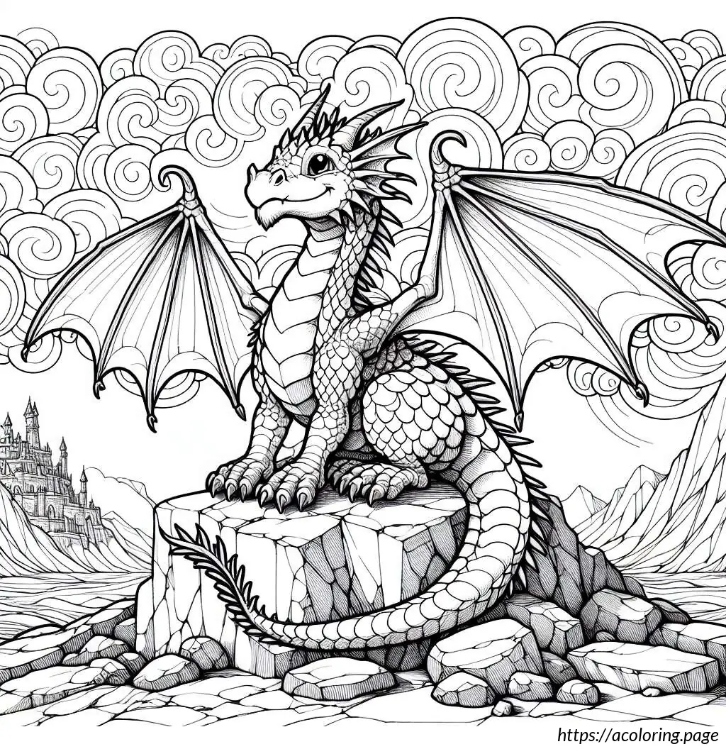 The image is a black and white line drawing suitable for coloring. It depicts a whimsical scene featuring a dragon perched atop a rocky terrain. The dragon has an expressive face, pointed ears, spiked crest along the head and neck, large, bat-like wings, and a long sinuous tail. It appears animated and friendly rather than fearsome.