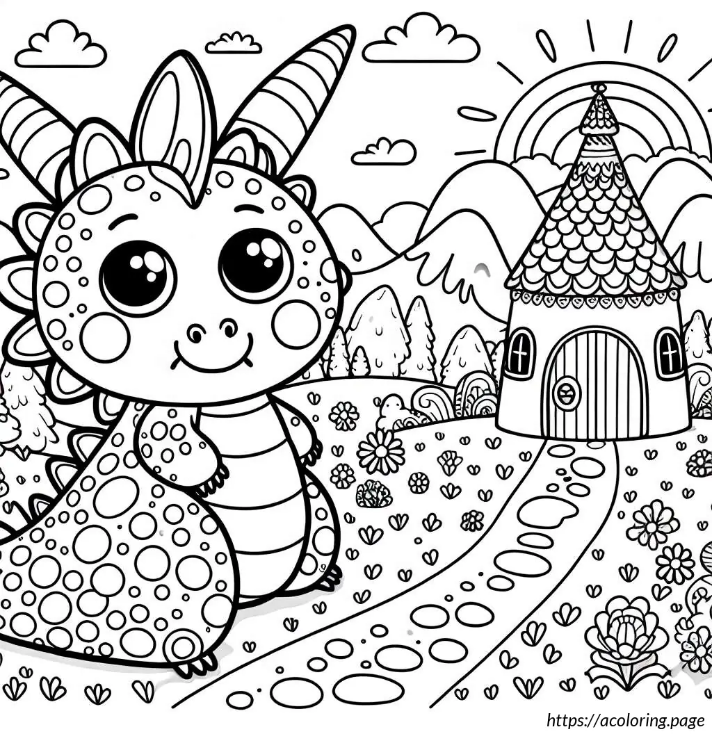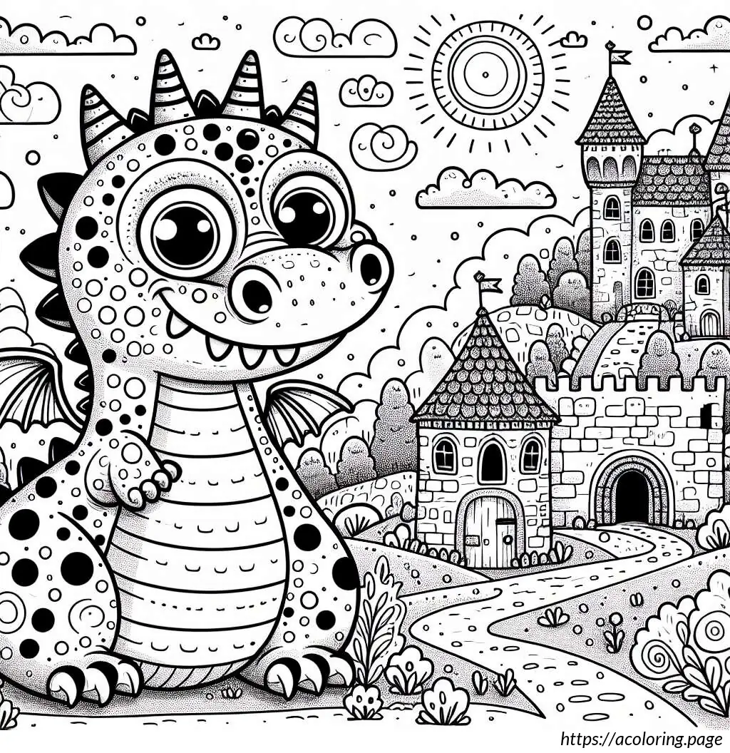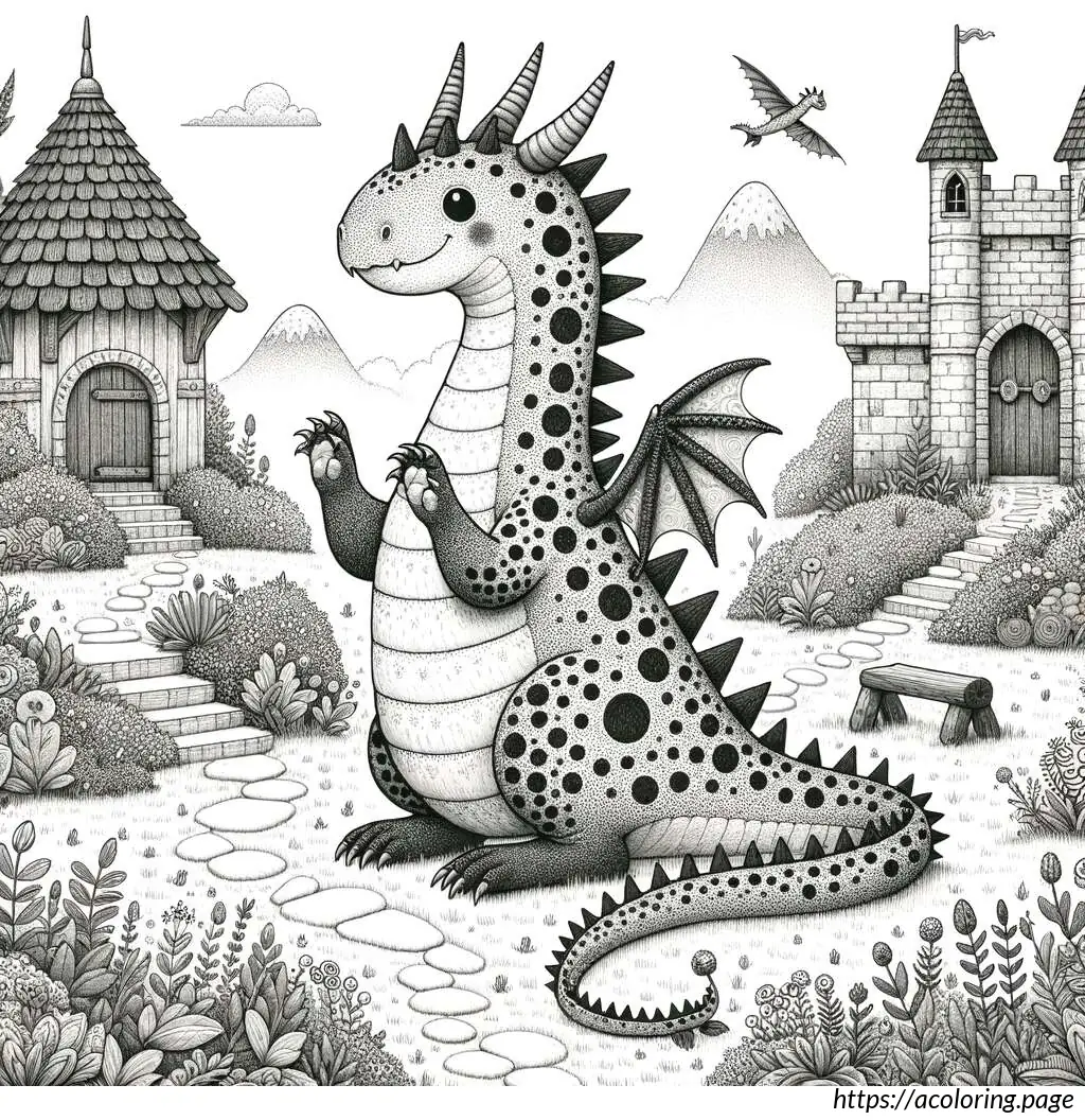 The image features a whimsical and stylized drawing of a dragon in a fairytale setting. The dragon, occupying the left side of the image, appears friendly and cartoonish with large, googly eyes and a wide nose. It has numerous spiky protrusions along its back and tail, and its skin is adorned with multiple circular spots. The dragon’s body has various curves and overlapping segments, suggesting a soft, segmented texture.