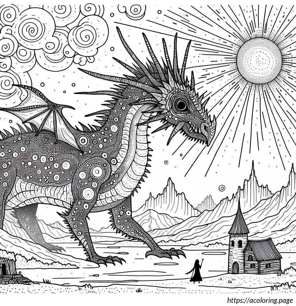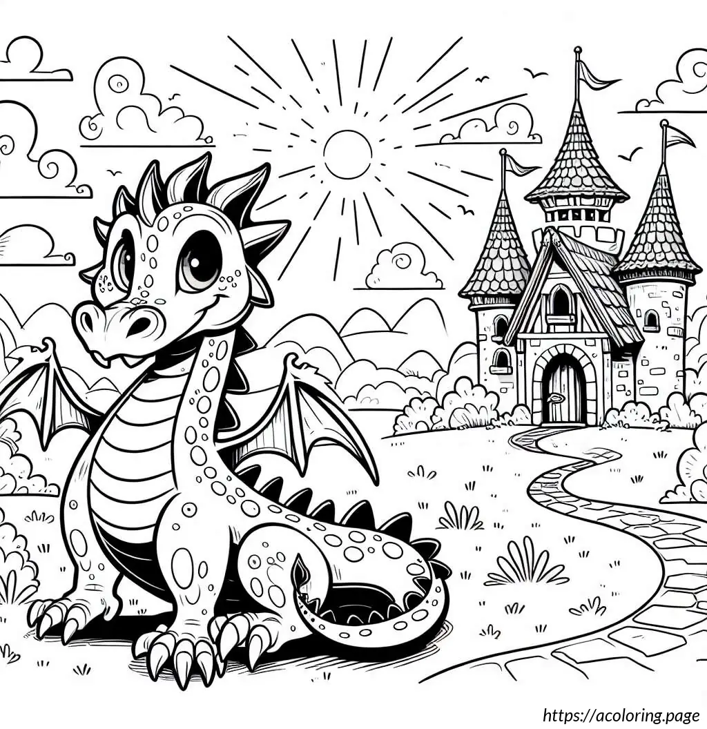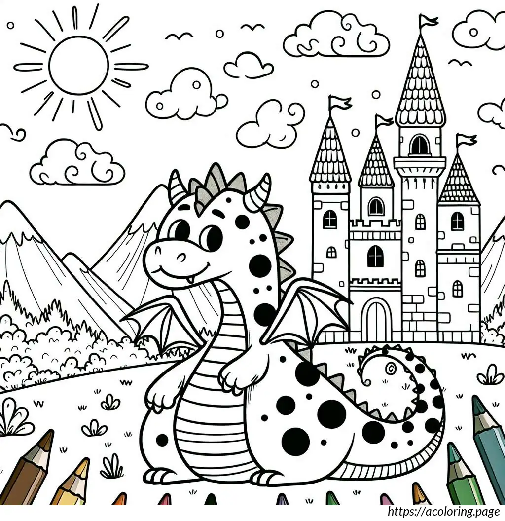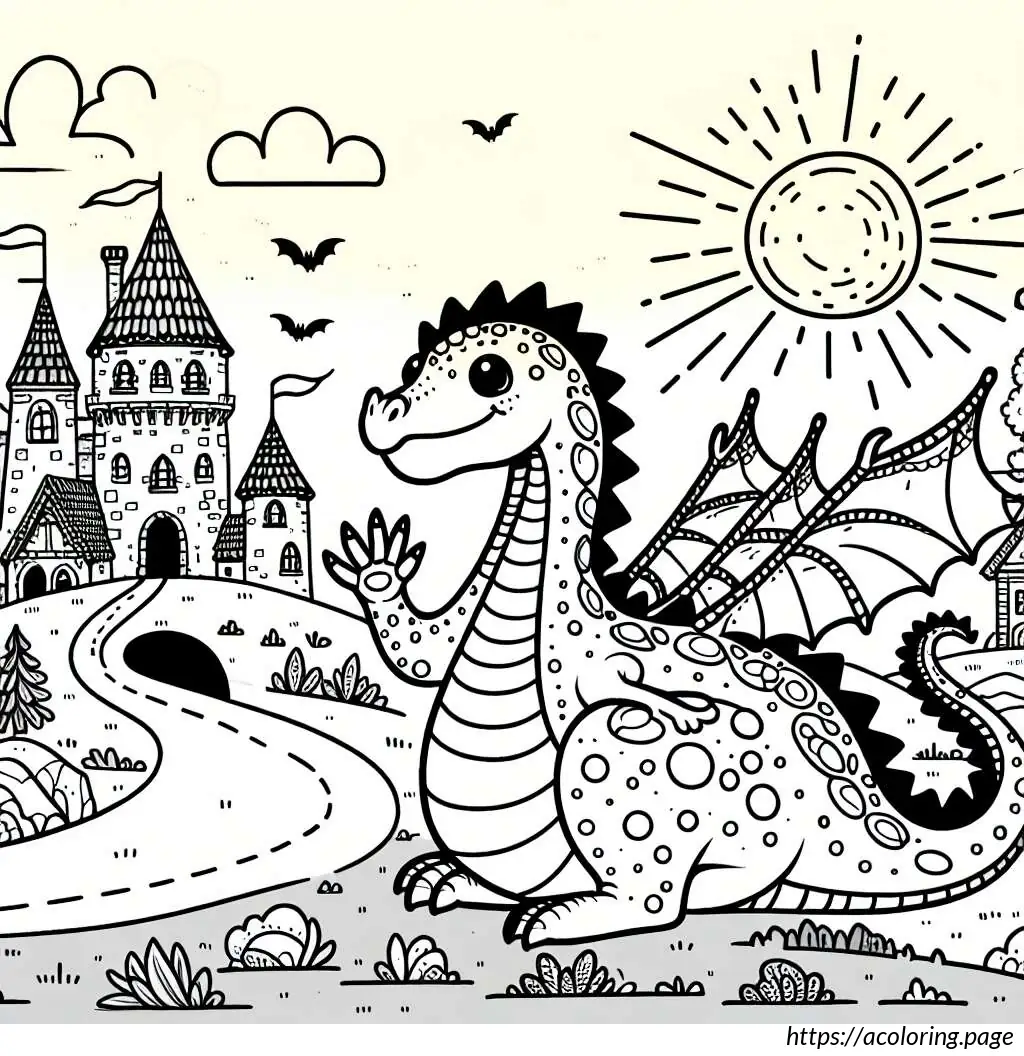 The image features a whimsical and stylized drawing of a dragon in a fairytale setting. The dragon, occupying the left side of the image, appears friendly and cartoonish with large, googly eyes and a wide nose. It has numerous spiky protrusions along its back and tail, and its skin is adorned with multiple circular spots. The dragon’s body has various curves and overlapping segments, suggesting a soft, segmented texture.