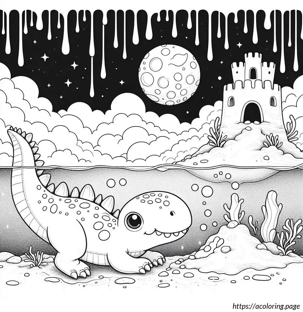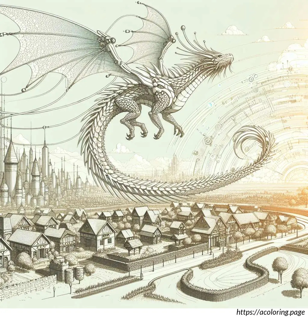 The overall style of the drawing is line-based, suitable for coloring, and employs a simple and playful design that could appeal to children. The setting and elements suggest that it could be a scene from a children’s storybook.