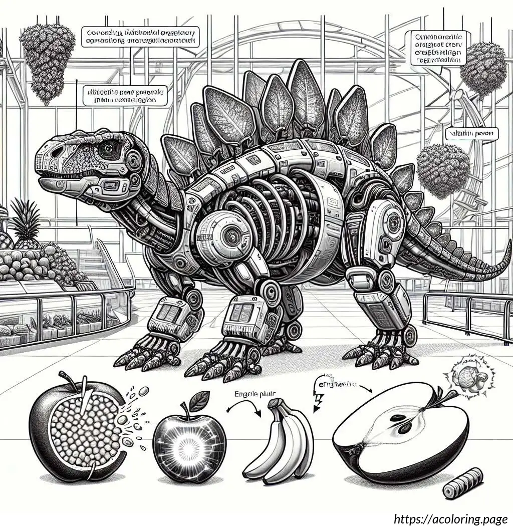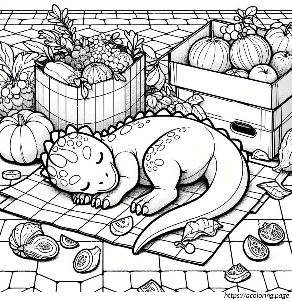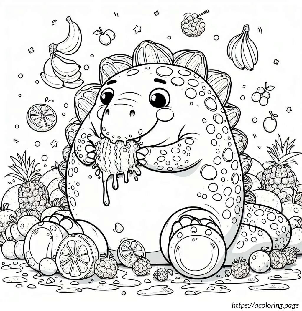 The background and surroundings are simple, with the focus mainly on the dinosaur and the array of fruits, adding a whimsical charm to the depiction. The entire drawing is done in black and white, using bold lines and clear, simple strokes, making it visually striking and easy to interpret.