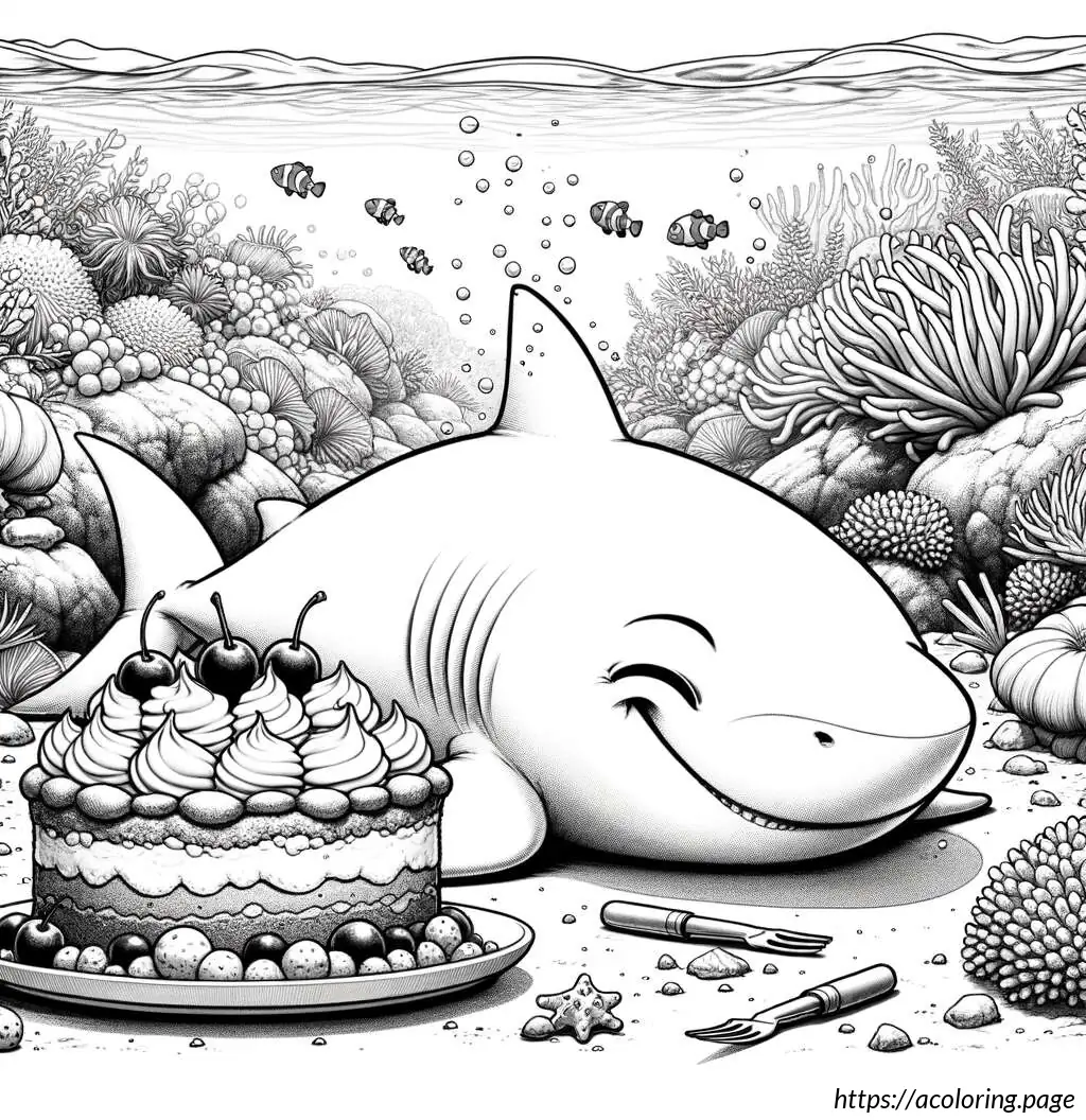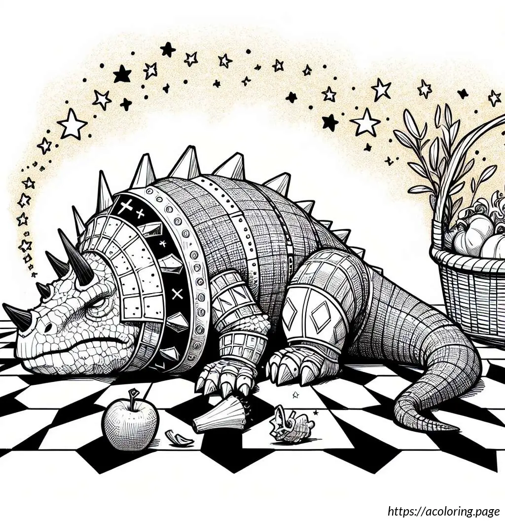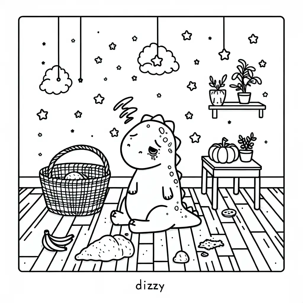 The background and surroundings are simple, with the focus mainly on the dinosaur and the array of fruits, adding a whimsical charm to the depiction. The entire drawing is done in black and white, using bold lines and clear, simple strokes, making it visually striking and easy to interpret.
