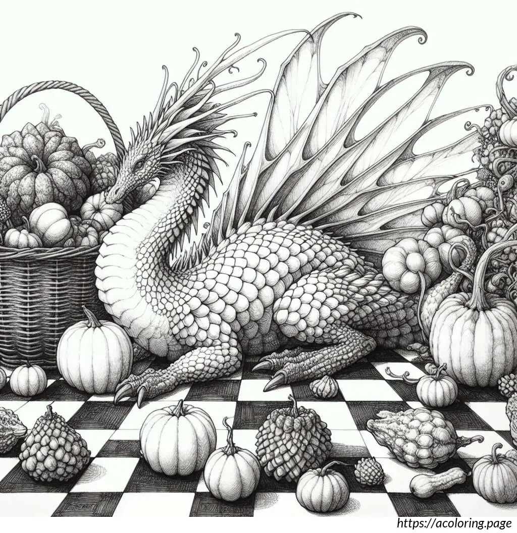 Directly in front of the dinosaur, there is a half-peeled banana and a croissant, adding to the theme of food indulgence. On one side, there’s an open box with a large pumpkin or squash inside. To the dinosaur’s right is a basket overflowing with an assortment of other fruits like bananas, apples, and perhaps berries, emphasizing the abundance of food in the scene.