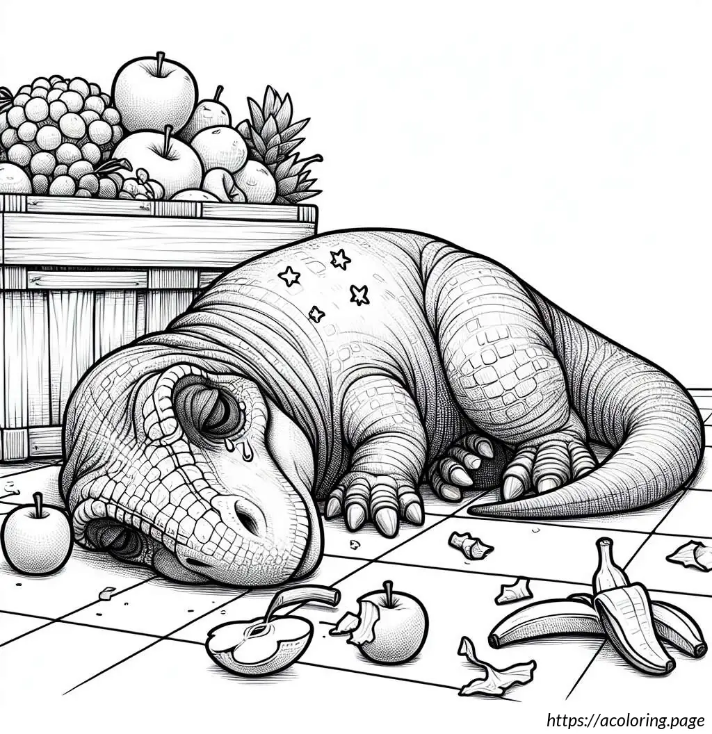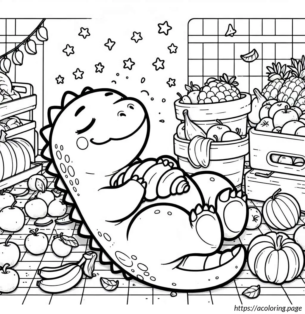 This image depicts a playful and imaginative scene featuring a cartoon-style dinosaur in an indoor setting, most likely a kitchen due to the tiles on the floor. The dinosaur is lying on its side, appearing to be blissfully overwhelmed by a variety of fruits. Its expression is content and dreamy, indicated by closed eyes and star shapes, suggesting enjoyment or perhaps a food coma.