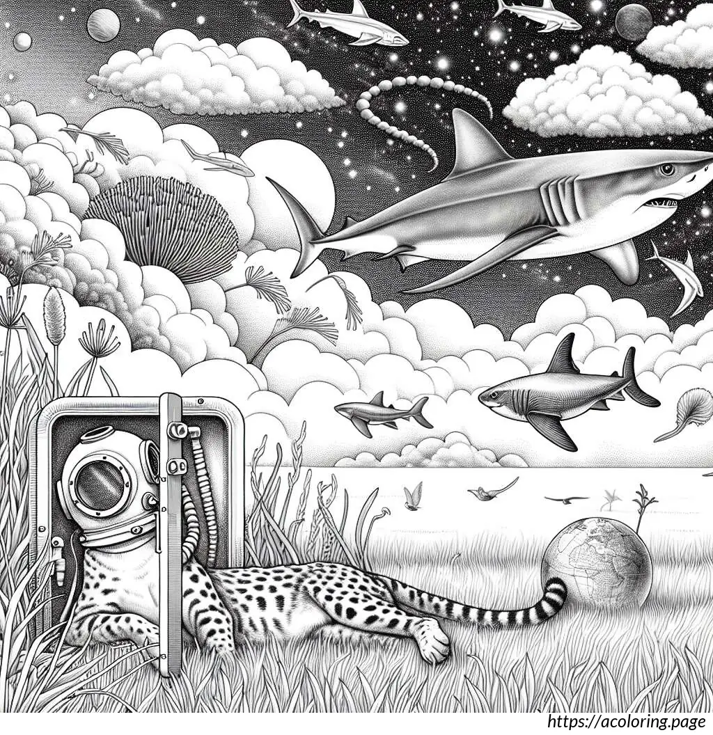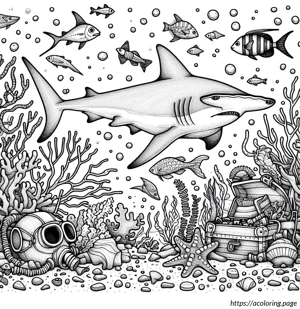 This image illustrates an underwater scene, designed in a simple black and white line drawing style. At the center, there is a large hammerhead shark swimming gracefully through the water. Around the shark are several elements that depict a lively ocean floor: