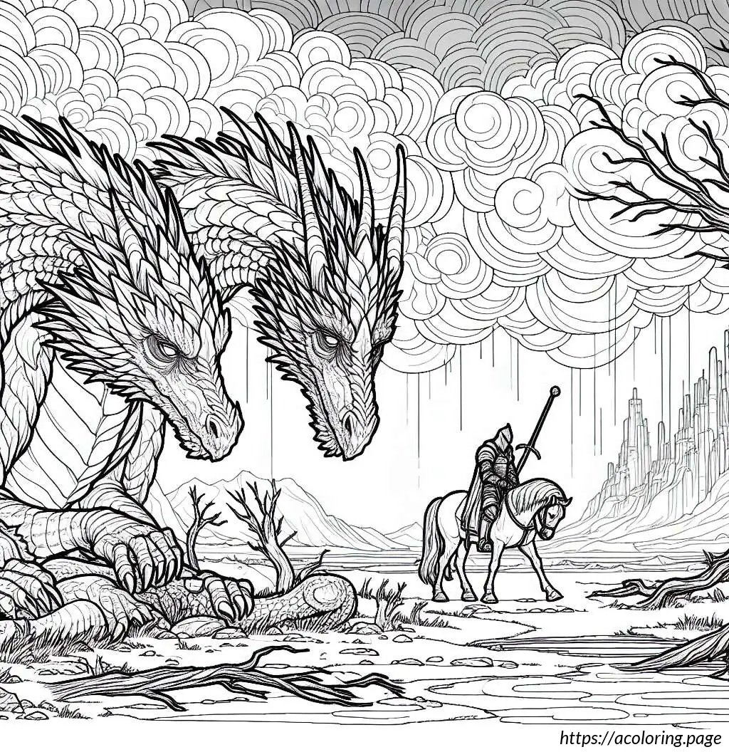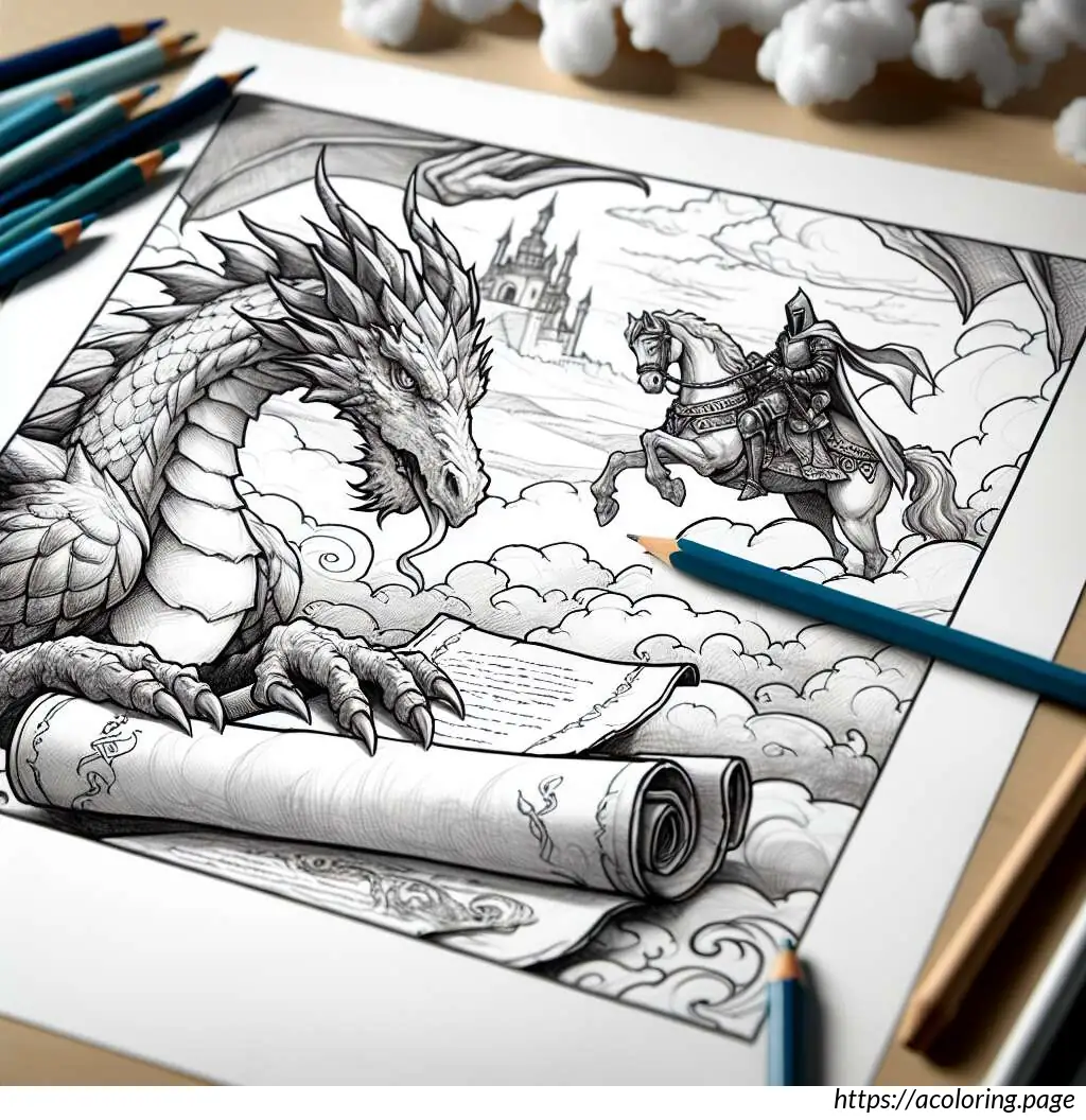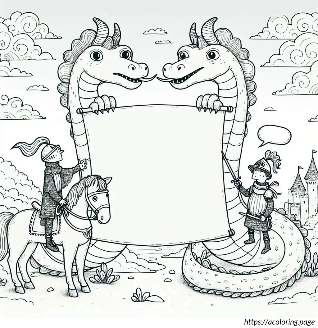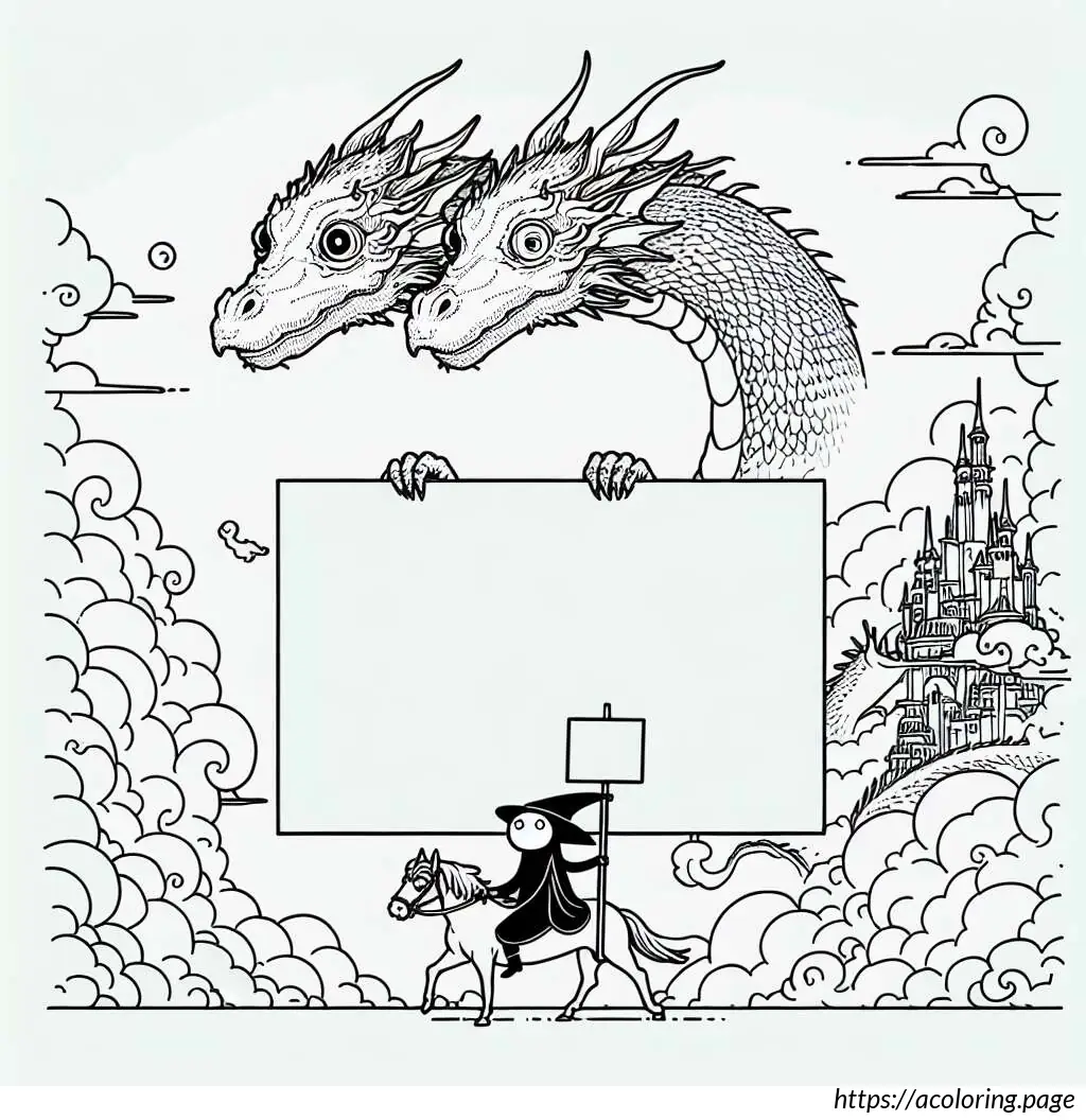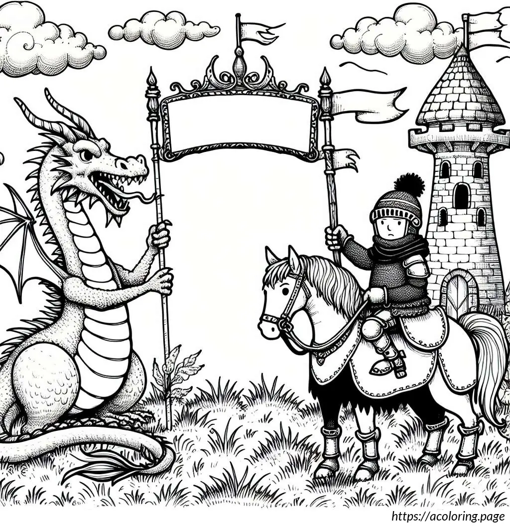 Blank Banner: Between the dragon and a figure on a horse, there is a large, blank medieval-style banner. The banner has a fancy outline with decorative swirls and a tail that curves upward.