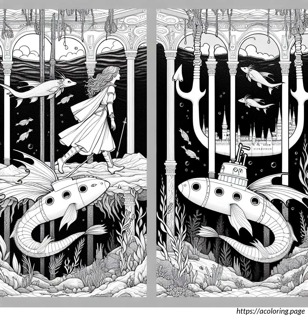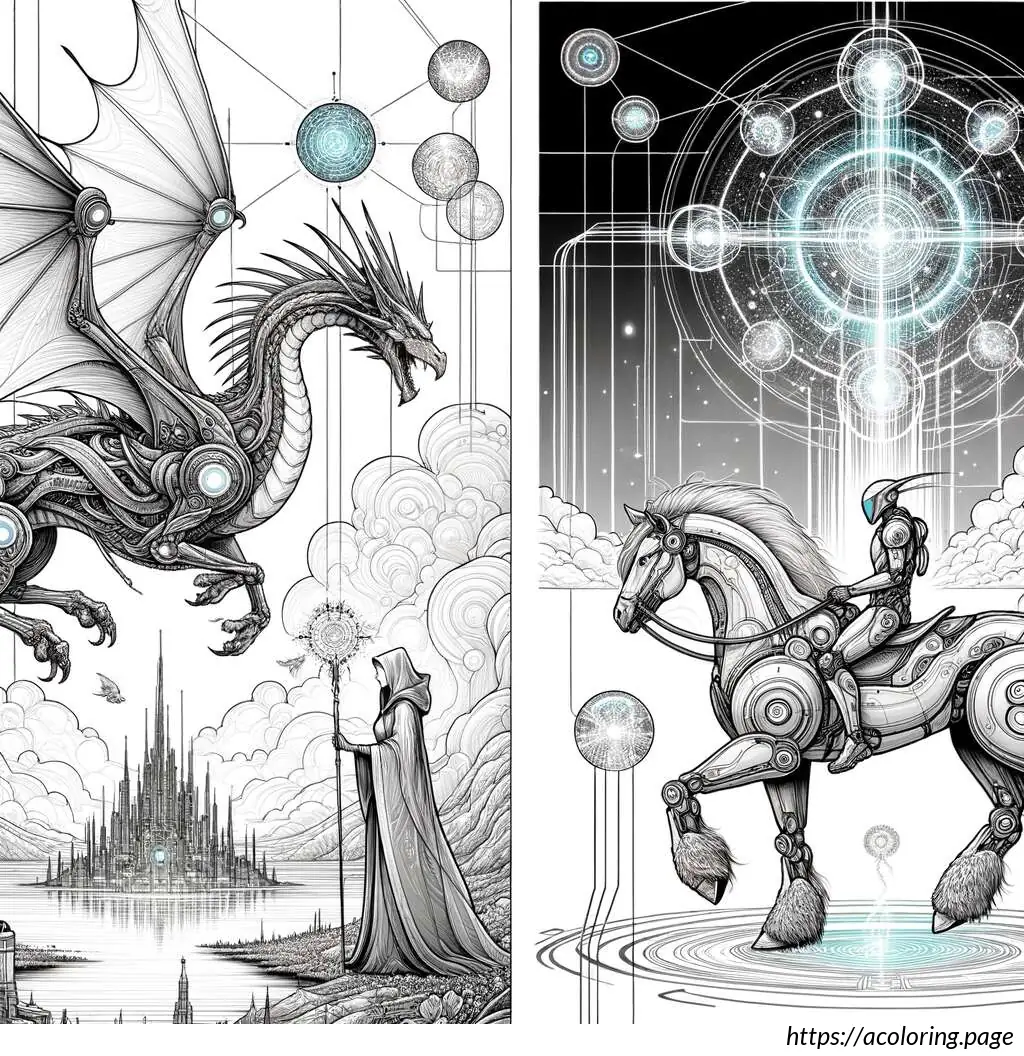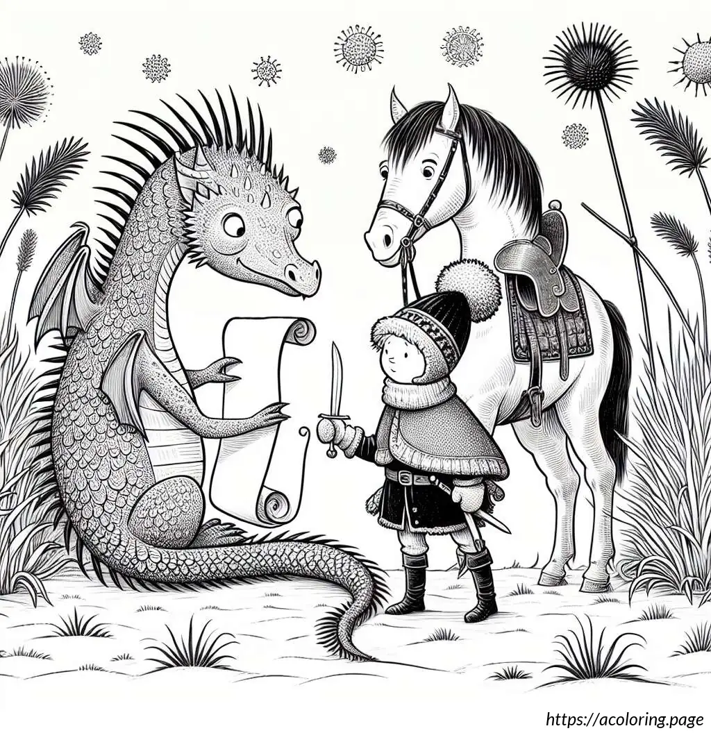 The image is a line drawing that features a fantasy theme. There are three primary subjects: