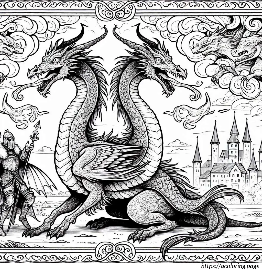 Two-Headed Dragon: On the left side of the image, there’s a mythical two-headed dragon sitting on the ground. Each head has a set of horns and a slightly surprised or shocked expression. The dragon’s two tails curl along its body, with pointed ends.