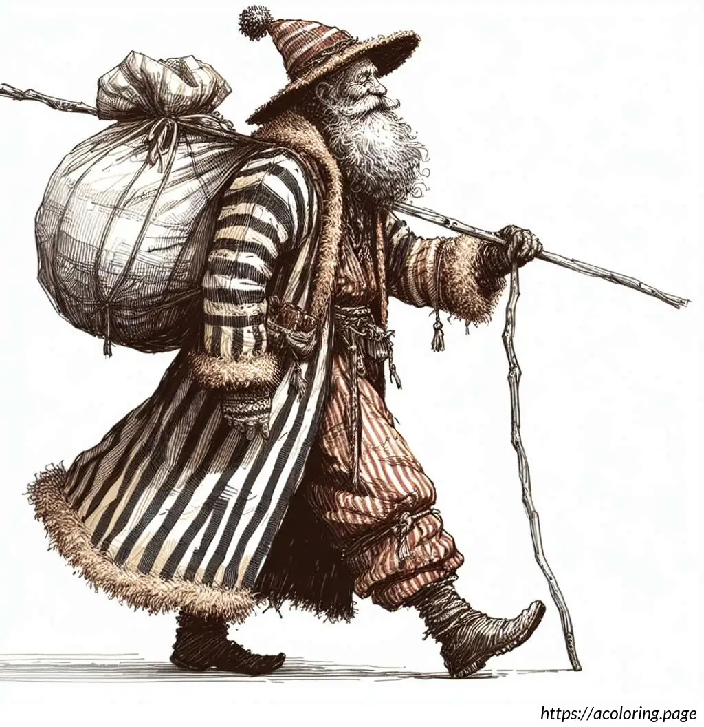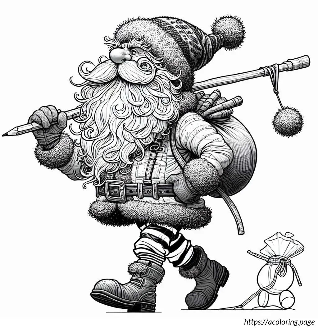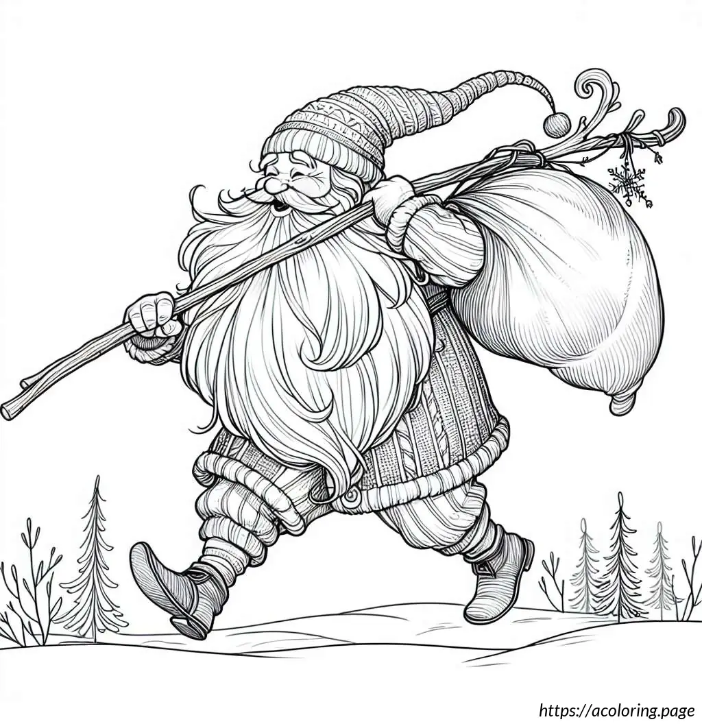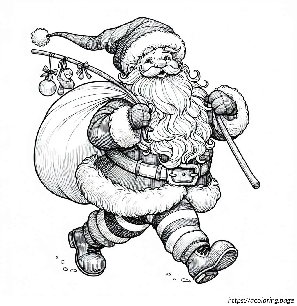 This image is a black and white line drawing of a cartoon-like Santa Claus. He is depicted in a joyful pose, tiptoeing to the left. Santa is wearing his traditional outfit consisting of a puffy jacket and pants with wide horizontal stripes, boots, gloves, and a Santa hat with a fluffy pom-pom at the end. He has a full, bushy beard and a smiling facial expression. Over his shoulder, he carries a large sack, held at the end of a long, straight pole, and the sack appears to be filled, as it is bulging and tied at the top. The drawing has a simple, cheerful style suitable for coloring activities.
