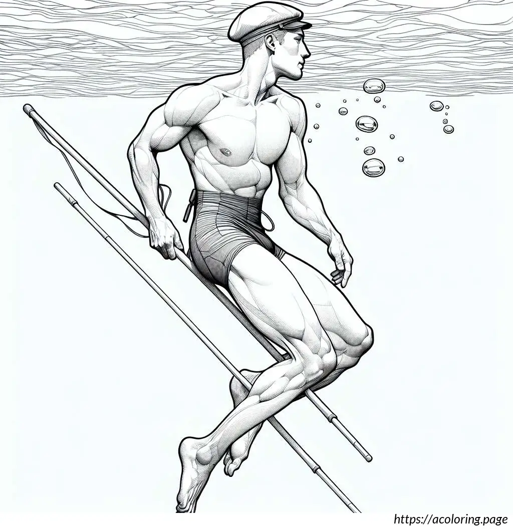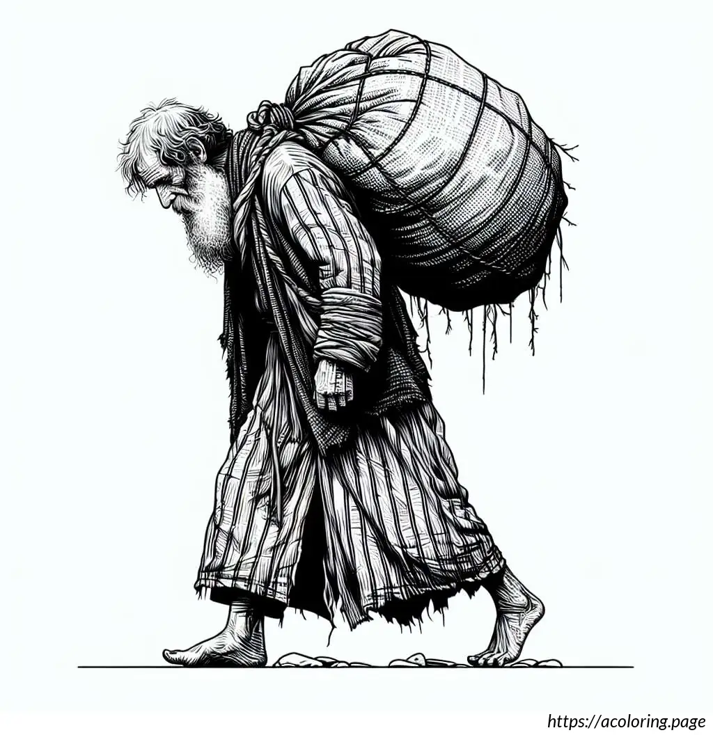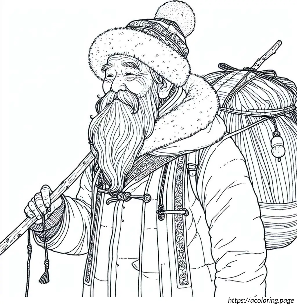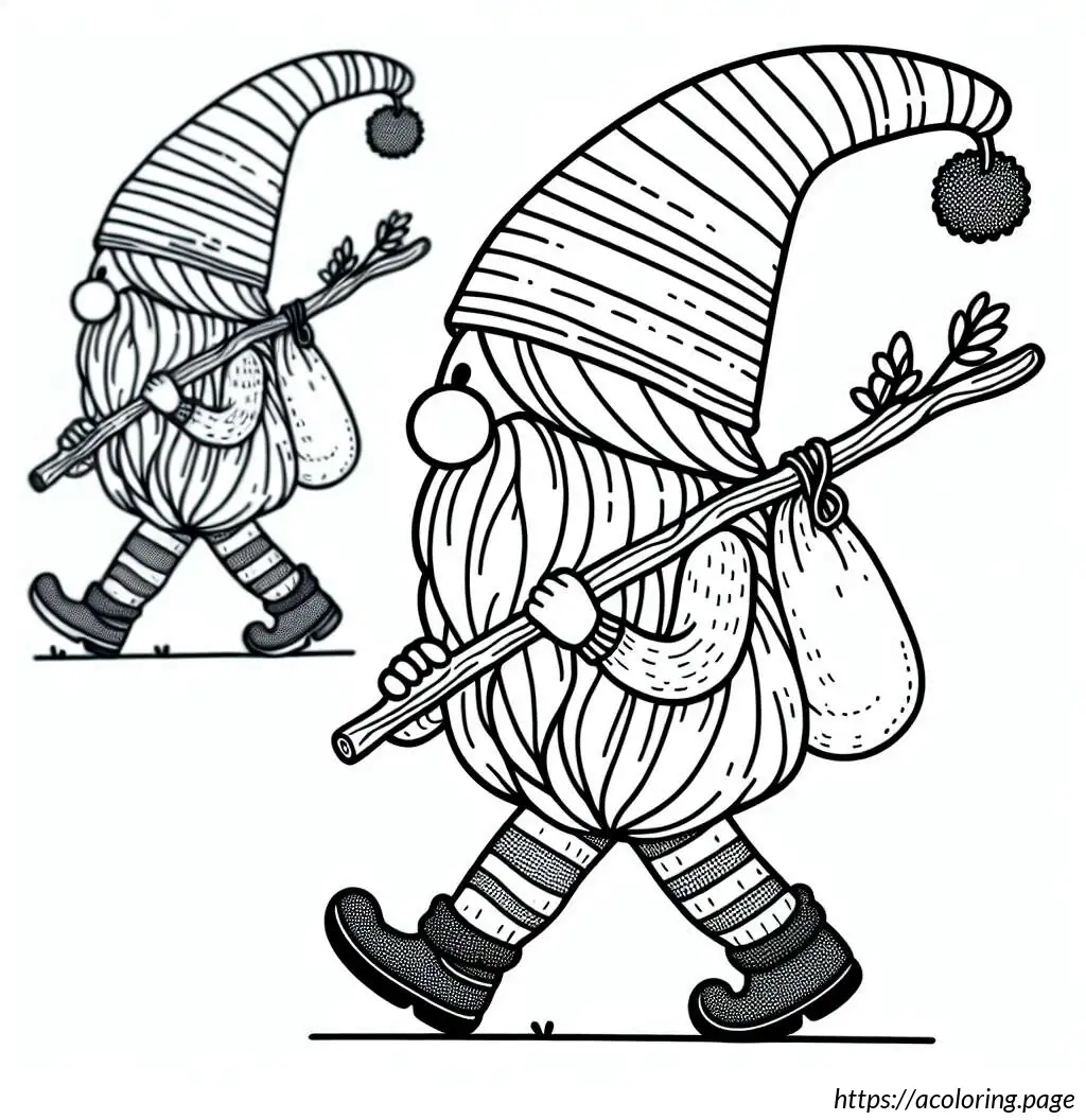 This image is a black and white line drawing of a cartoon-like Santa Claus. He is depicted in a joyful pose, tiptoeing to the left. Santa is wearing his traditional outfit consisting of a puffy jacket and pants with wide horizontal stripes, boots, gloves, and a Santa hat with a fluffy pom-pom at the end. He has a full, bushy beard and a smiling facial expression. Over his shoulder, he carries a large sack, held at the end of a long, straight pole, and the sack appears to be filled, as it is bulging and tied at the top. The drawing has a simple, cheerful style suitable for coloring activities.
