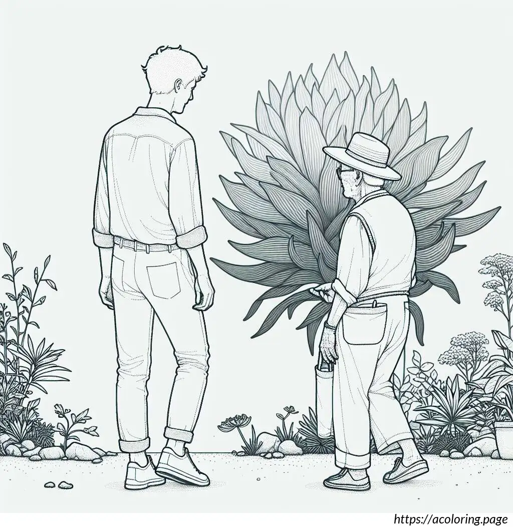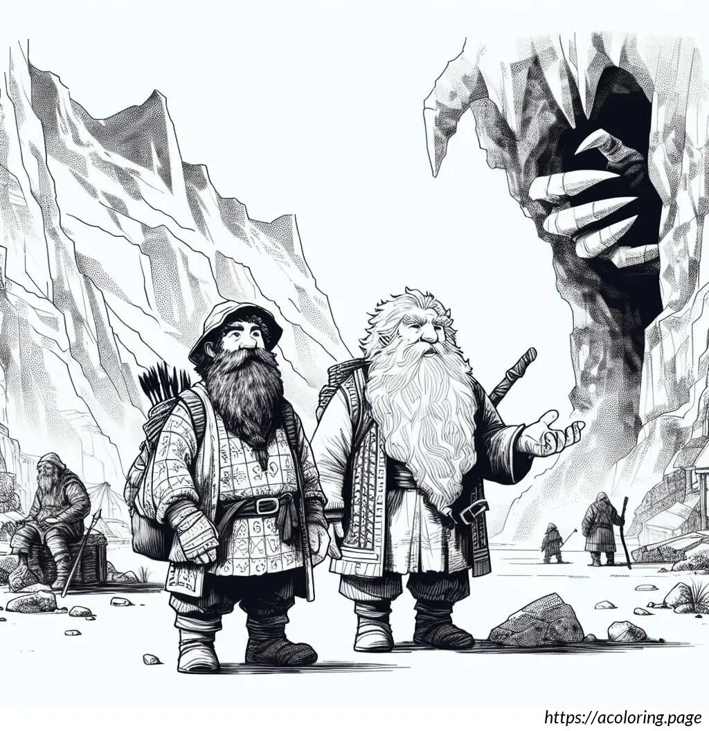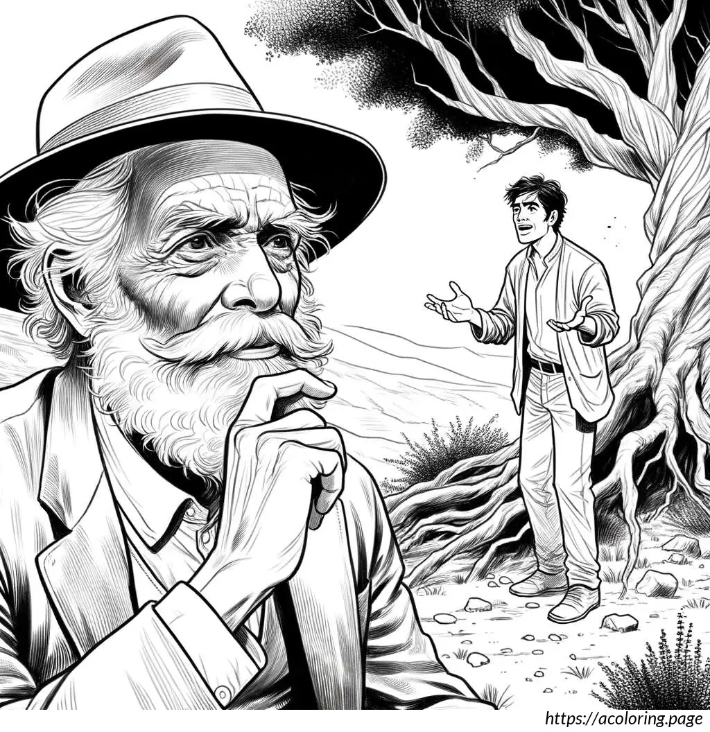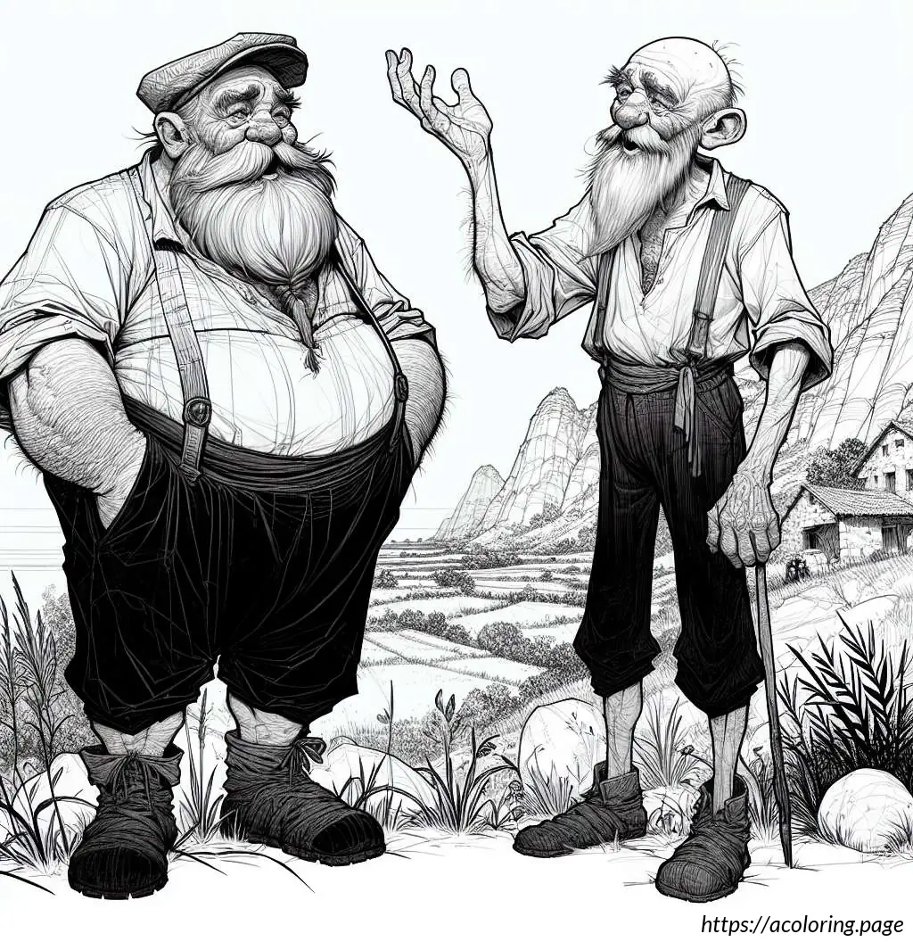The image depicts a black and white line drawing that seems suitable for coloring activities. It features two older male characters outdoors. The character in the foreground is wearing a hat and is stroking his beard thoughtfully with one hand, while his other hand is held up as if gesturing or pointing. This character appears perplexed or curious. The other character, standing slightly behind, seems to be talking or explaining something, as indicated by his open mouth and his hands in a gesturing position.