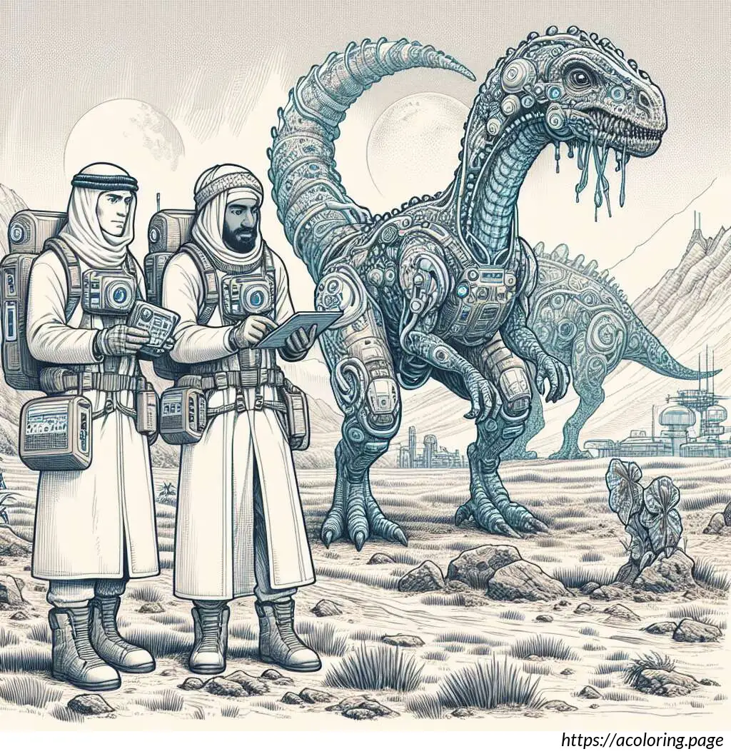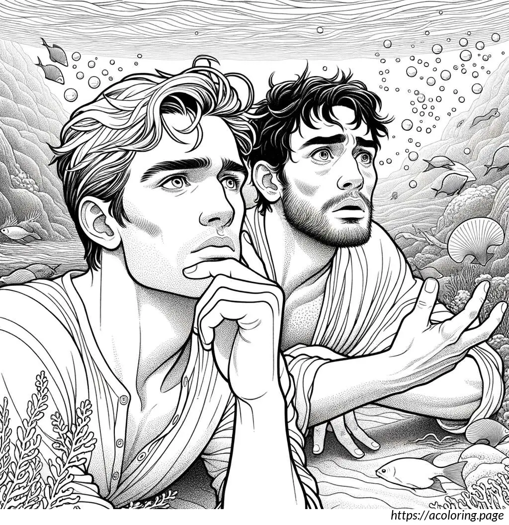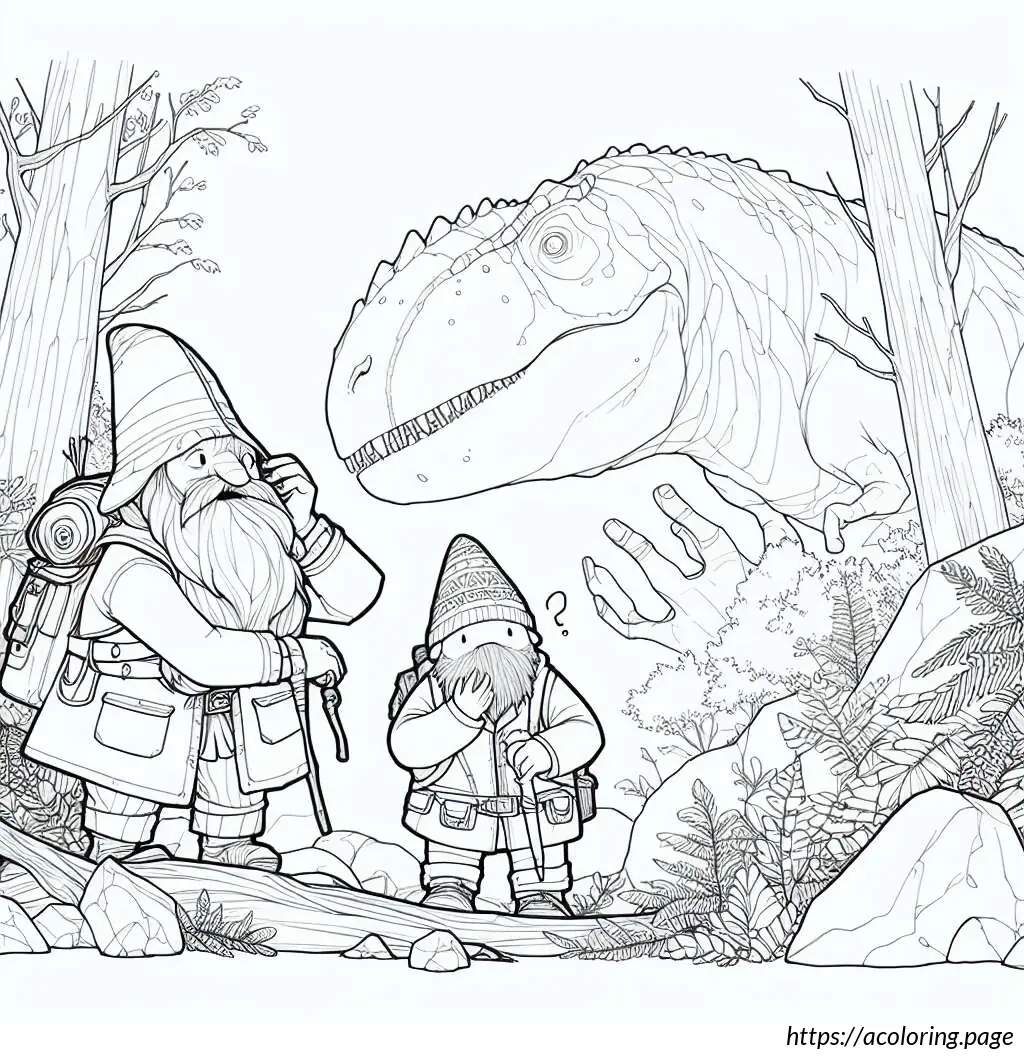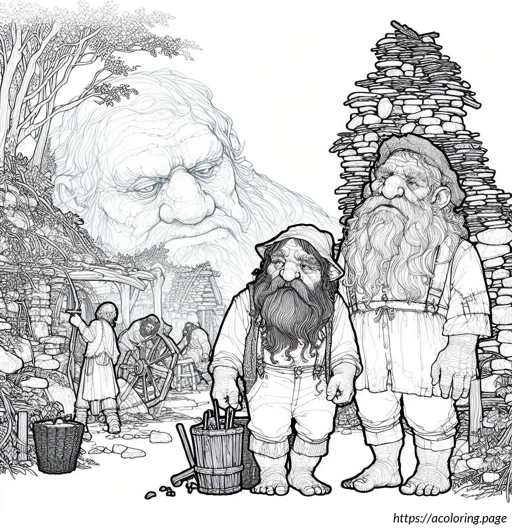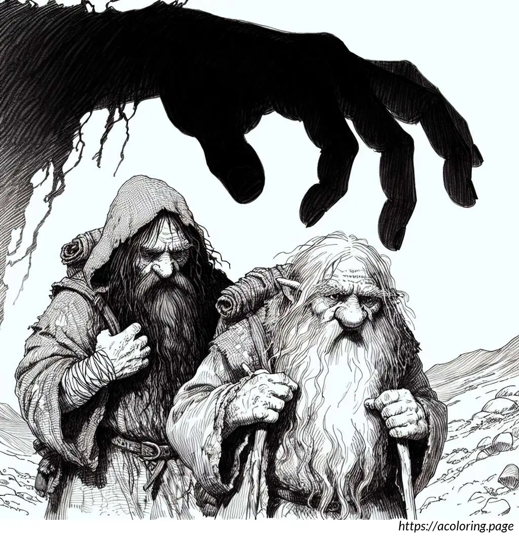 The image depicts a black and white line drawing that seems suitable for coloring activities. It features two older male characters outdoors. The character in the foreground is wearing a hat and is stroking his beard thoughtfully with one hand, while his other hand is held up as if gesturing or pointing. This character appears perplexed or curious. The other character, standing slightly behind, seems to be talking or explaining something, as indicated by his open mouth and his hands in a gesturing position.