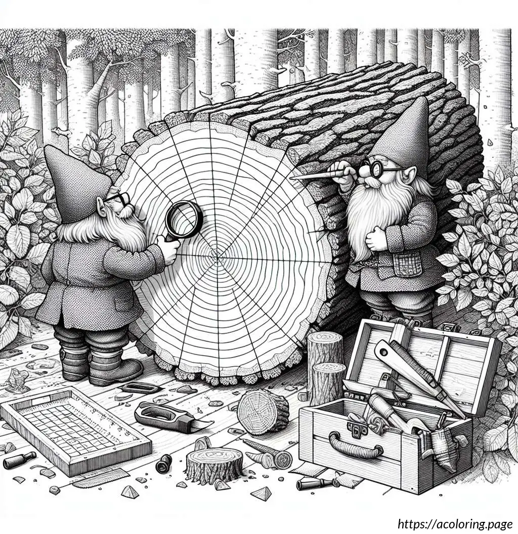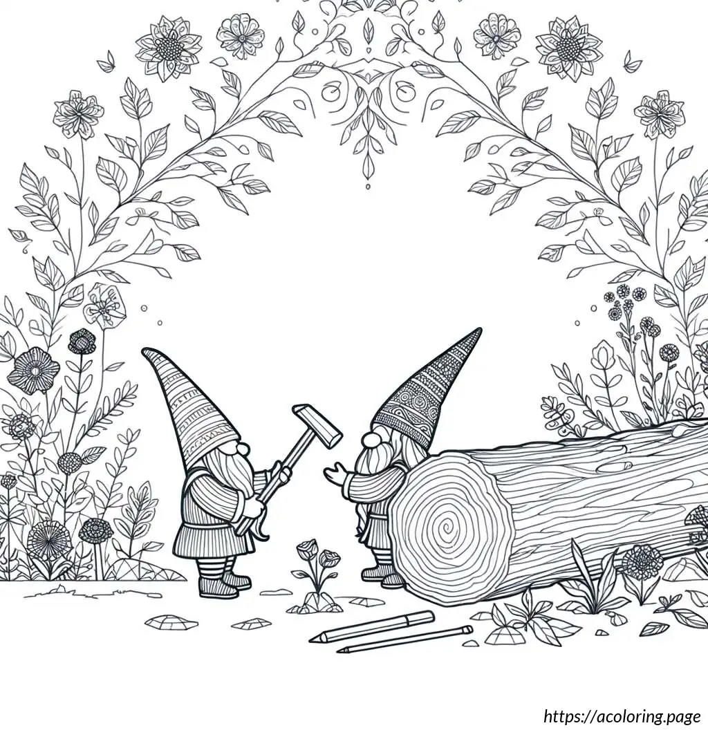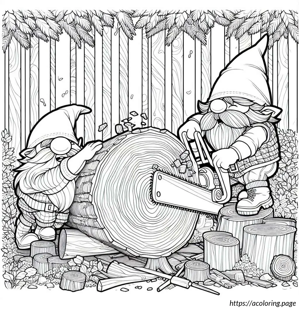 This image is a black and white line art illustration designed for coloring. It depicts two gnome-like characters in a forest setting, engaging in a log cutting activity. The gnome on the left wears a helmet and is holding a circular saw, which he is using to cut a long log. The other gnome, standing on the right, also wears a helmet and is holding the log to stabilize it. Both characters have bushy beards and are dressed in typical gnome attire, including large boots and pointed hats.