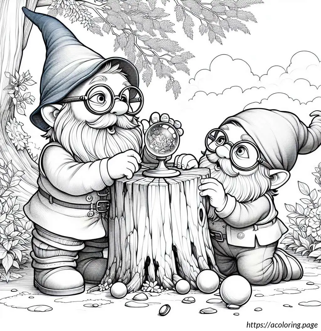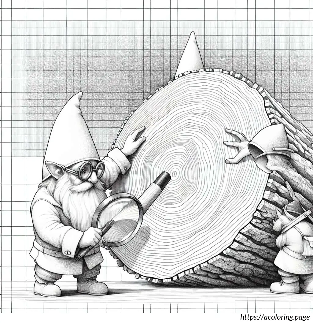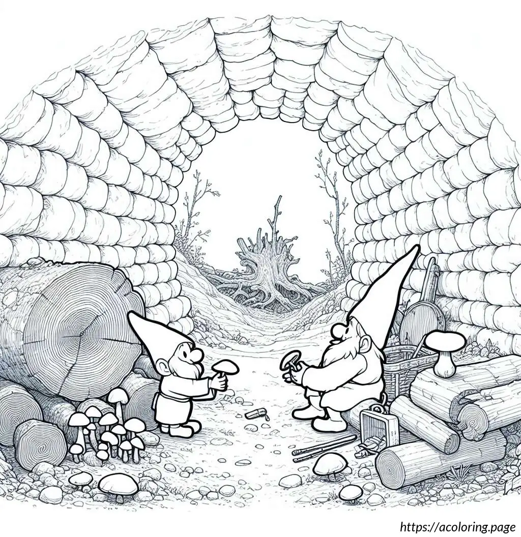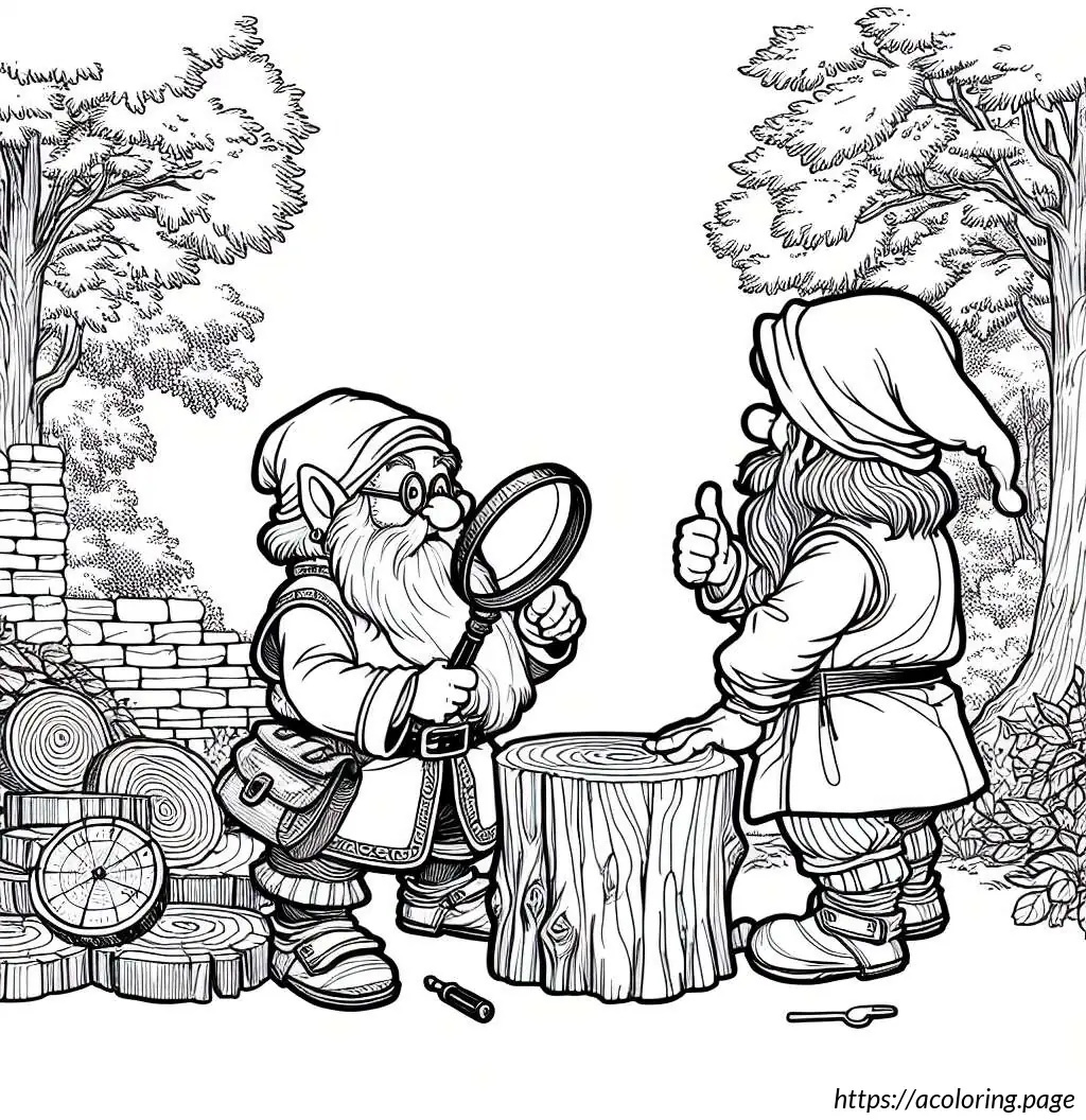 This image is a black and white line art illustration designed for coloring. It depicts two gnome-like characters in a forest setting, engaging in a log cutting activity. The gnome on the left wears a helmet and is holding a circular saw, which he is using to cut a long log. The other gnome, standing on the right, also wears a helmet and is holding the log to stabilize it. Both characters have bushy beards and are dressed in typical gnome attire, including large boots and pointed hats.