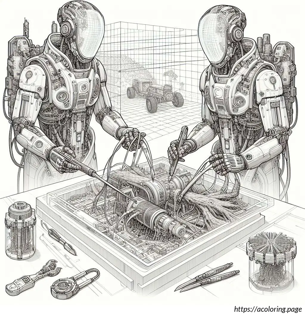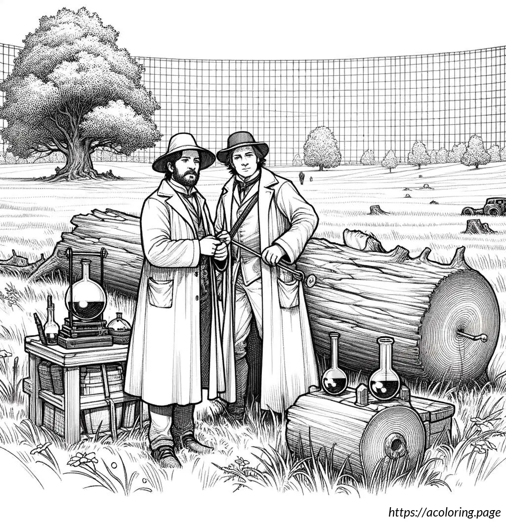 The background features forest elements like bushes and tree stumps, indicating an outdoor environment. There is also a pattern of vertical lines, suggesting a fence or a barrier in the background. The overall scene is presented in a playful and cartoonish style, making it suitable for children’s coloring activities.