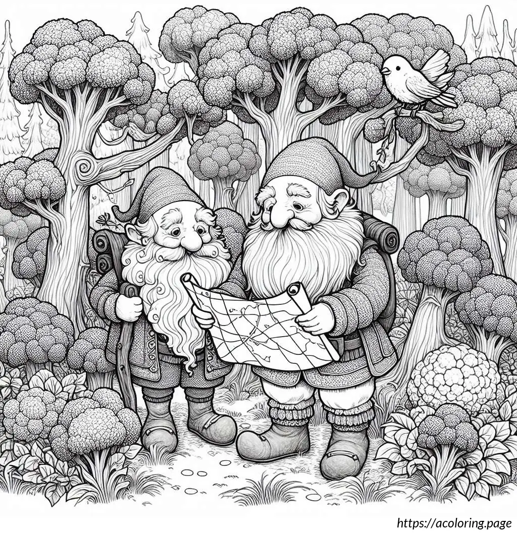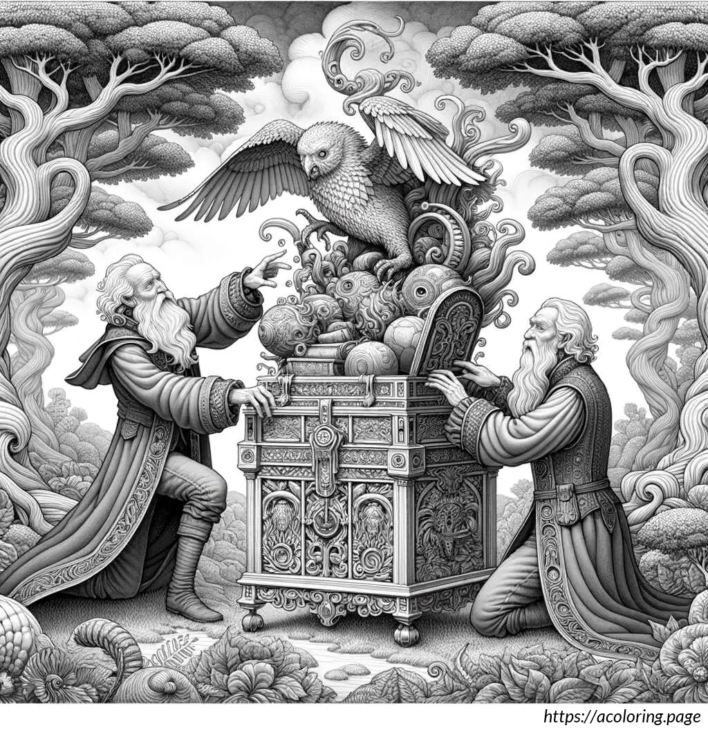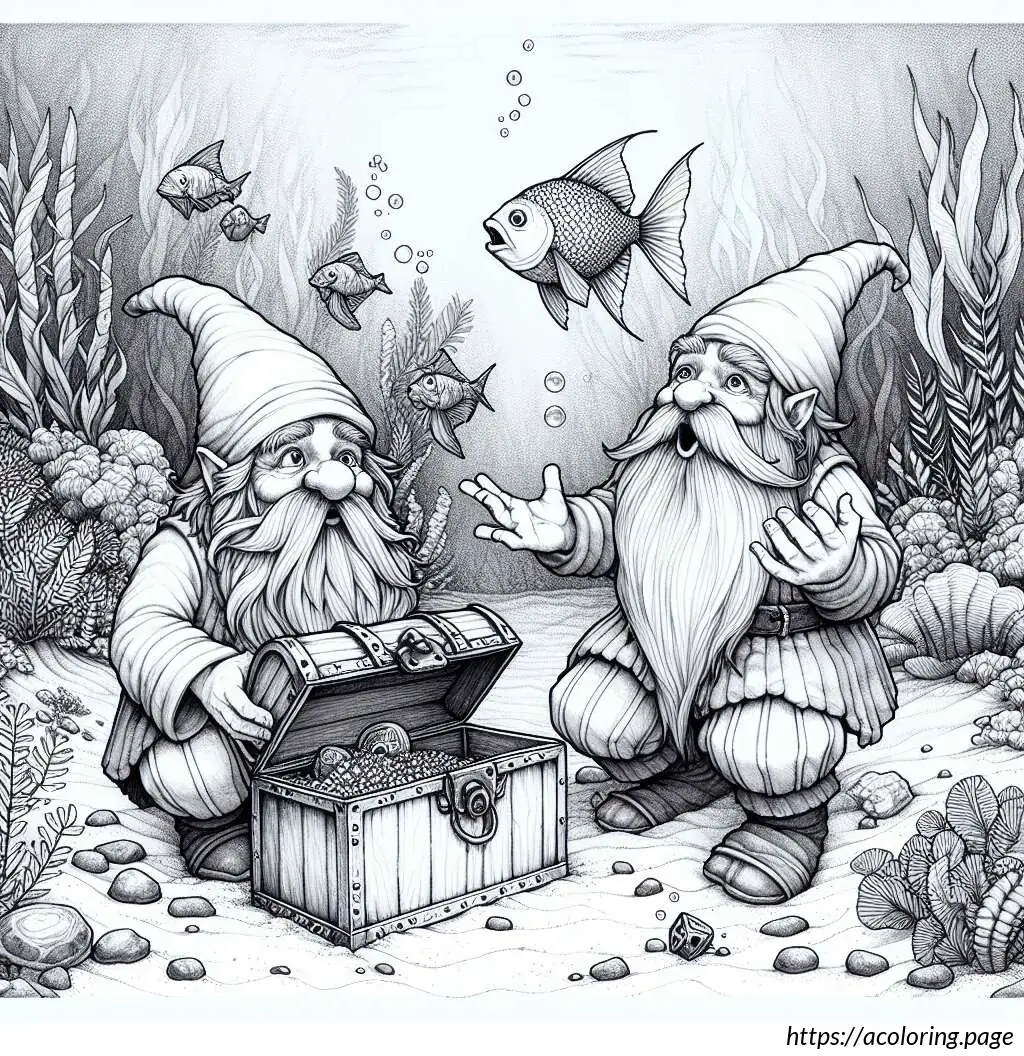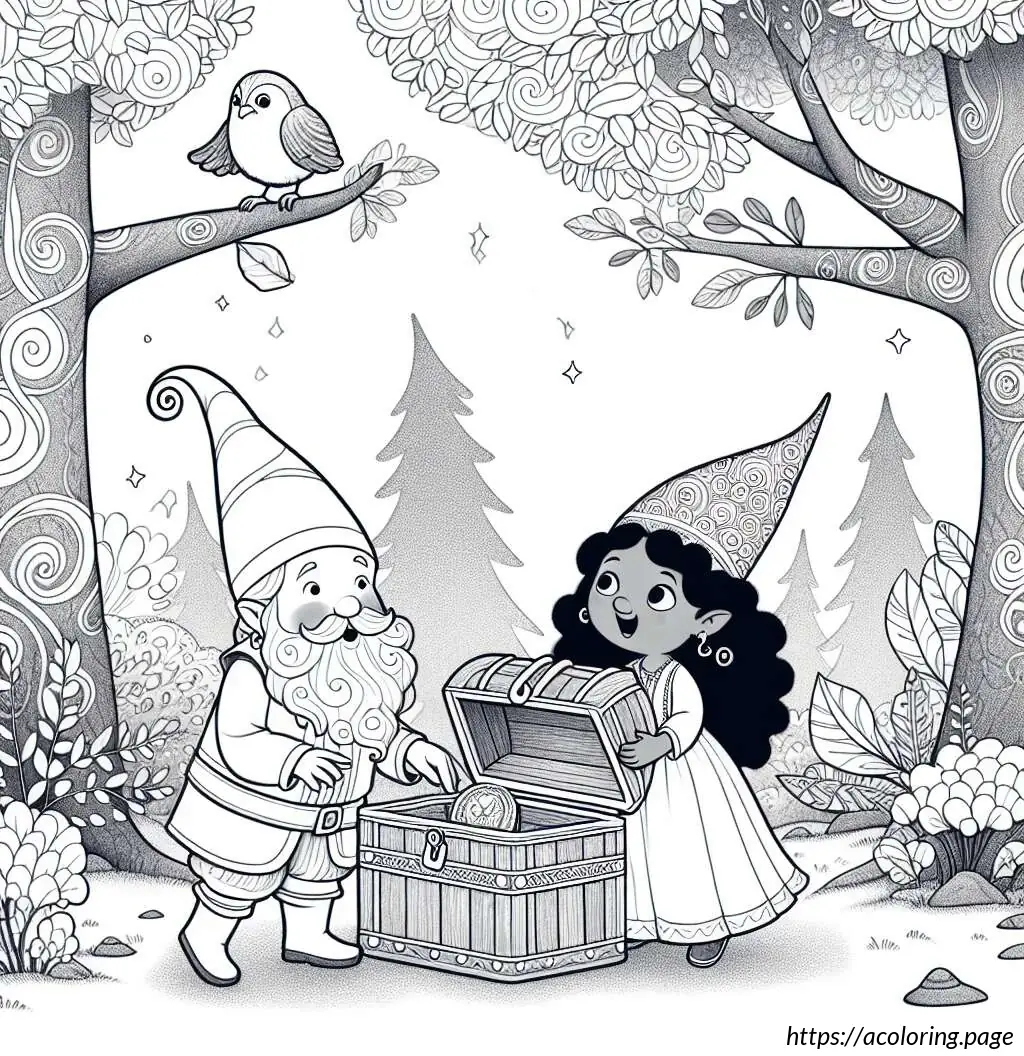 The image is a line art drawing suitable for coloring. It depicts two gnome-like characters examining a chest in a forest setting. The gnomes are dressed in traditional attire with pointy hats and beards. The first gnome, to the left, is kneeling down and opening the chest, looking surprised at its contents. The second gnome, to the right, stands beside him, looking curious and excited about what’s inside the chest. Above them, perched on a tree branch, there is a bird with a cartoonish appearance, also observing the scene. The background features stylized trees with swirling patterns on their trunks and rounded, bushy canopies. The scene appears whimsical and is likely aimed at a young audience.