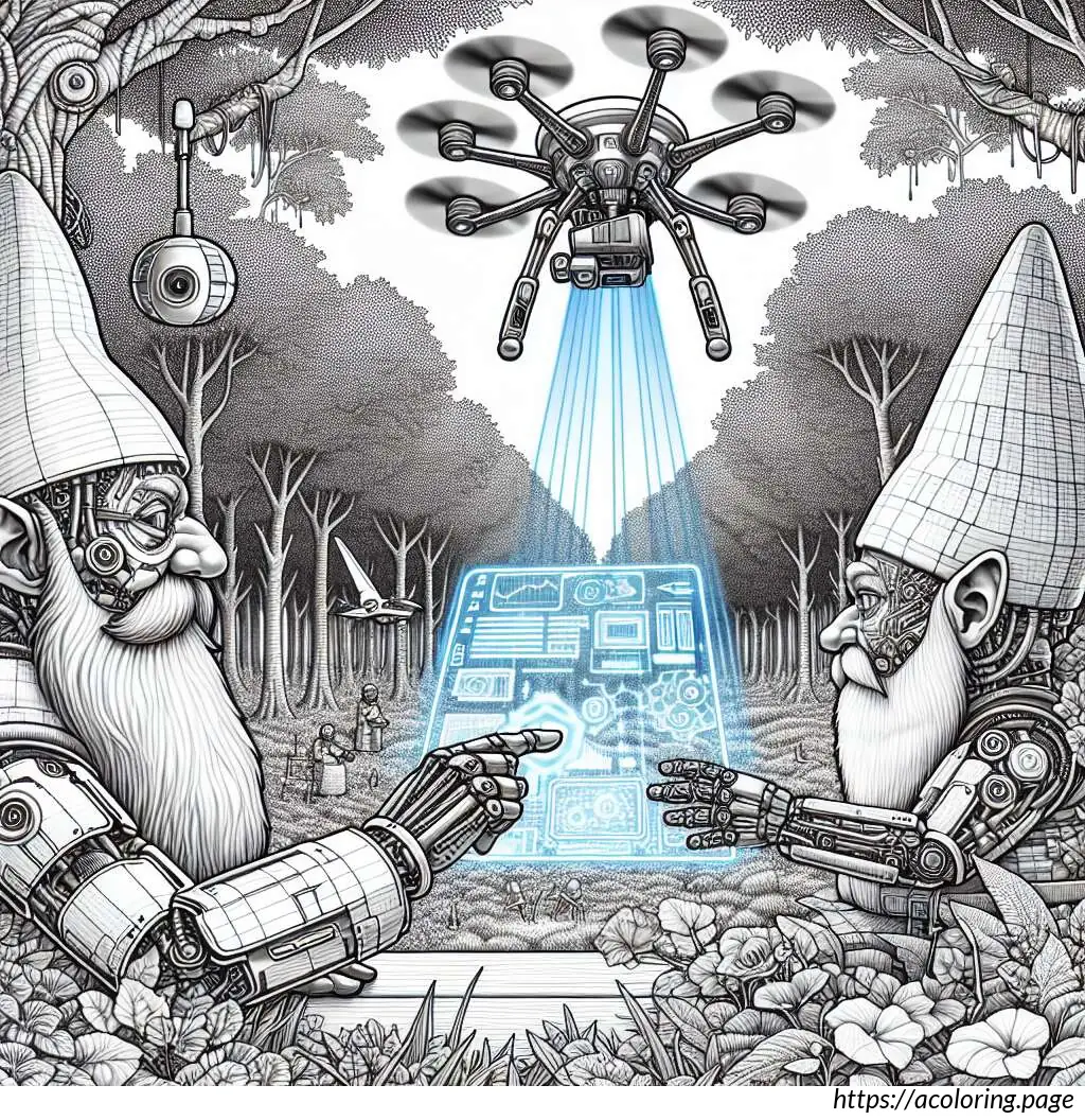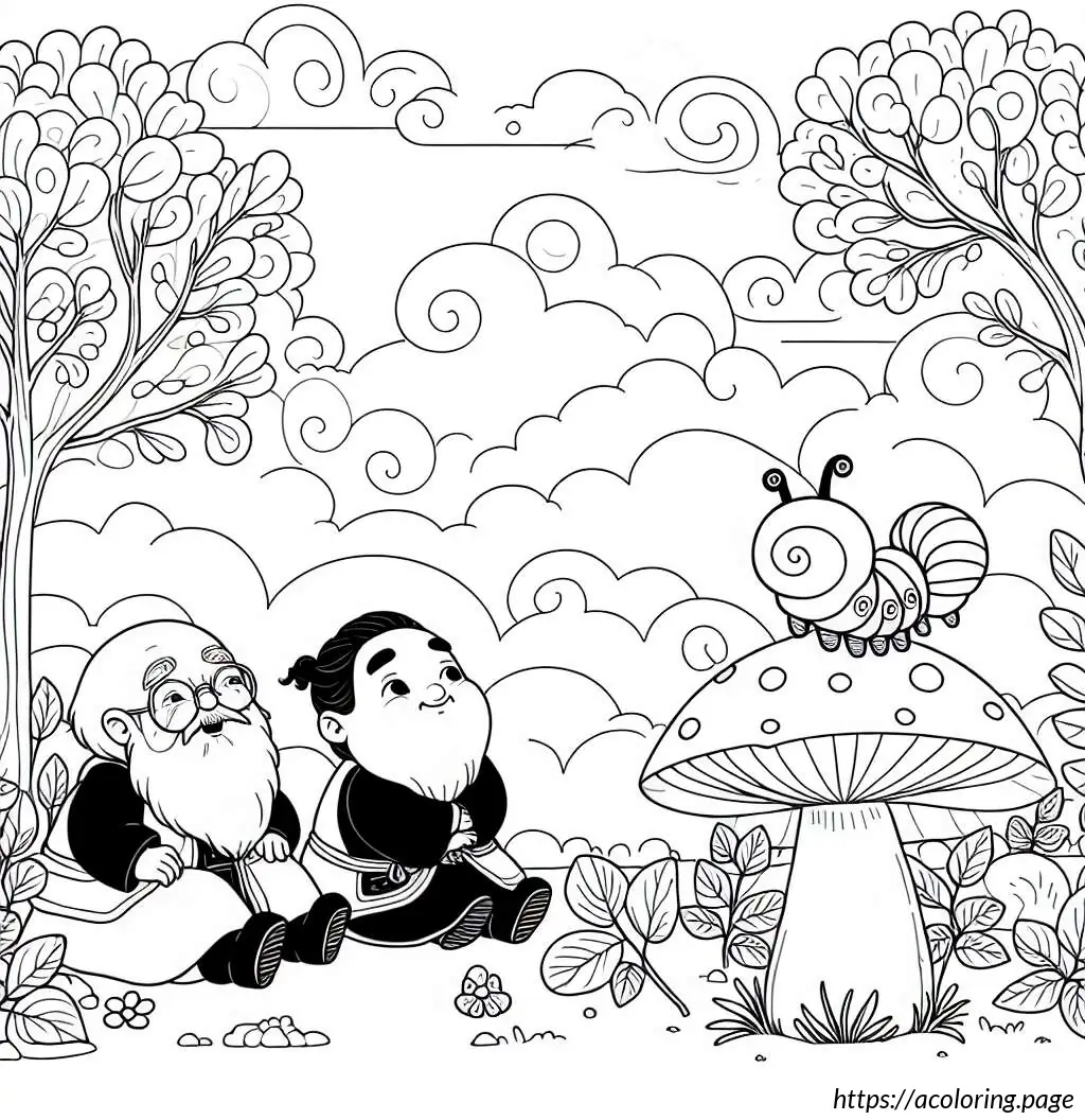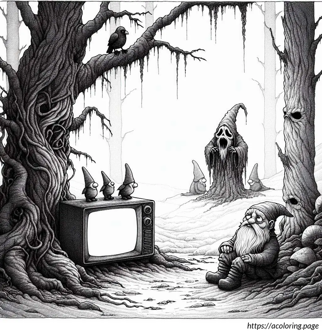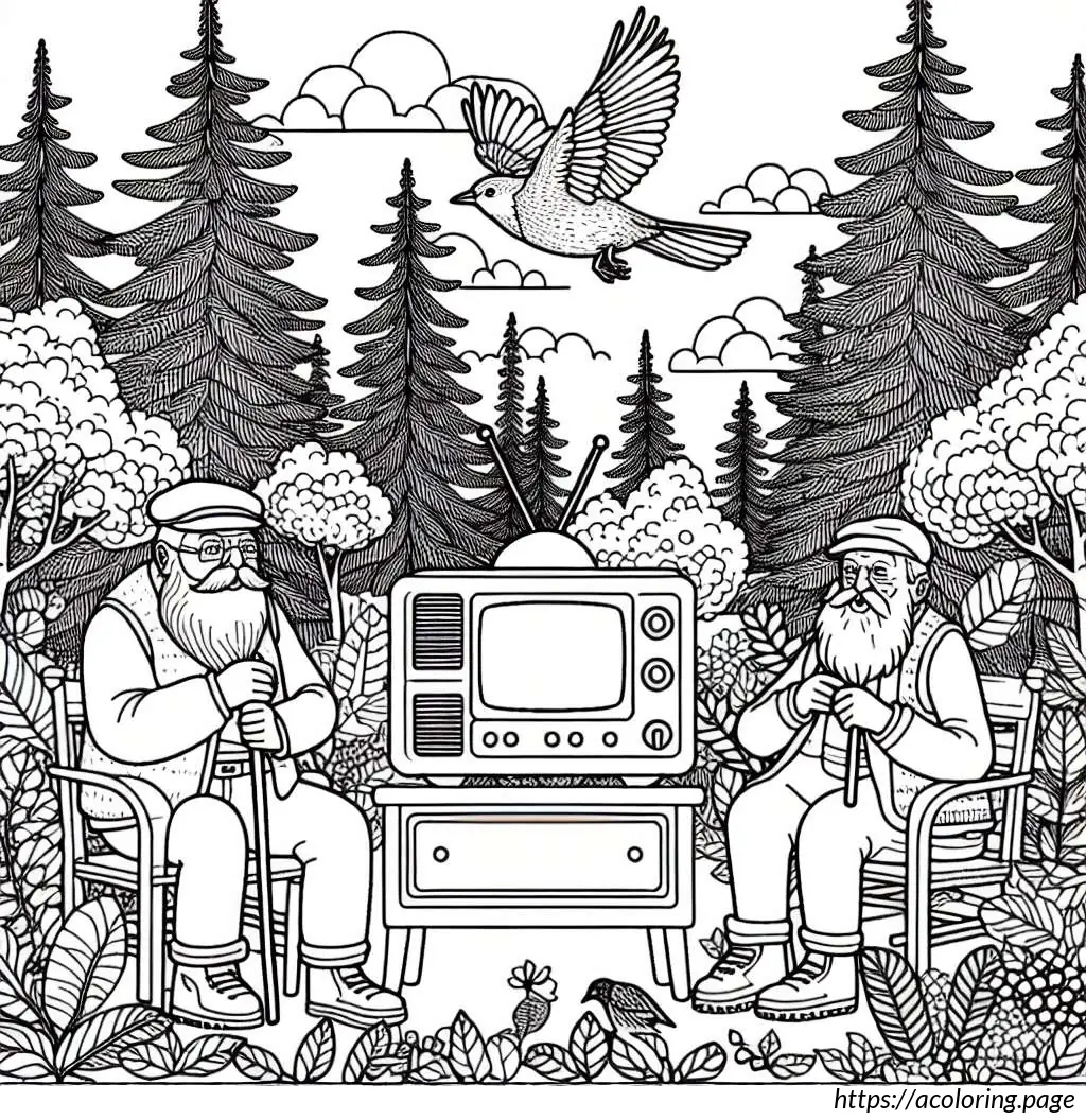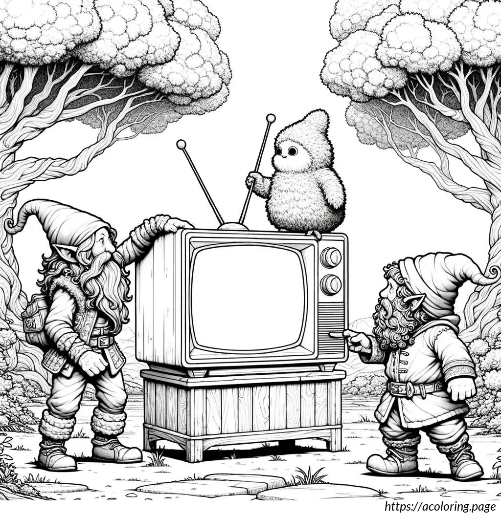 The image is a line art drawing suitable for coloring. It depicts two gnome-like characters examining a chest in a forest setting. The gnomes are dressed in traditional attire with pointy hats and beards. The first gnome, to the left, is kneeling down and opening the chest, looking surprised at its contents. The second gnome, to the right, stands beside him, looking curious and excited about what’s inside the chest. Above them, perched on a tree branch, there is a bird with a cartoonish appearance, also observing the scene. The background features stylized trees with swirling patterns on their trunks and rounded, bushy canopies. The scene appears whimsical and is likely aimed at a young audience.
