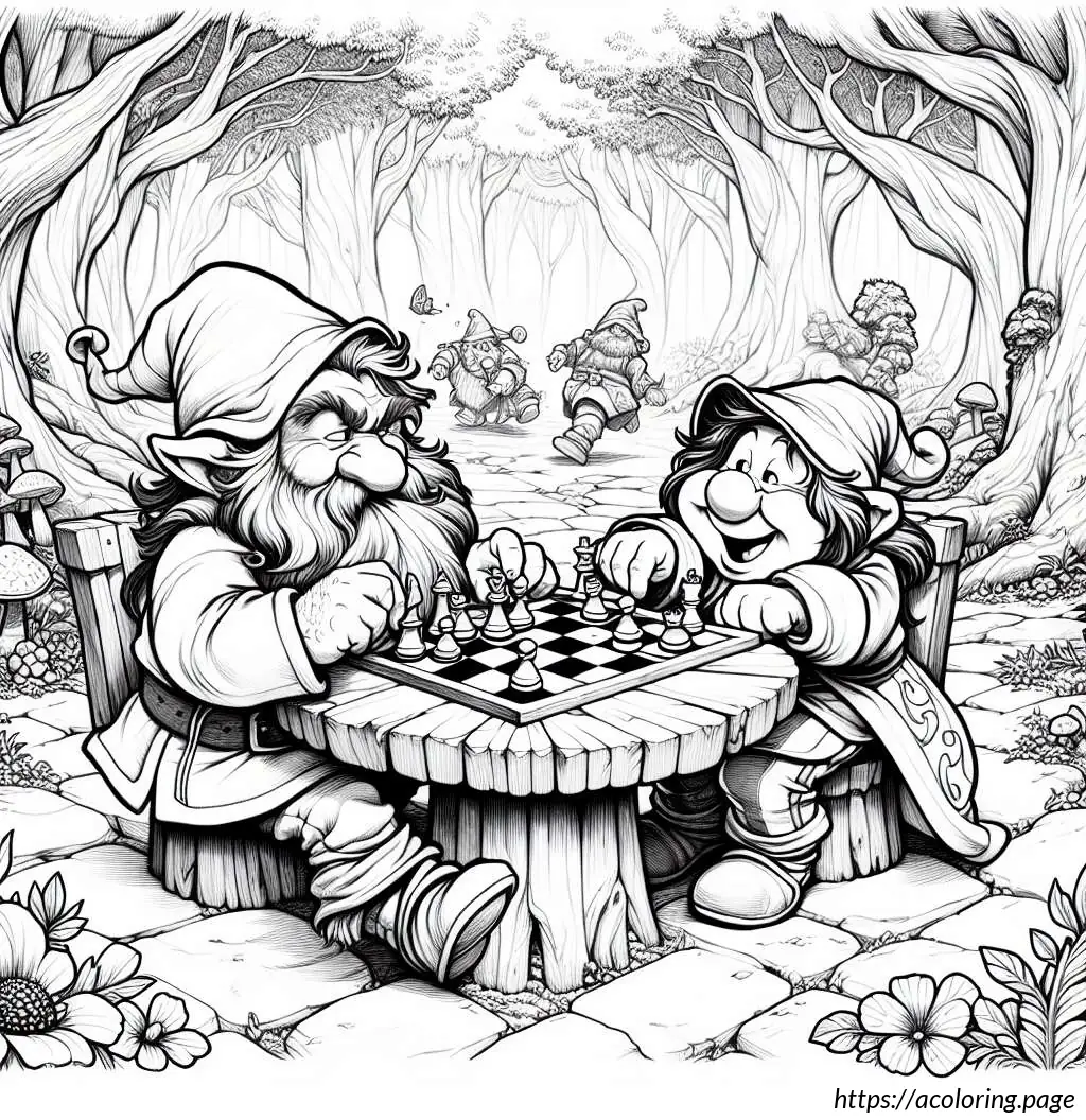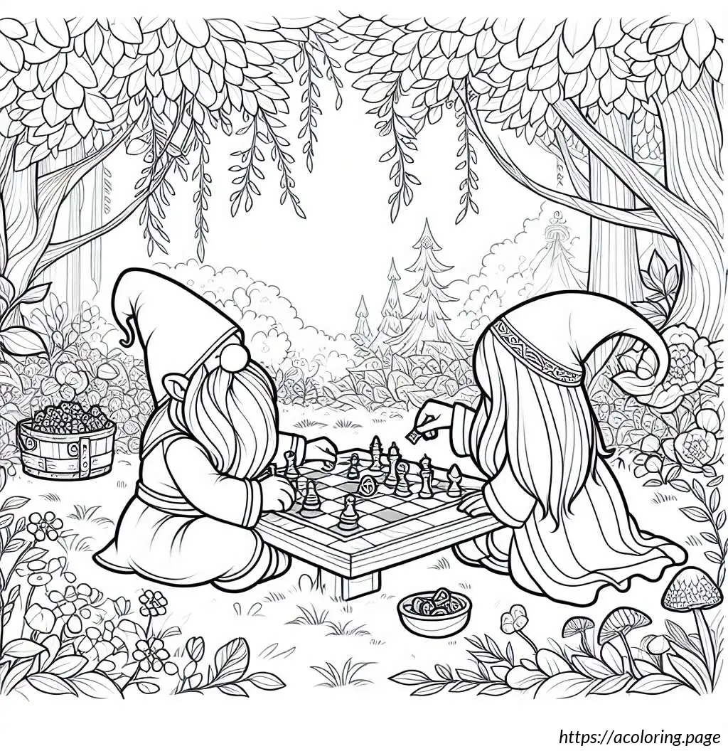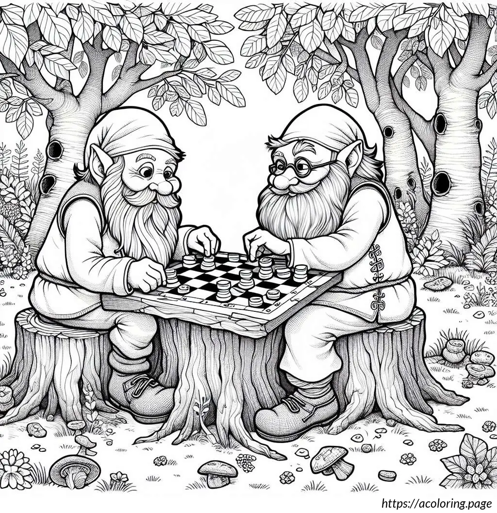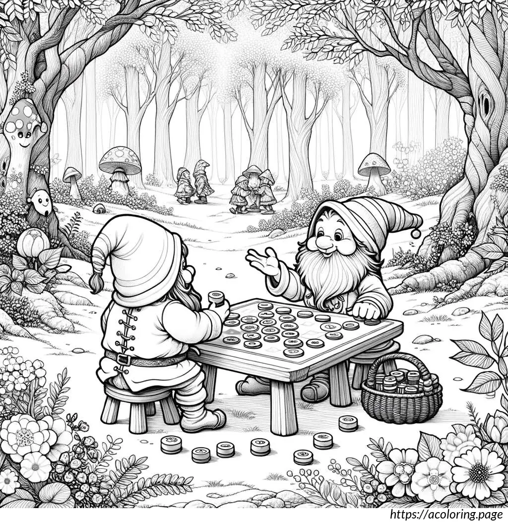 This image depicts a whimsical scene in a forest with two gnome-like characters engaged in a game. The setting features a dense, leafy forest background with multiple trees and scattered foliage. The two characters, characterized by their long beards, stout builds, and traditional gnome attire, including pointed hats, are sitting across from each other on the ground.