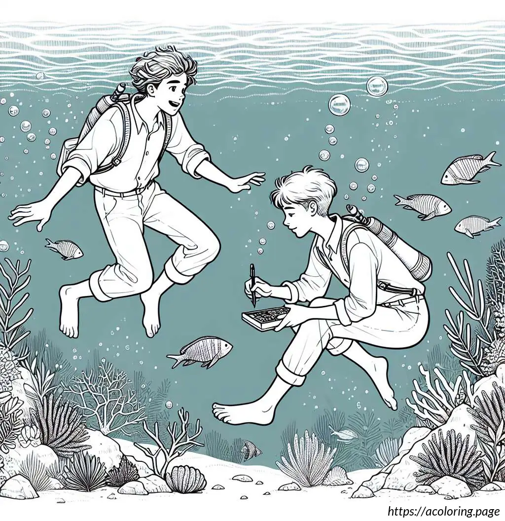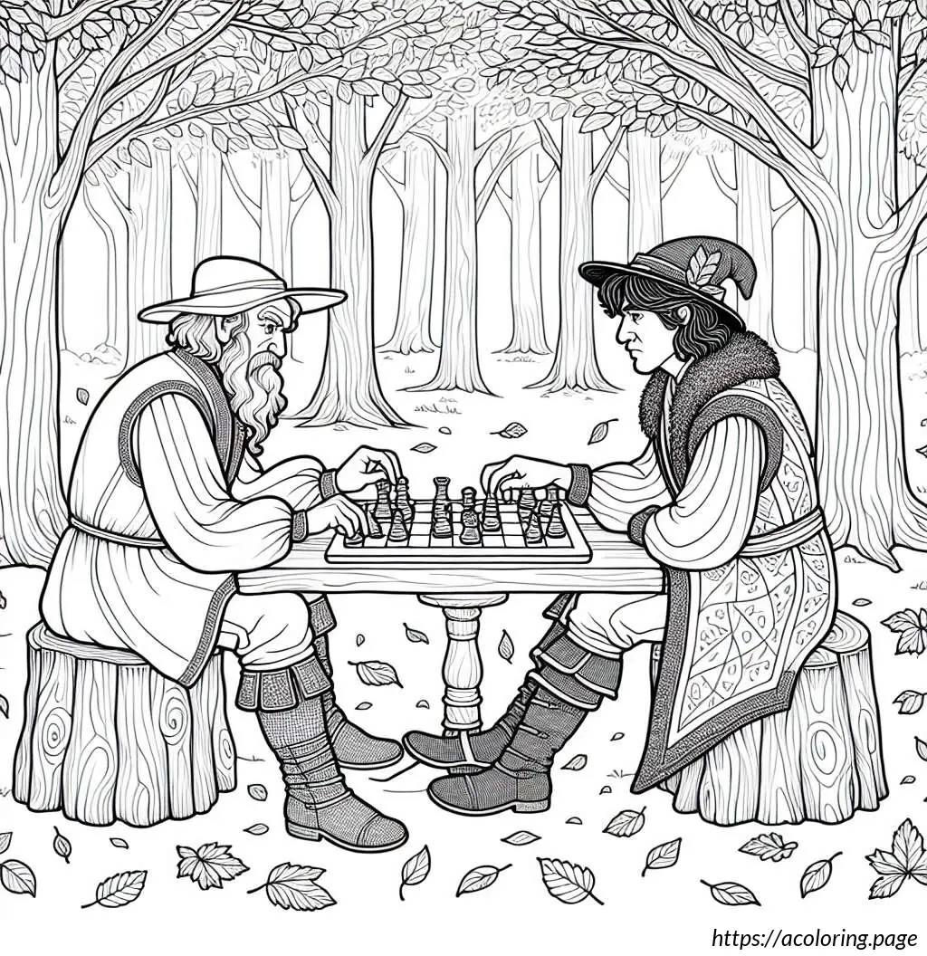 Around them, the forest floor is detailed with tufts of grass and small flowers, contributing to the serene and playful nature of the scene. This image, likely intended for coloring, captures a moment of leisure and play in a storybook forest environment.