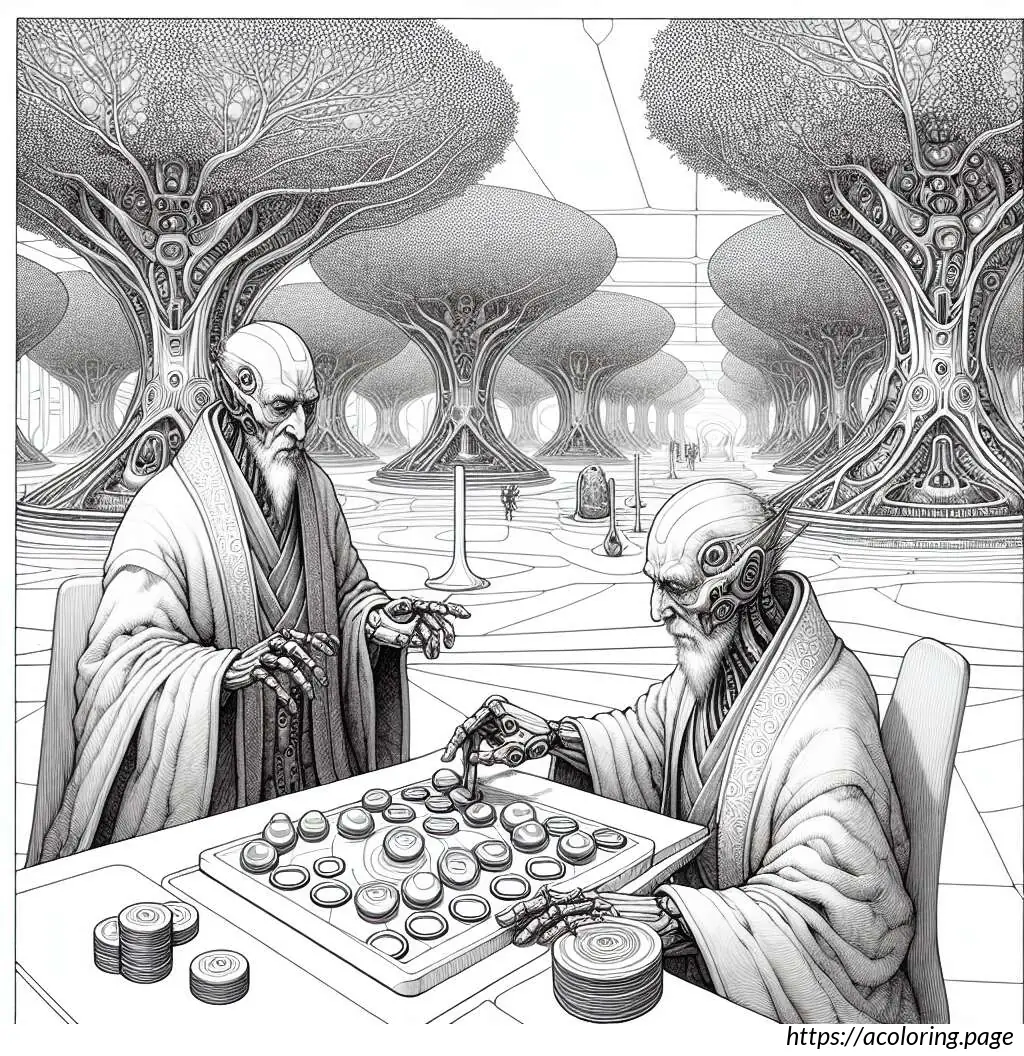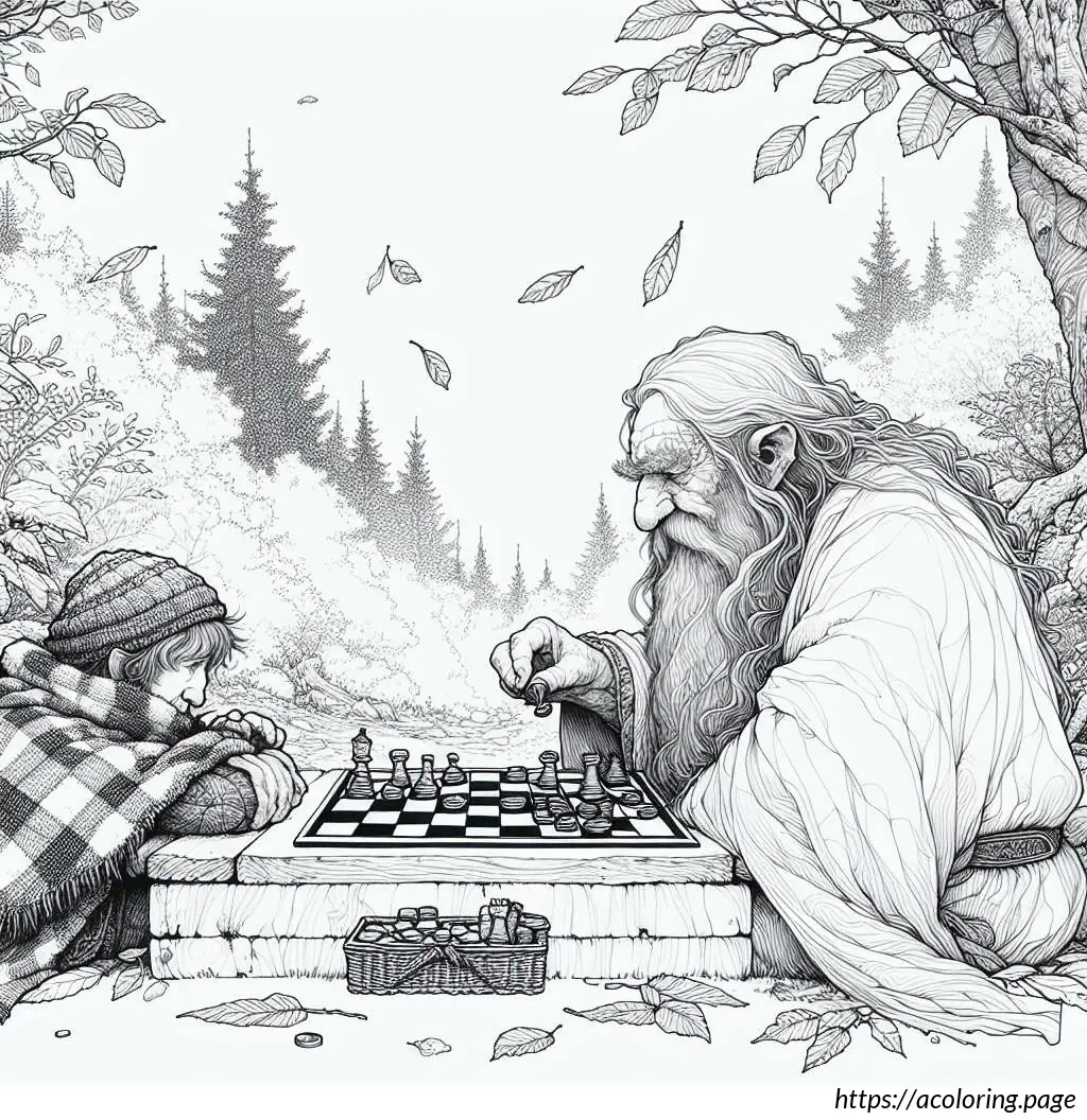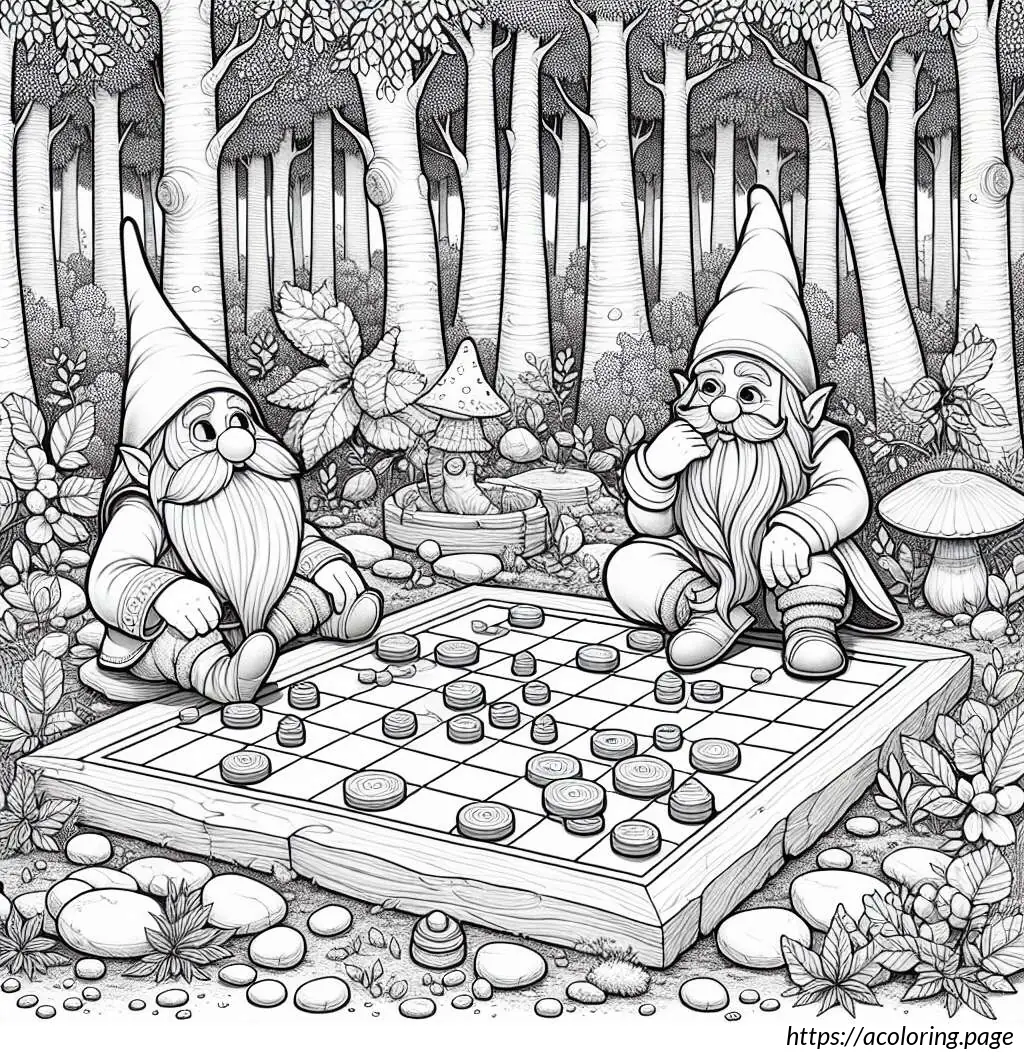 One gnome is seated to the left with his left hand on his cheek and a contemplative expression, suggesting he is pondering his next move in the game. The gnome on the right is actively playing, with one hand on a game piece on the board that appears to be a simple wooden board game with various round tokens or stones set in a grid.