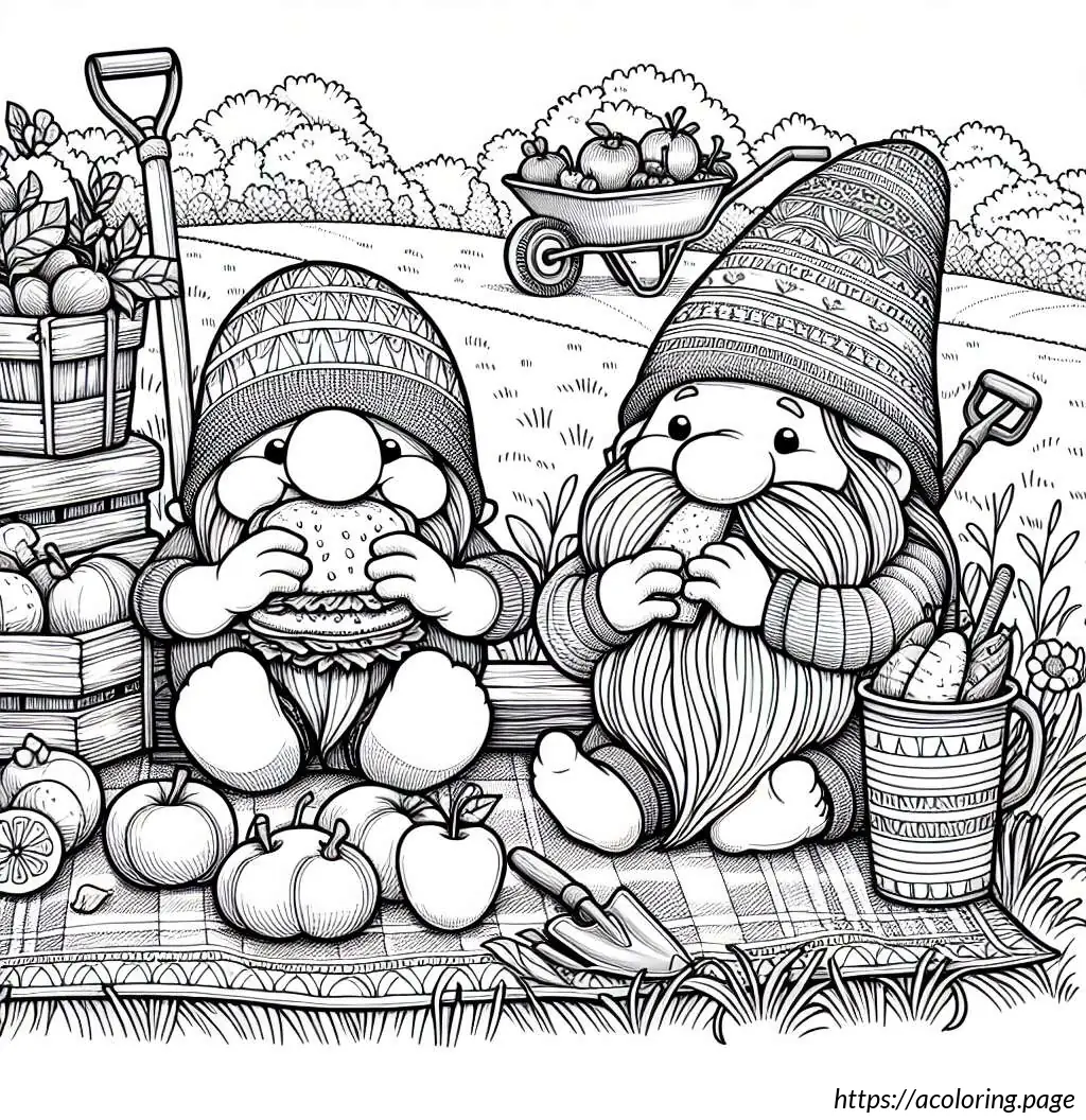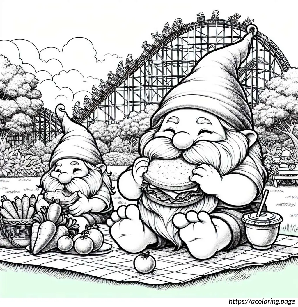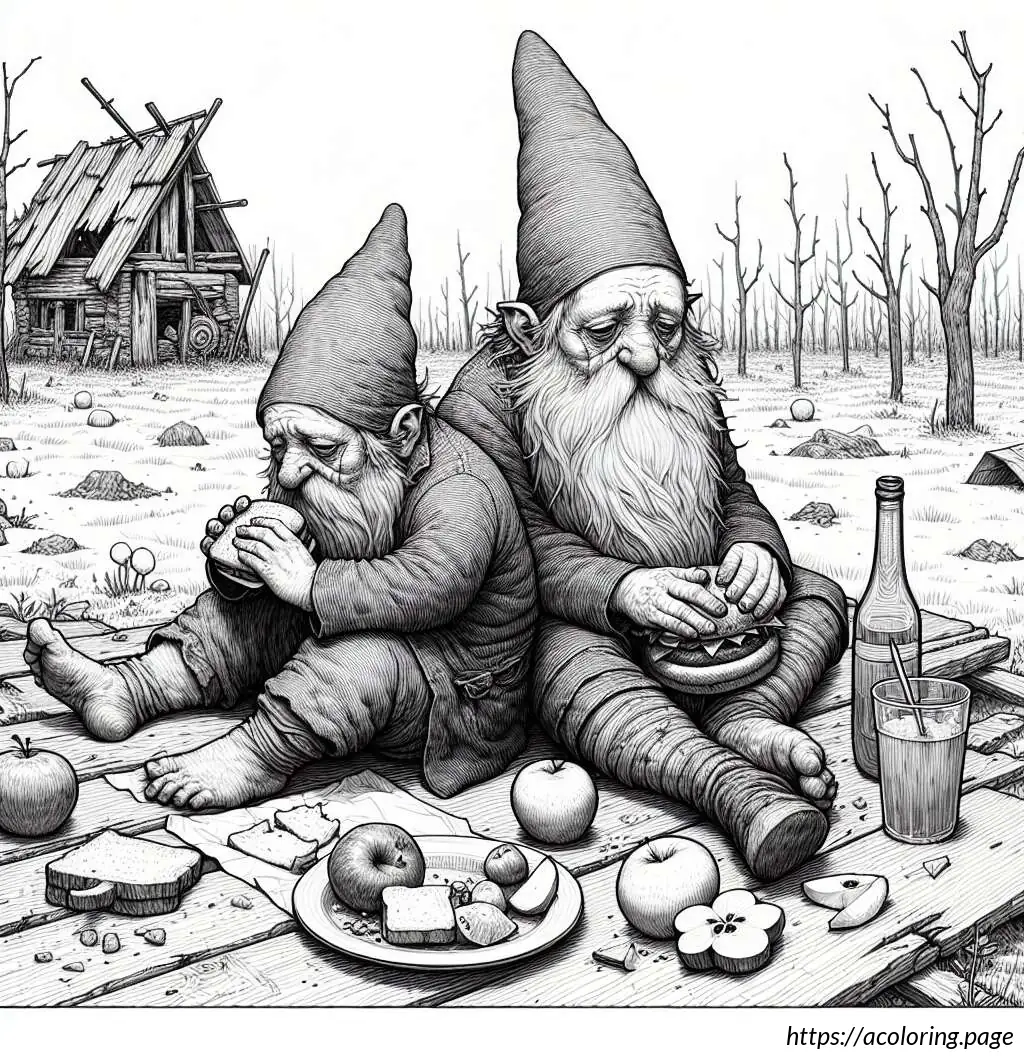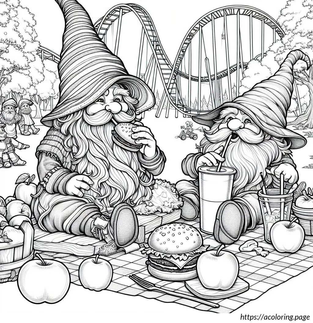 This image depicts a charming and playful scene featuring two gnome-like characters in a whimsical outdoor setting. The character on the left is holding a burger, about to take a bite, dressed in a traditional outfit with a tall, floppy hat and a full beard. The gnome on the right is enjoying a beverage, using a straw to drink from a cup, also dressed similarly with a long beard and a pointed hat.