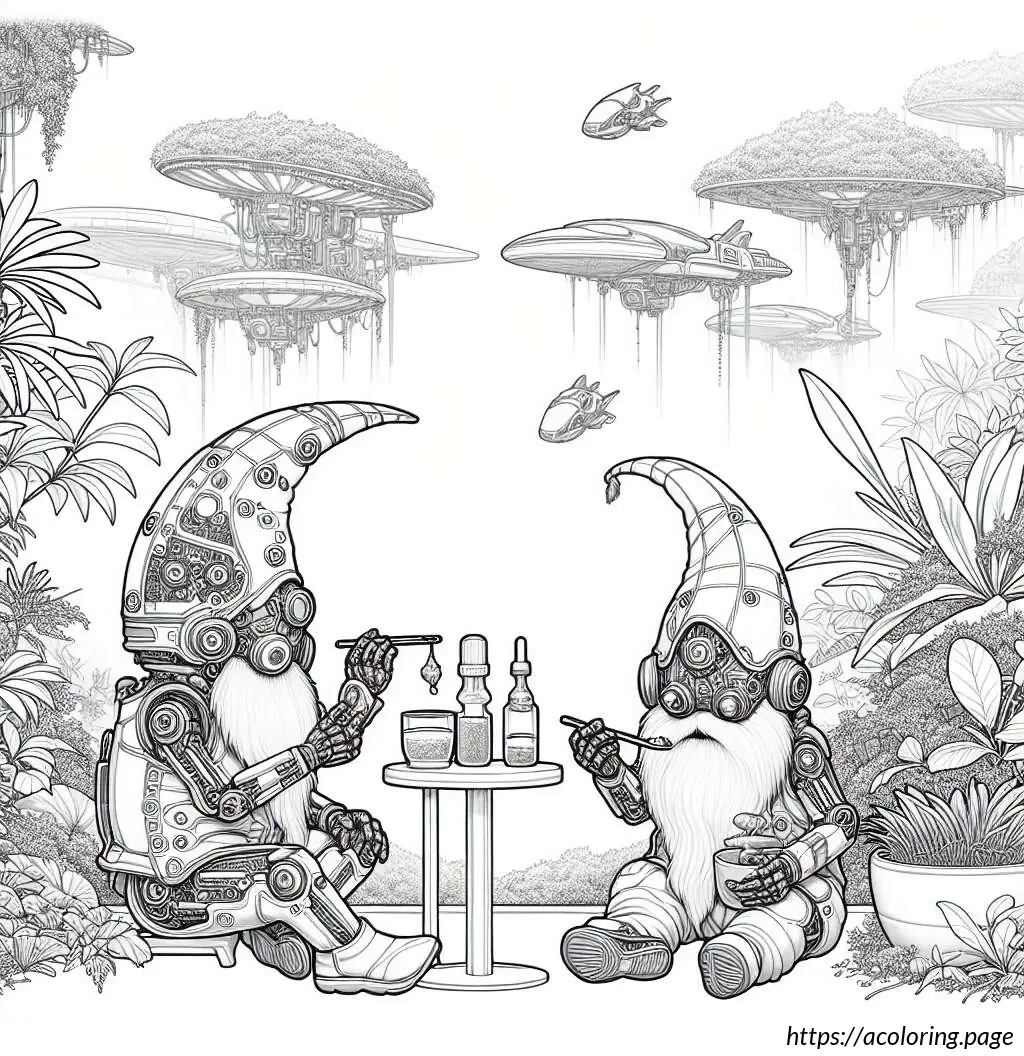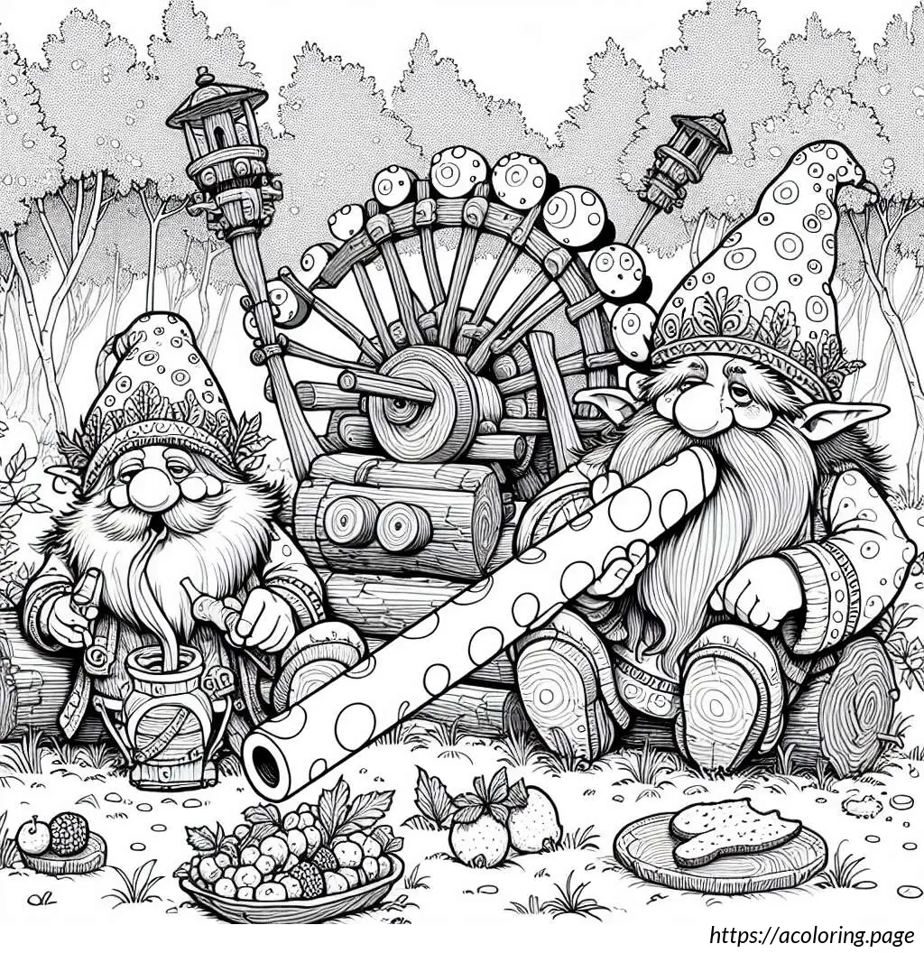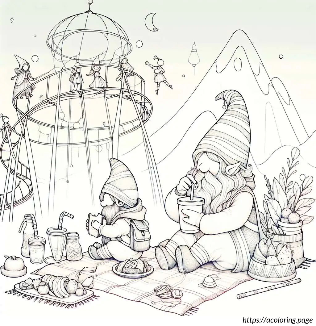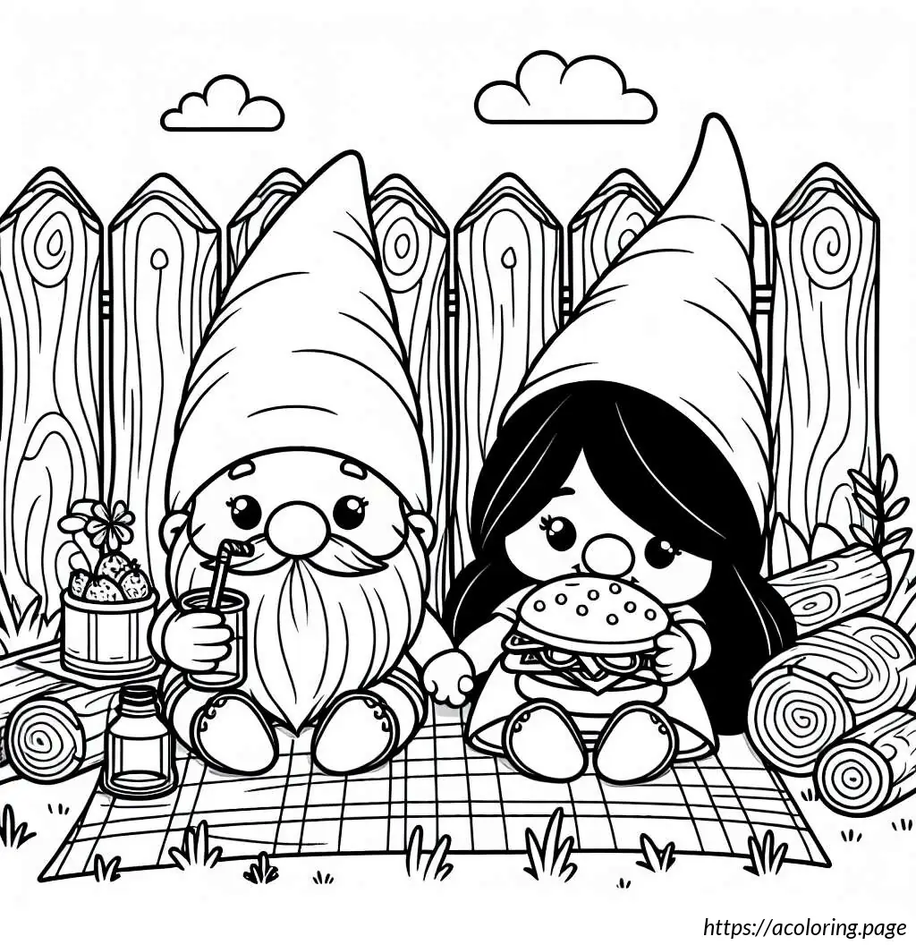 This image depicts a charming and playful scene featuring two gnome-like characters in a whimsical outdoor setting. The character on the left is holding a burger, about to take a bite, dressed in a traditional outfit with a tall, floppy hat and a full beard. The gnome on the right is enjoying a beverage, using a straw to drink from a cup, also dressed similarly with a long beard and a pointed hat.
