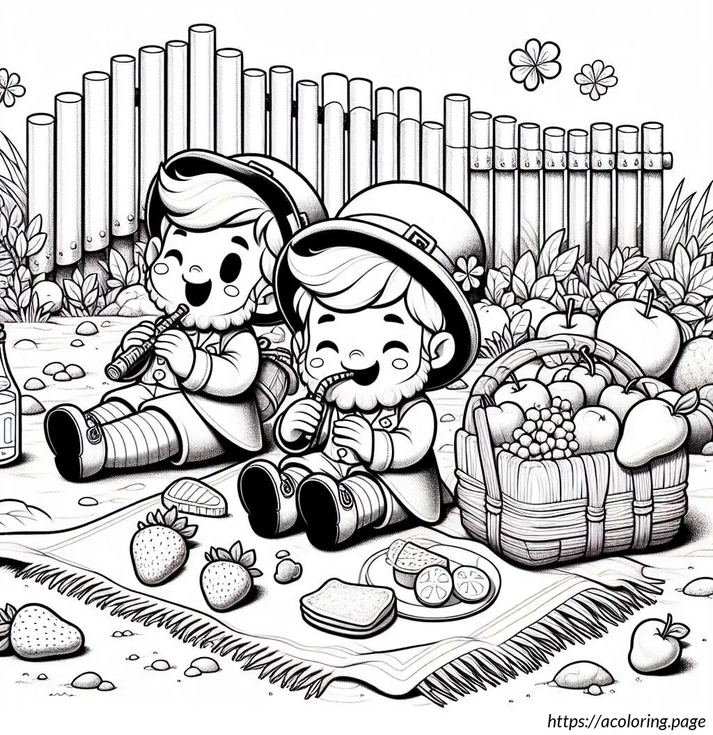 In the foreground, there is a picnic blanket with various items scattered around, including fruits like apples and what appears to be a bread loaf. The background setting includes trees and a large roller coaster, adding a sense of being in an amusement park or a festive outdoor area. The overall scene is lively and seems to depict a moment of leisure and enjoyment.