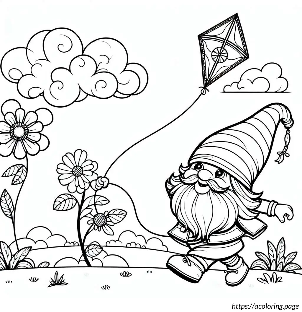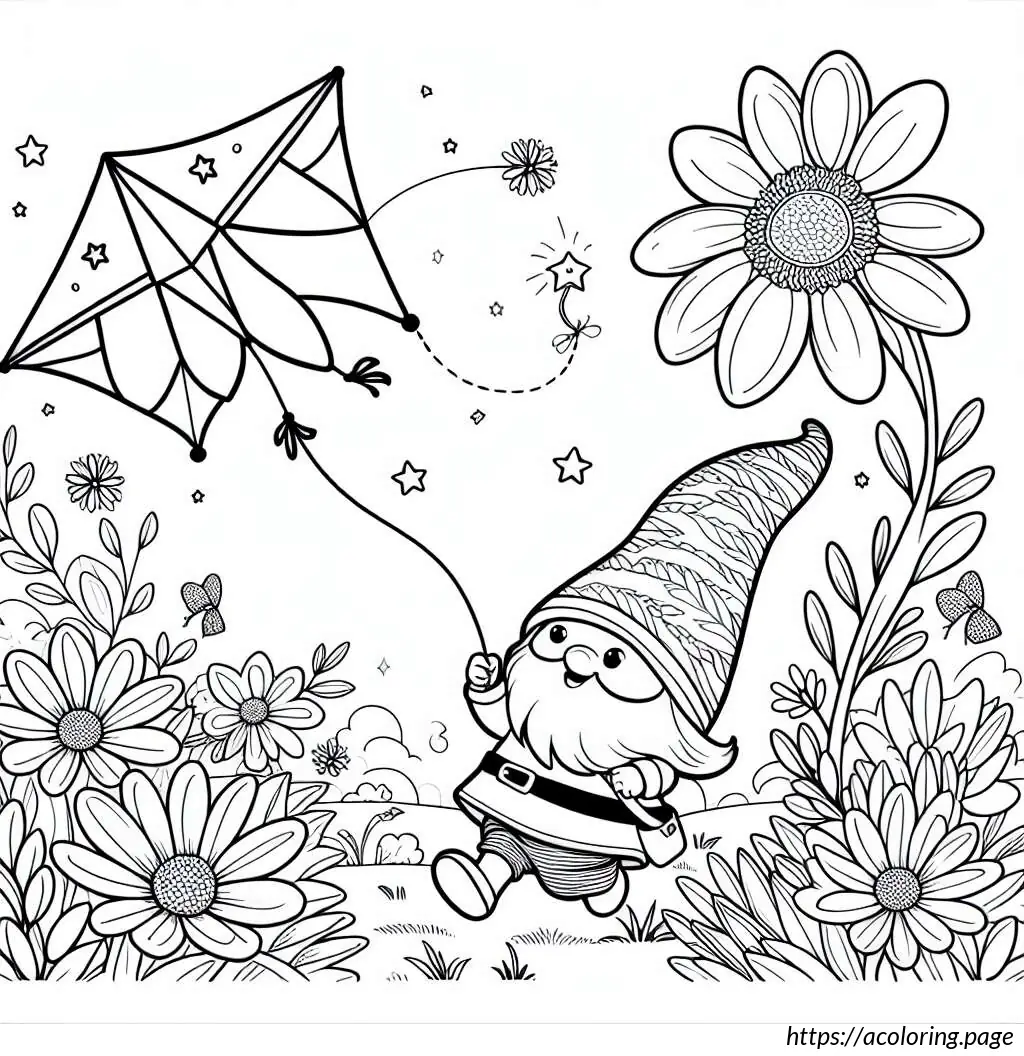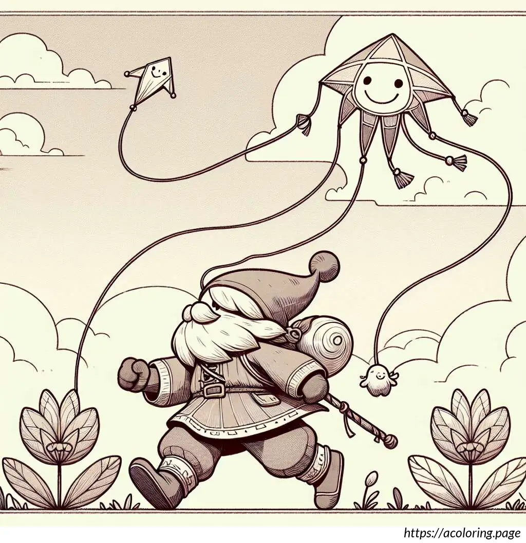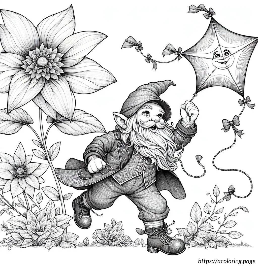 This image features a line drawing suitable for coloring. It depicts a cheerful scene of a gnome-like character happily running with a kite. The character, who appears male, is dressed in a pointy hat with a long tassel at the end, a jacket with a front pocket, and boots. The kite has a simple and friendly face with two eyes and a wide smile. It’s attached to the gnome’s hand by a string adorned with small bow ties. In the background, there is a lush garden environment displaying two large flowers in the foreground. These flowers have five petals each and are connected to stalks with leaves. The overall setting creates a playful and whimsical atmosphere.