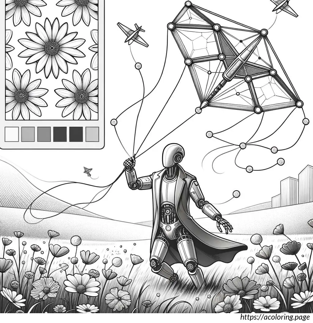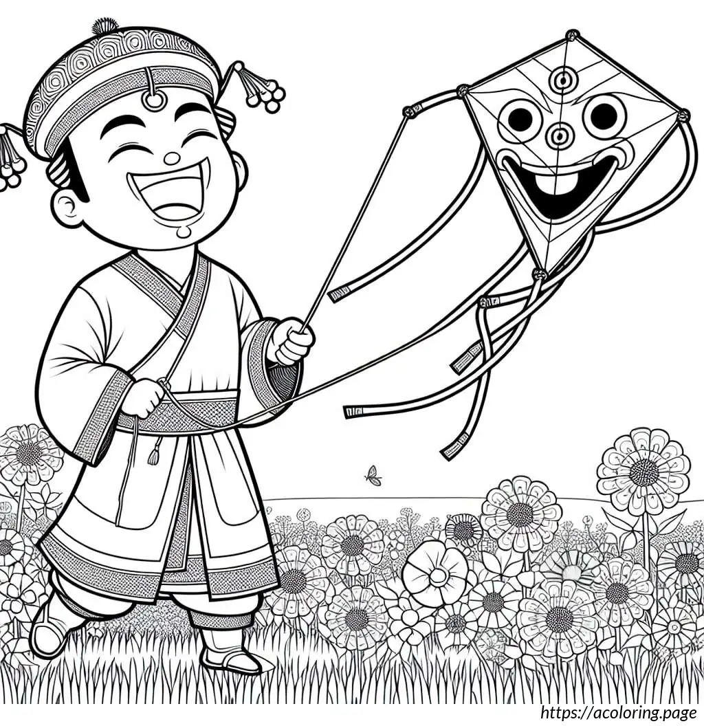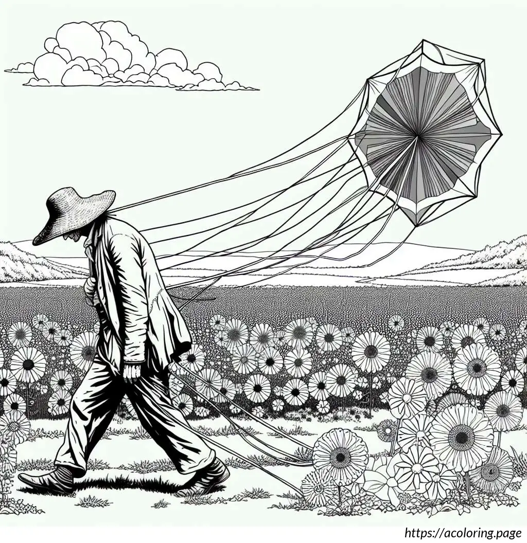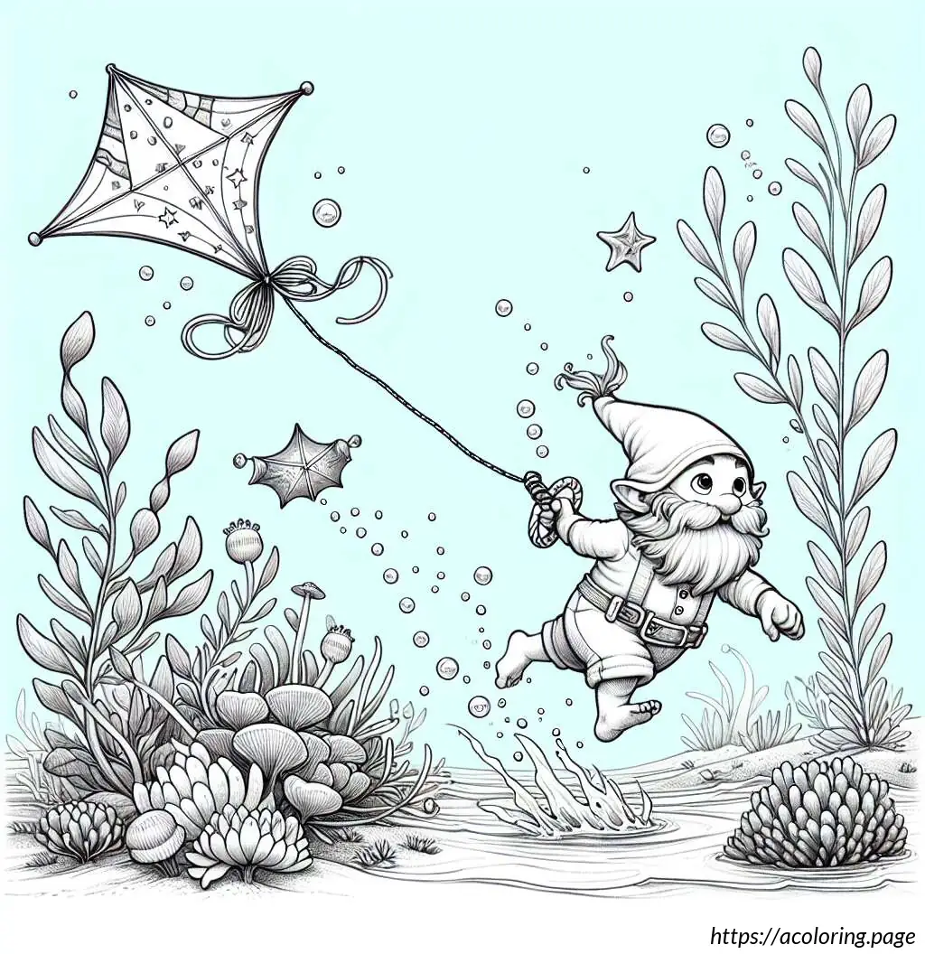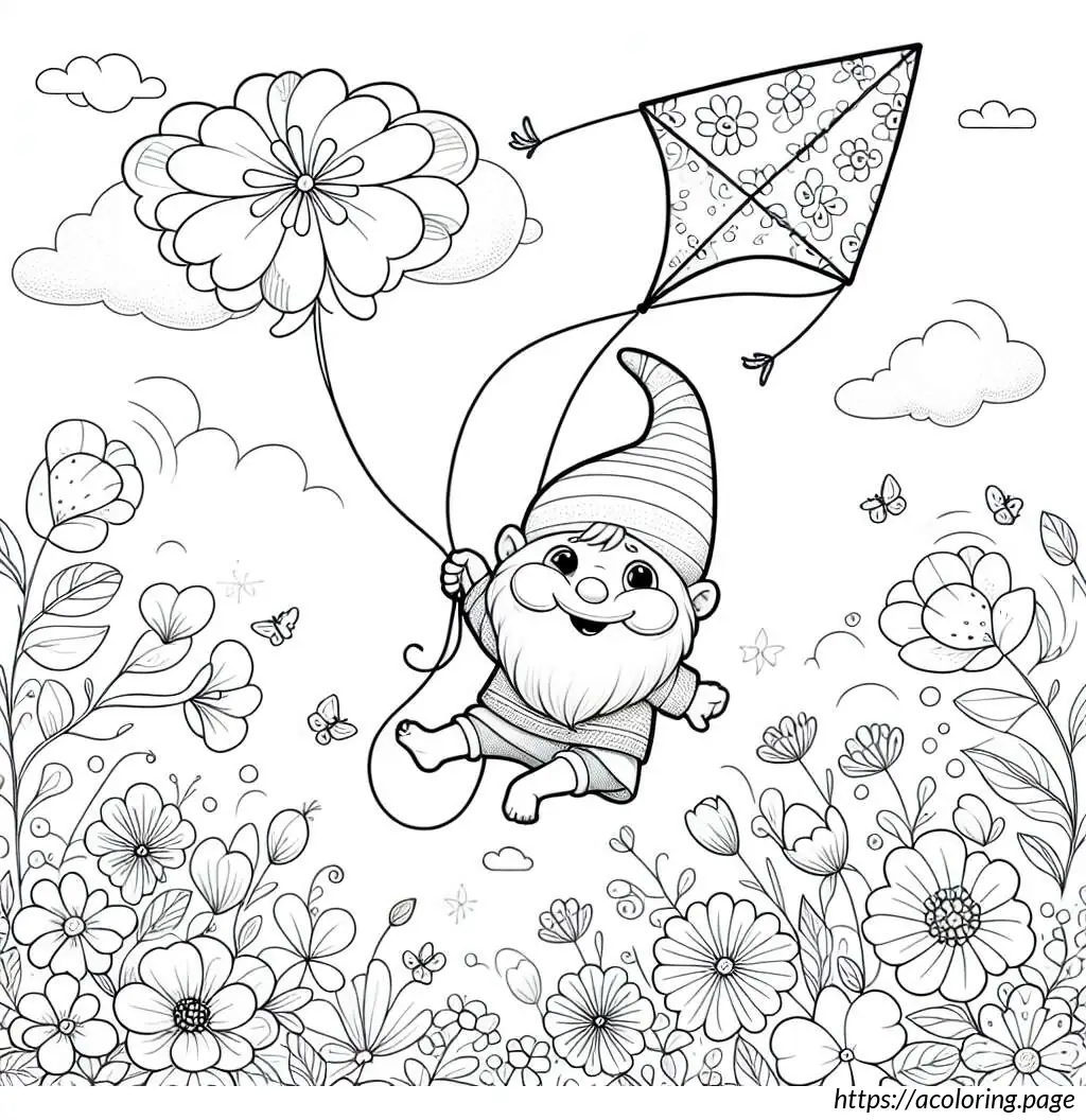 This image features a line drawing suitable for coloring. It depicts a cheerful scene of a gnome-like character happily running with a kite. The character, who appears male, is dressed in a pointy hat with a long tassel at the end, a jacket with a front pocket, and boots. The kite has a simple and friendly face with two eyes and a wide smile. It’s attached to the gnome’s hand by a string adorned with small bow ties. In the background, there is a lush garden environment displaying two large flowers in the foreground. These flowers have five petals each and are connected to stalks with leaves. The overall setting creates a playful and whimsical atmosphere.