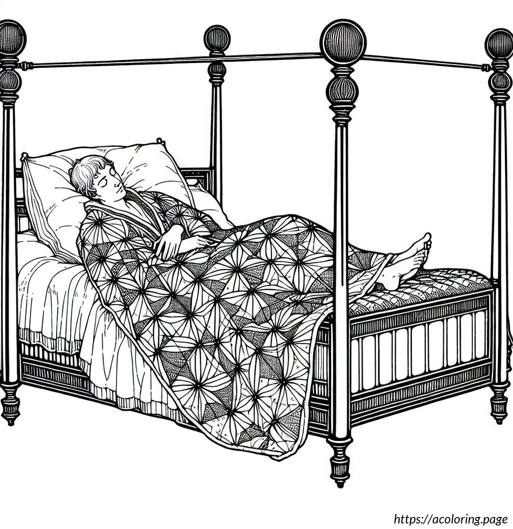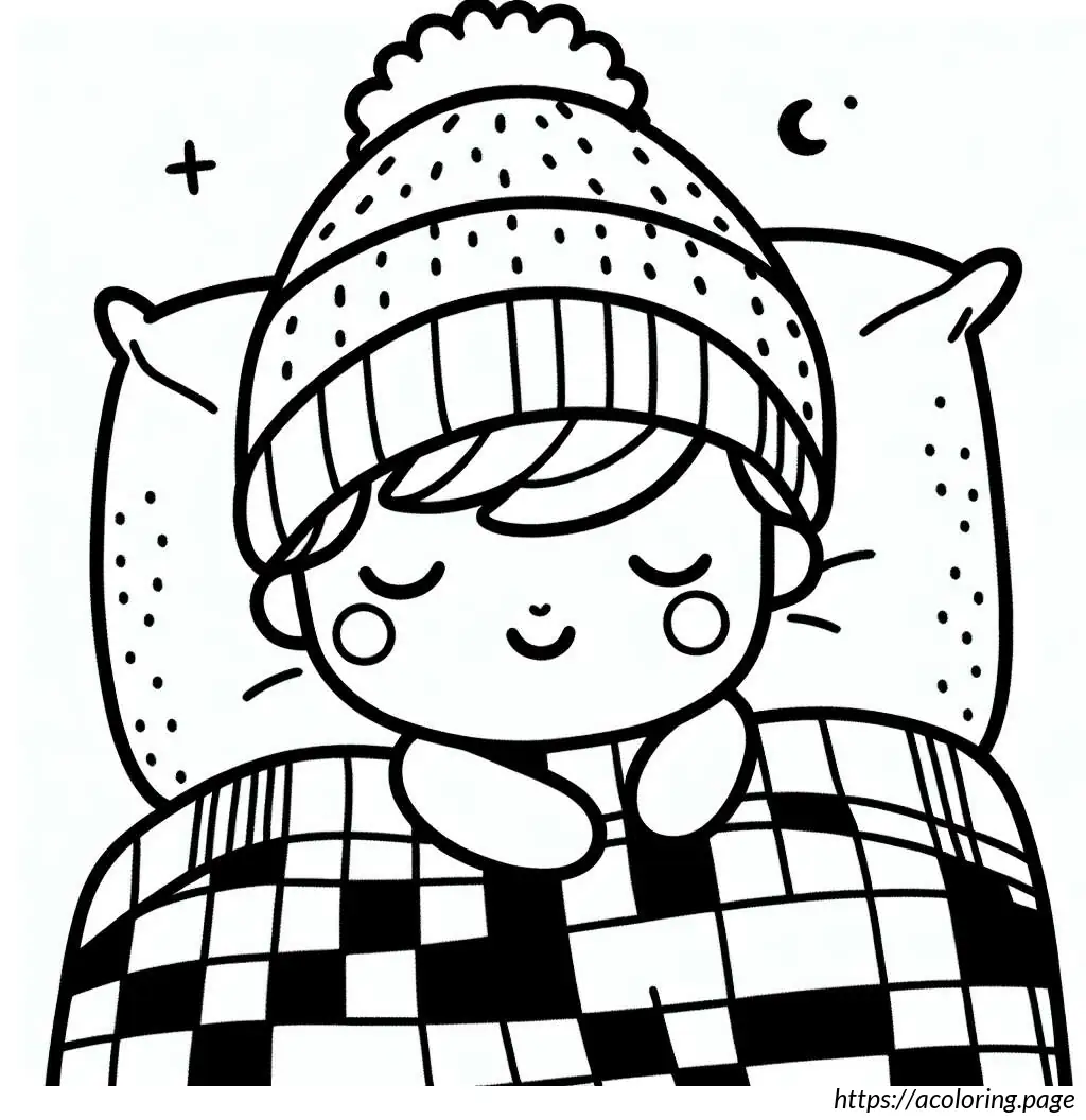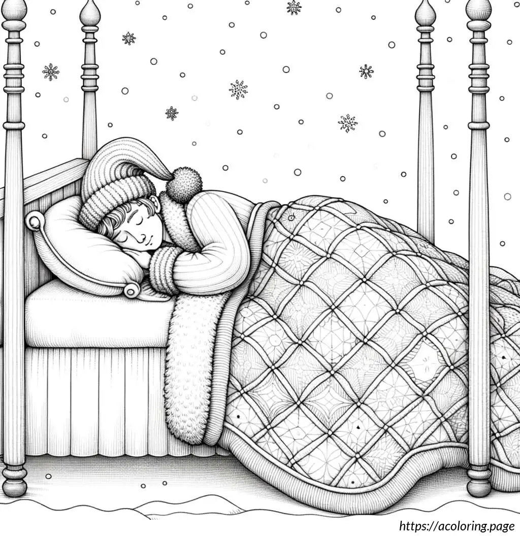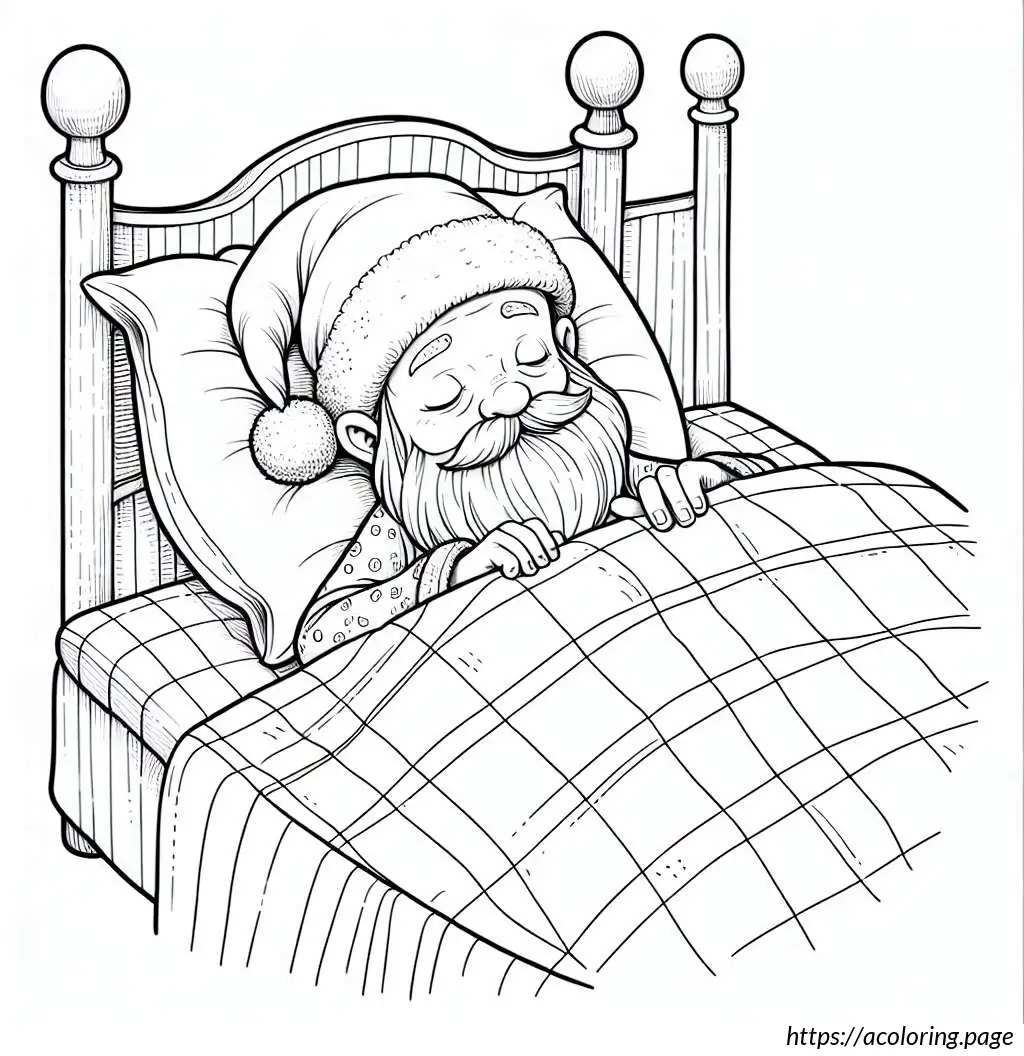 The image is a black and white line drawing of a cartoon-style elderly man, likely Santa Claus, sleeping peacefully in a bed. He is depicted with his eyes closed and a serene expression. Heβs wearing a nightcap with a pompom at the end, which covers most of his head and falls off to the side slightly. His arms are sticking out slightly from under what appears to be a tucked blanket, adorned with a checkerboard pattern along the edge. The bed features round post ends, adding to the simplistic and quaint style of the drawing. The overall atmosphere of the image is calm and restful.