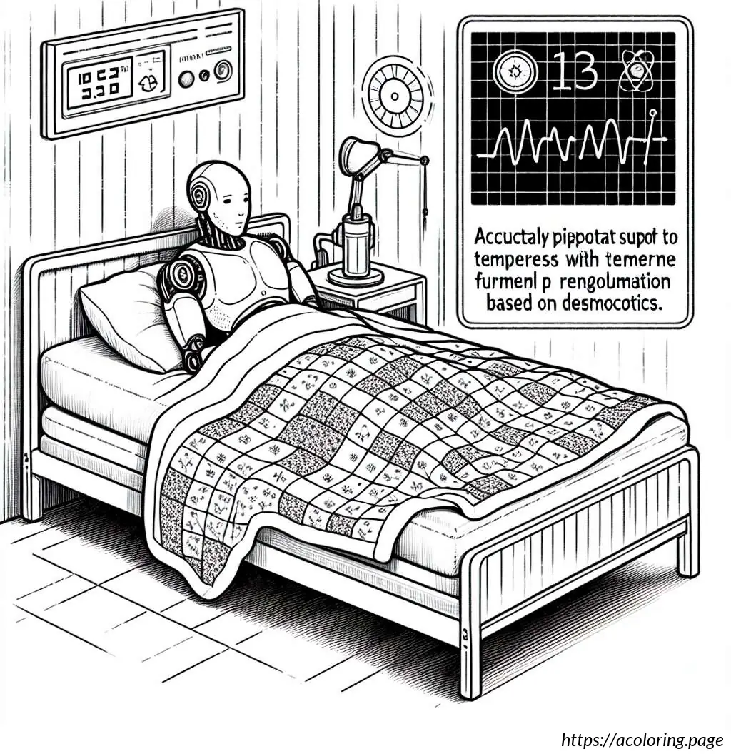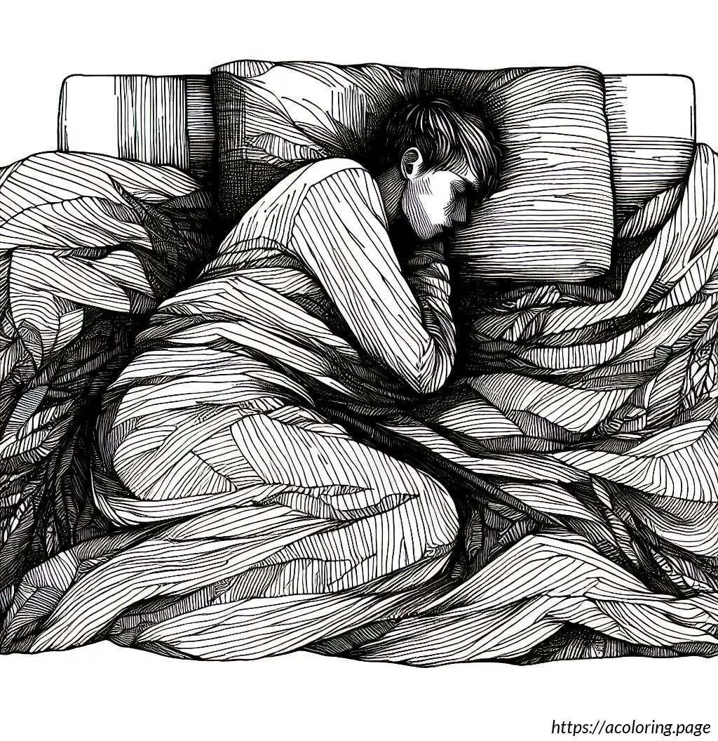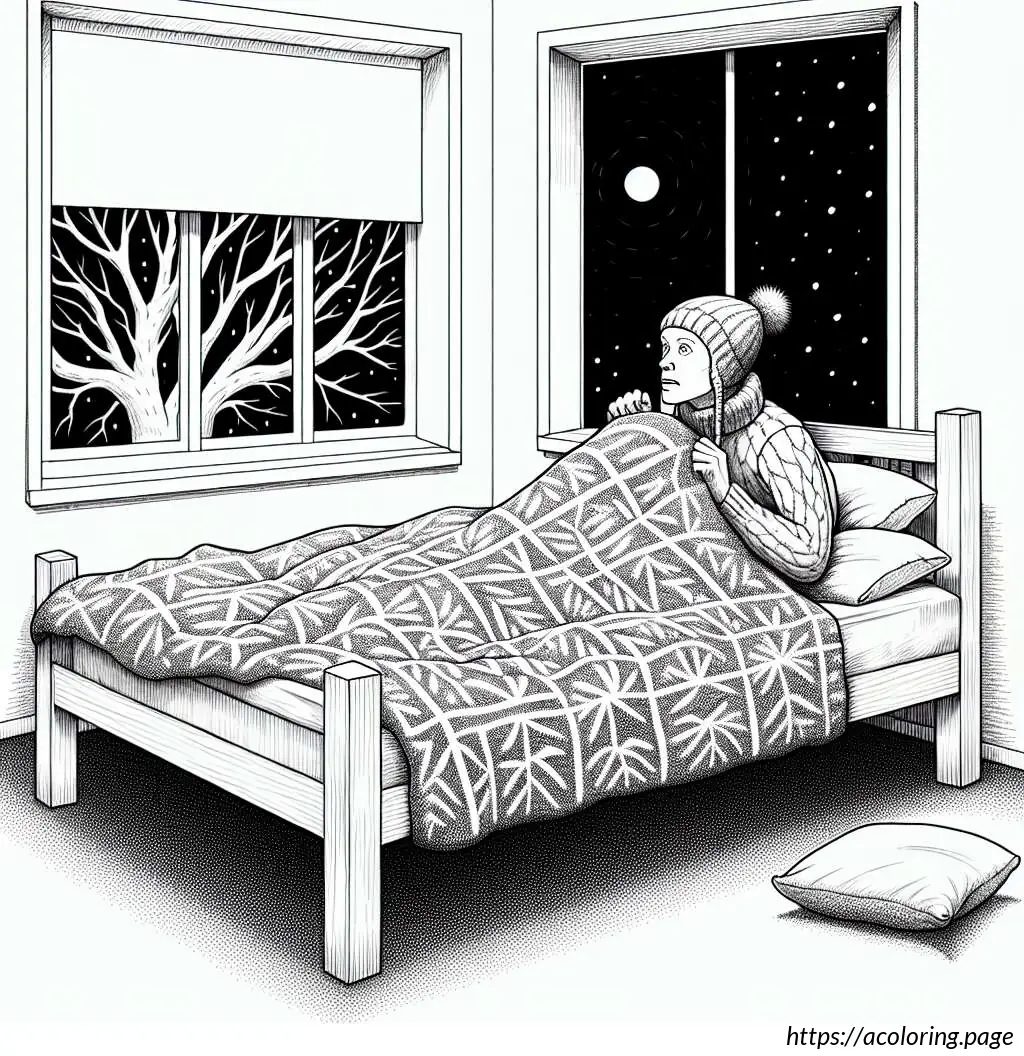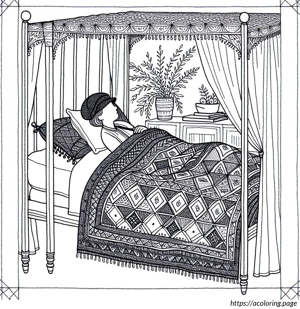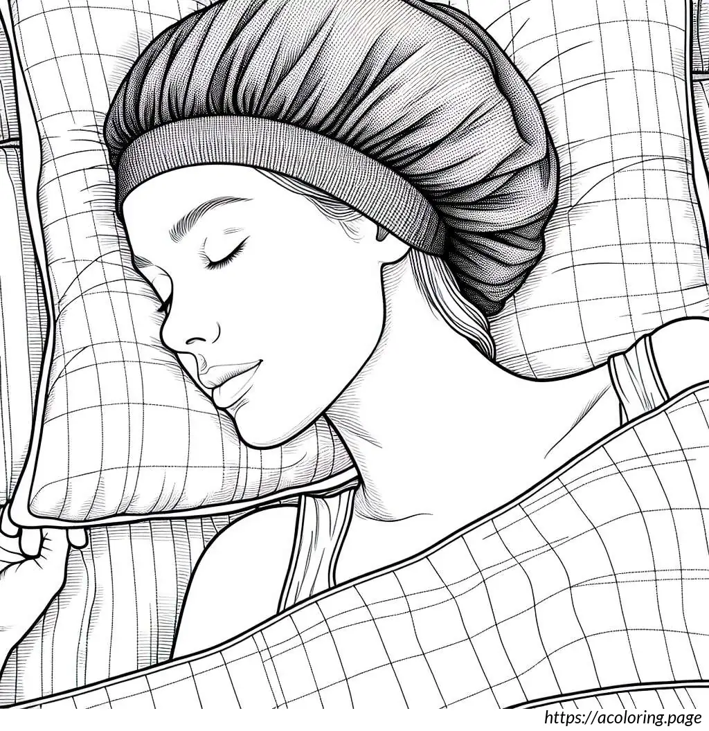 The image is a black and white line drawing of a cartoon-style elderly man, likely Santa Claus, sleeping peacefully in a bed. He is depicted with his eyes closed and a serene expression. Heβs wearing a nightcap with a pompom at the end, which covers most of his head and falls off to the side slightly. His arms are sticking out slightly from under what appears to be a tucked blanket, adorned with a checkerboard pattern along the edge. The bed features round post ends, adding to the simplistic and quaint style of the drawing. The overall atmosphere of the image is calm and restful.