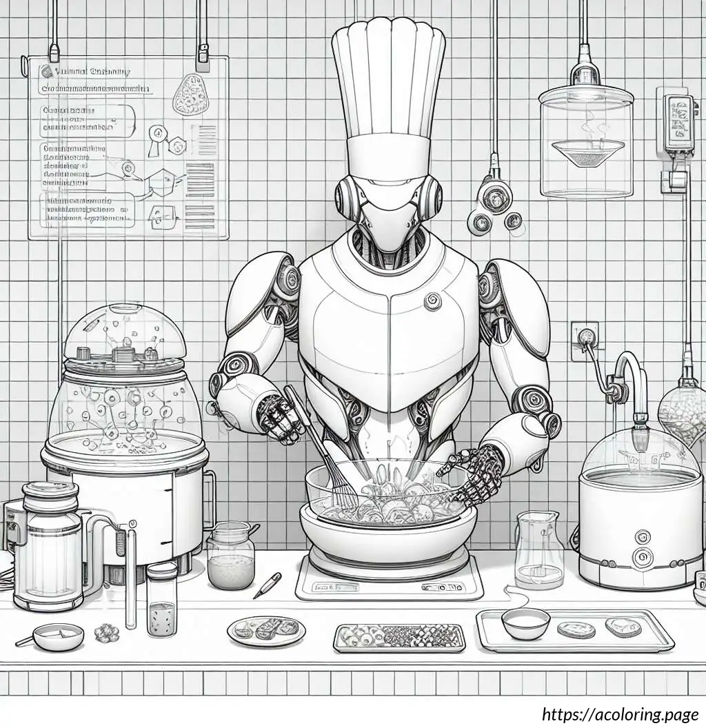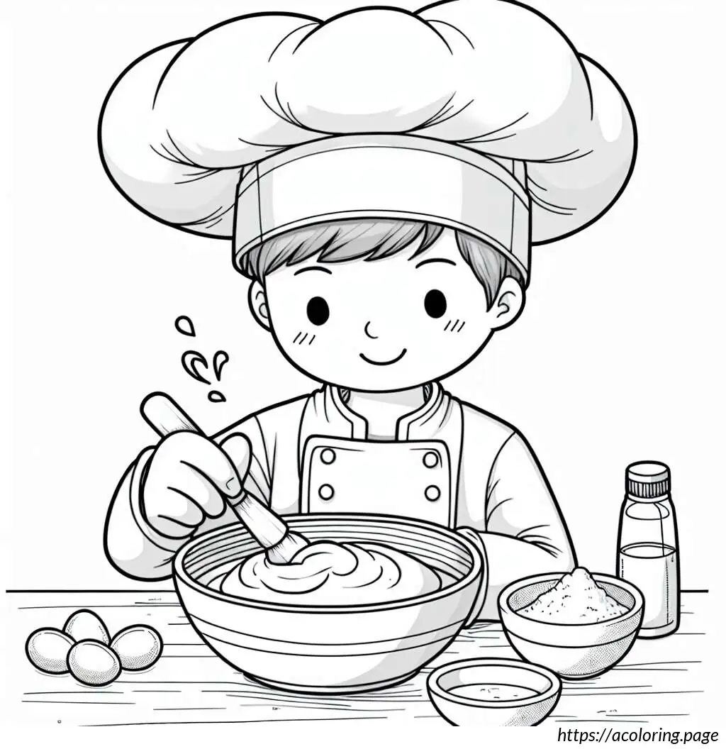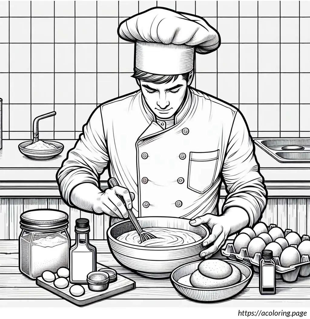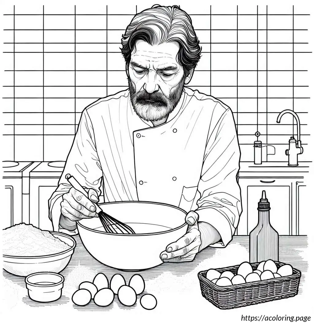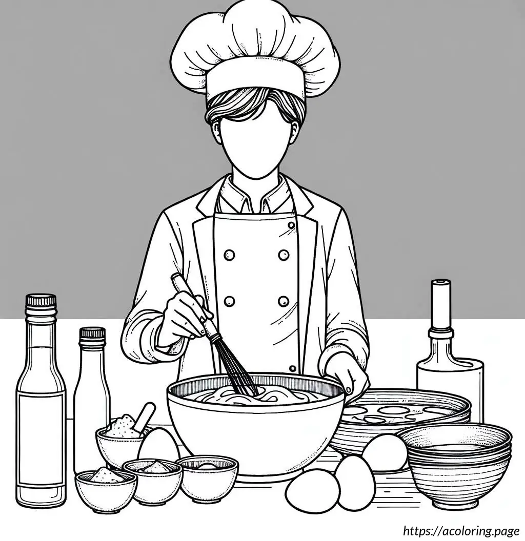 The background indicates a kitchen setting, with tiles lining the wall. In the immediate vicinity of the chef, there are various cooking ingredients and utensils visible. These include a bowl possibly containing flour, a bottle likely for oil or vinegar, and a few eggs resting near the bowl. The overall style is simplistic, emphasizing outlines without any shading or color, giving it a clean and accessible appearance typical of coloring book illustrations.