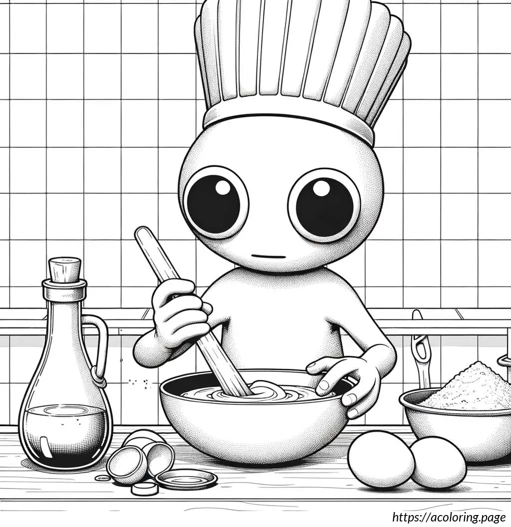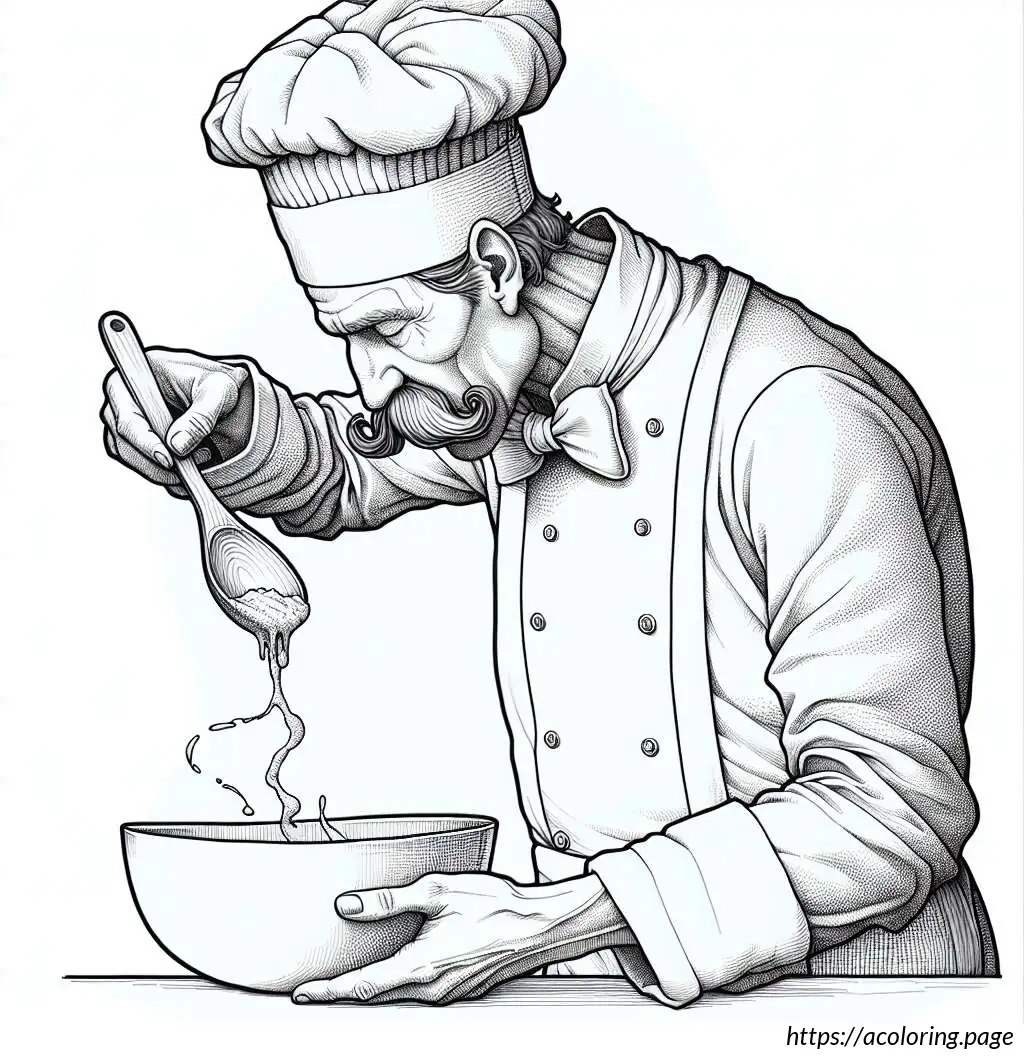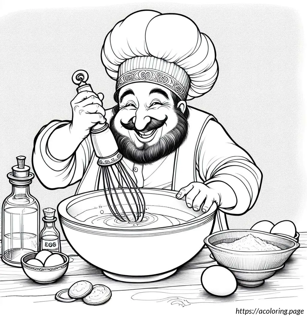 This image is a line drawing featuring a chef character engaging in cooking activities. The chef, who appears content and focused, is wearing a traditional chef’s hat, which is quite large and puffy, protruding above his head. There are no distinct facial features detailed; rather, there are simple drawn eyes and a nose. The hands are stylized in a cartoonish manner with round, cuff-like outlines and the usual three fingers and a thumb, one of which the chef uses to hold a whisk while stirring inside a bowl.