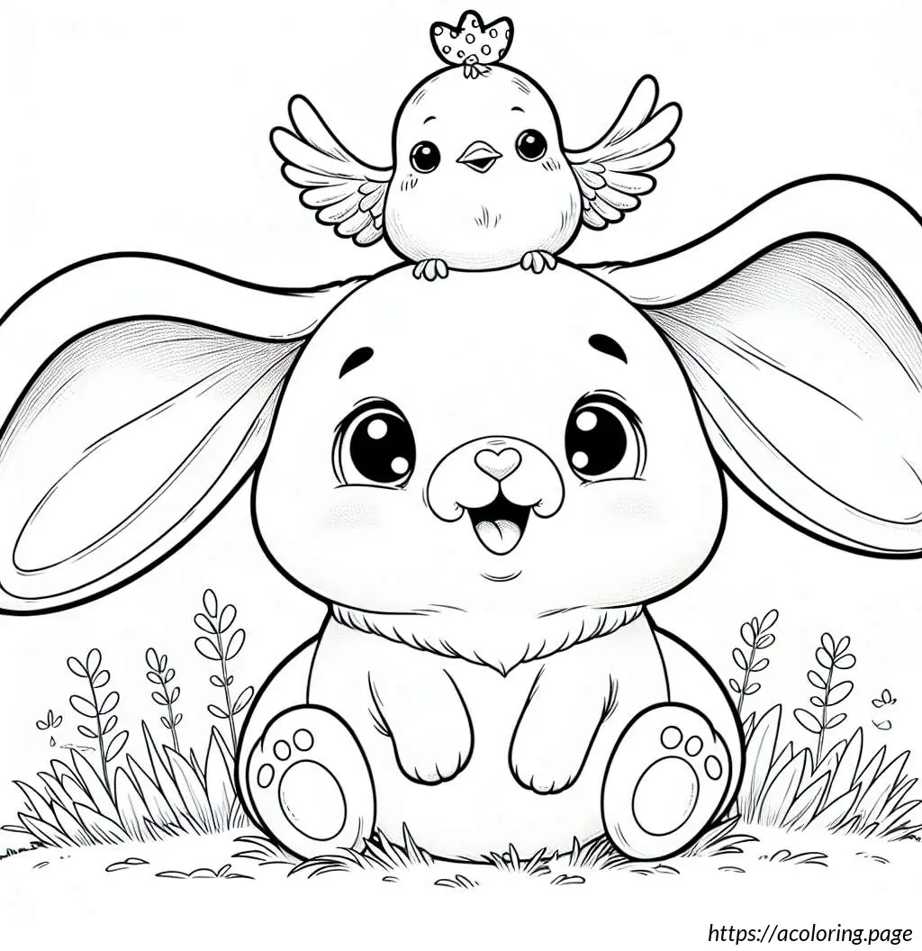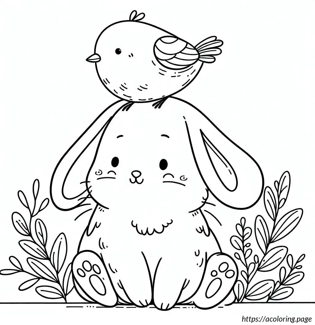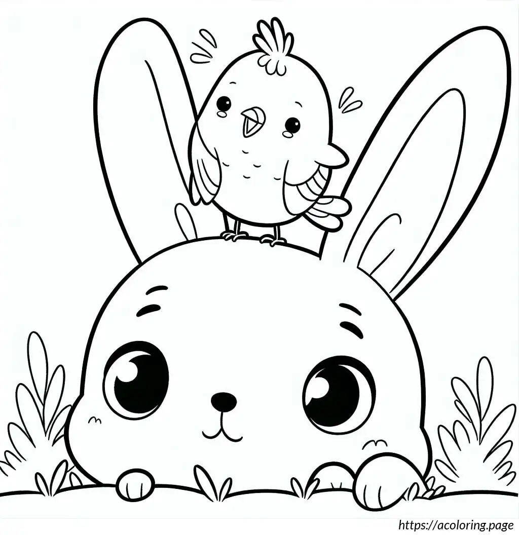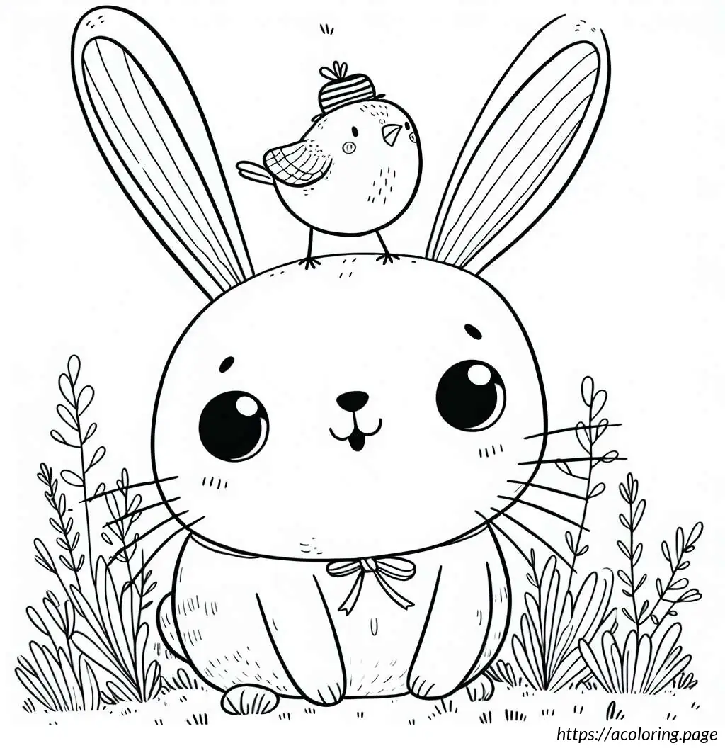 This is a black and white line drawing featuring two cartoon animals stacked on top of each other. On the bottom is a large rabbit with big, expressive eyes and a slightly surprised expression. The rabbit appears to have ears laid back parallel to its body and has a large round nose. On top of the rabbit’s head sits a smaller bird wearing a striped hat. The bird looks cheerful and is depicted with a small crown-like tuft of feathers on its head and wings spread out as if in a friendly gesture. Both characters are placed against a simple background, which includes a feint indication of grass at the bottom to imply they are outside.