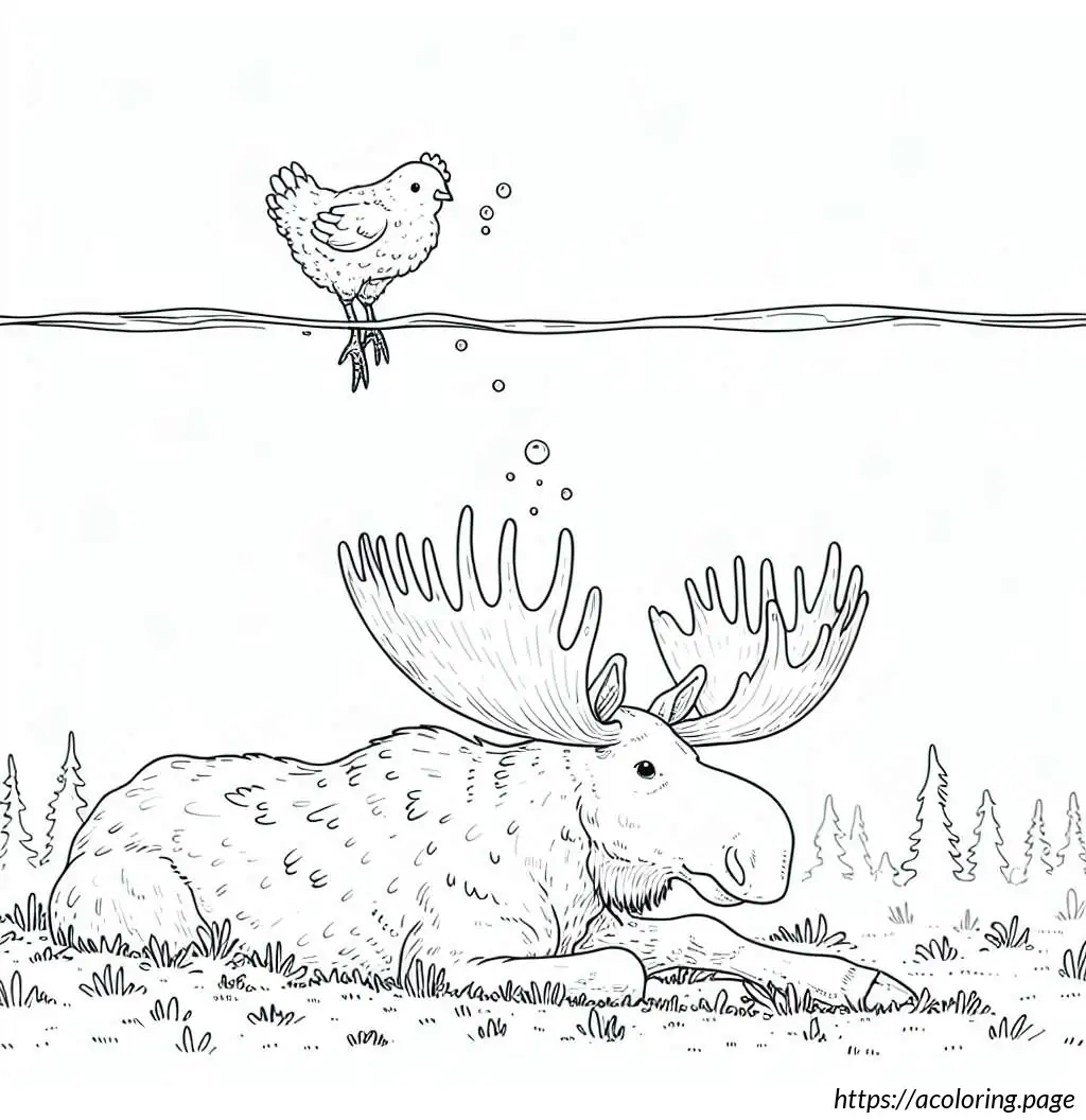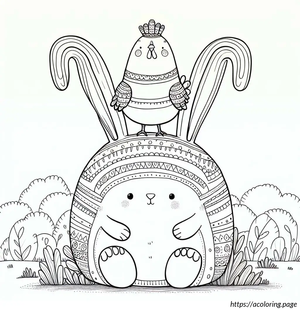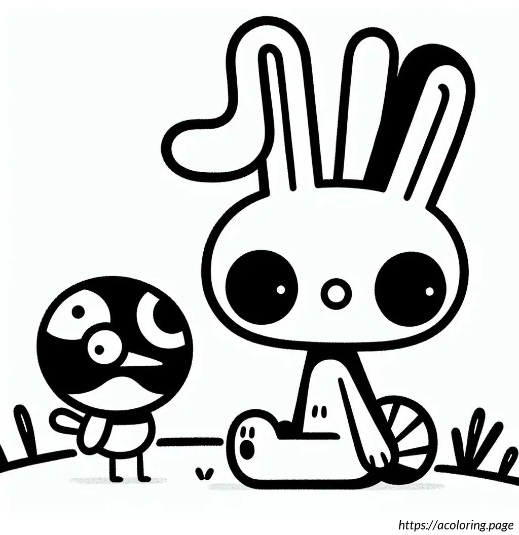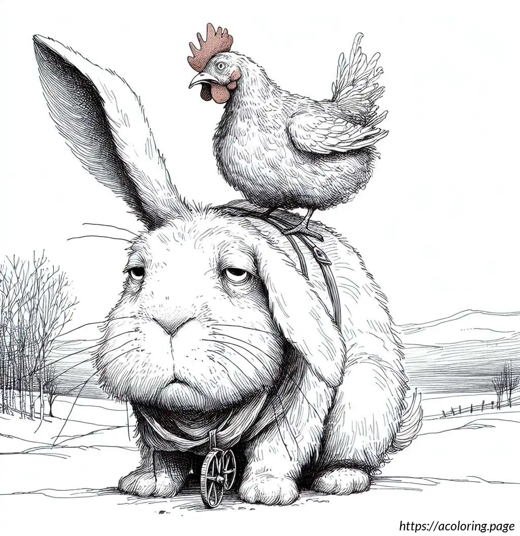 This is a black and white line drawing featuring two cartoon animals stacked on top of each other. On the bottom is a large rabbit with big, expressive eyes and a slightly surprised expression. The rabbit appears to have ears laid back parallel to its body and has a large round nose. On top of the rabbit’s head sits a smaller bird wearing a striped hat. The bird looks cheerful and is depicted with a small crown-like tuft of feathers on its head and wings spread out as if in a friendly gesture. Both characters are placed against a simple background, which includes a feint indication of grass at the bottom to imply they are outside.