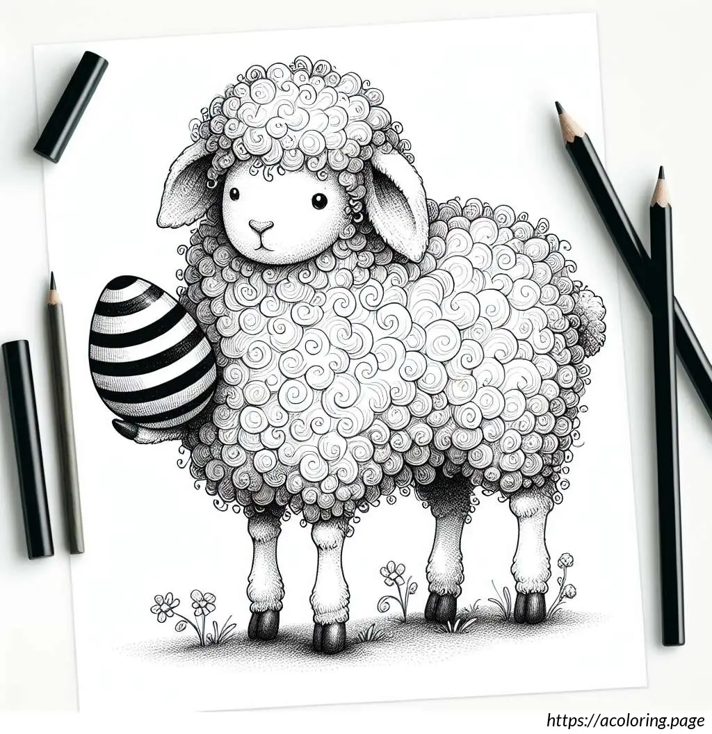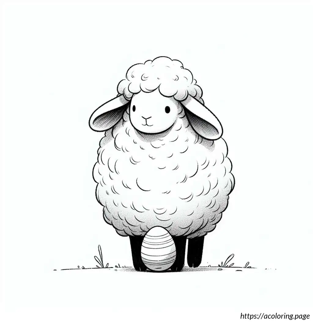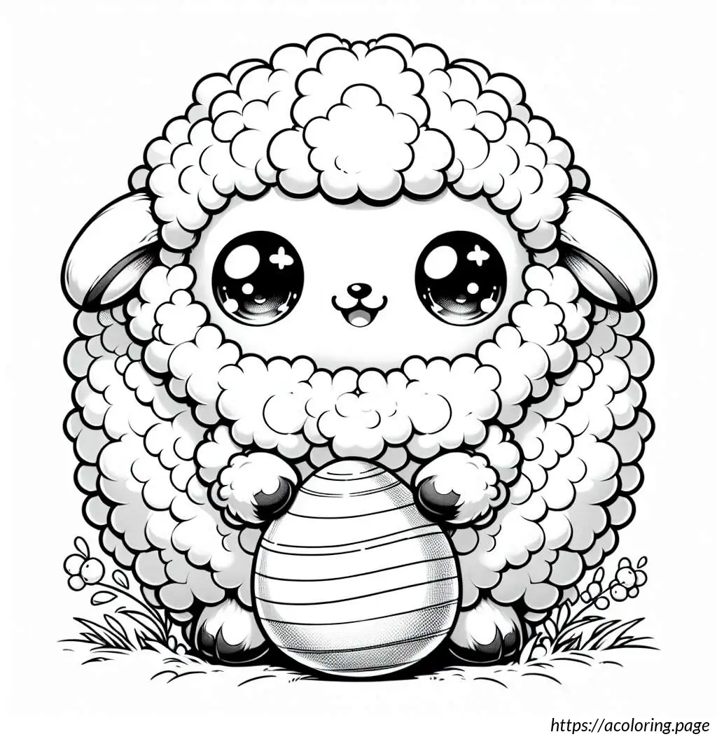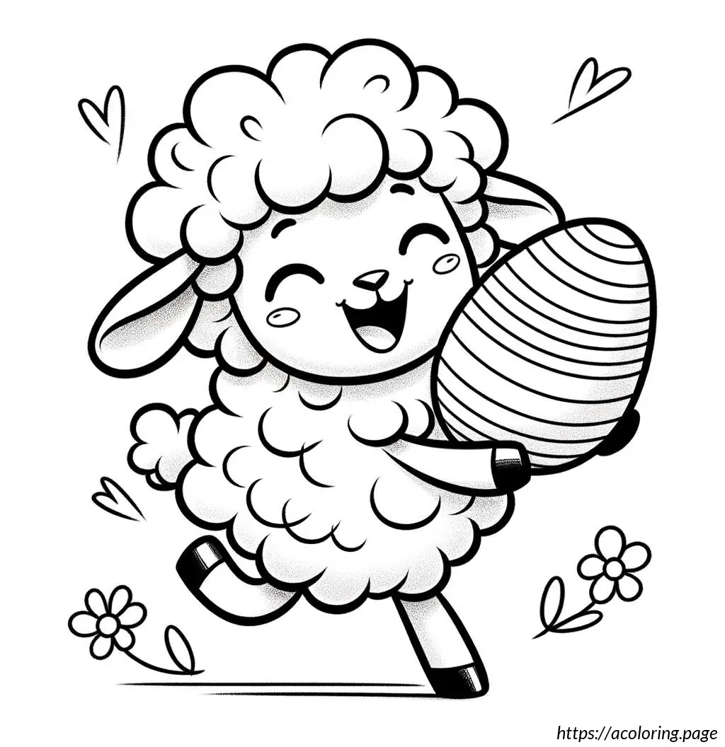 This is a simple black and white line drawing of a cartoon sheep. The sheep has a friendly face, big round eyes, and a small smile. It features a fluffy body and head with distinctive curly wool. Its legs are short and straight. The sheep is holding an oval-shaped object, resembling an Easter egg, with horizontal stripes on it. The overall style of the drawing is cute and child-friendly, ideal for coloring activities.