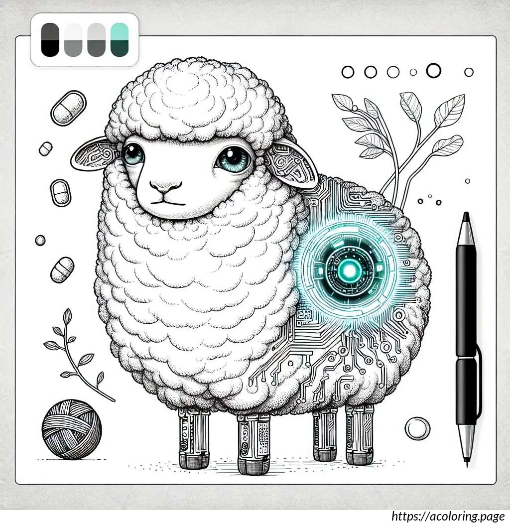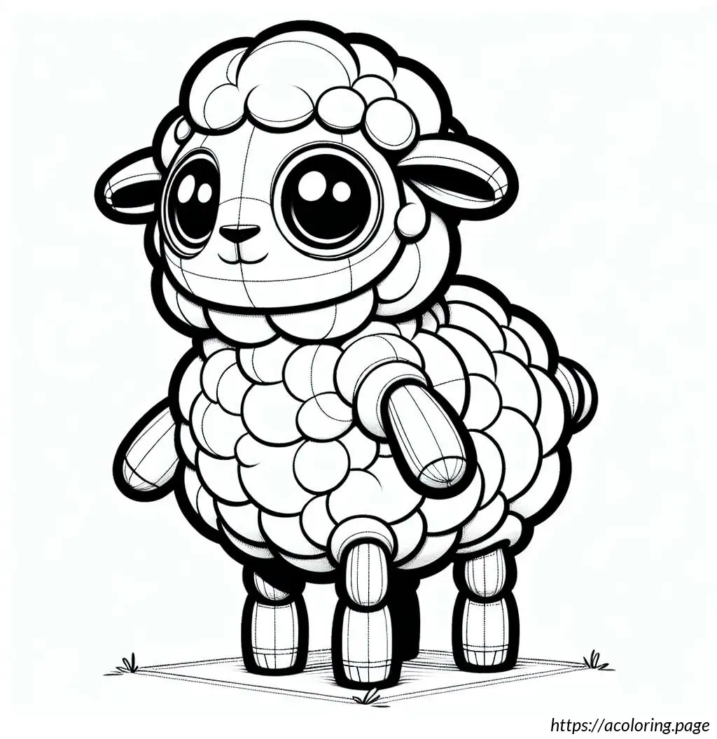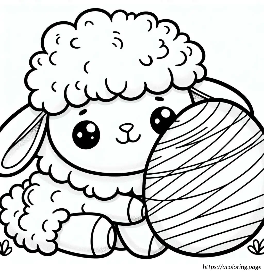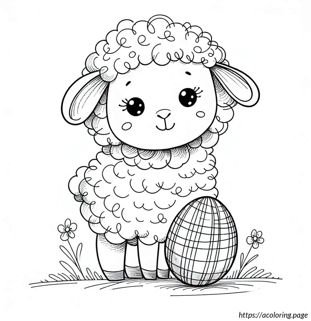 This is a simple black and white line drawing of a cartoon sheep. The sheep has a friendly face, big round eyes, and a small smile. It features a fluffy body and head with distinctive curly wool. Its legs are short and straight. The sheep is holding an oval-shaped object, resembling an Easter egg, with horizontal stripes on it. The overall style of the drawing is cute and child-friendly, ideal for coloring activities.