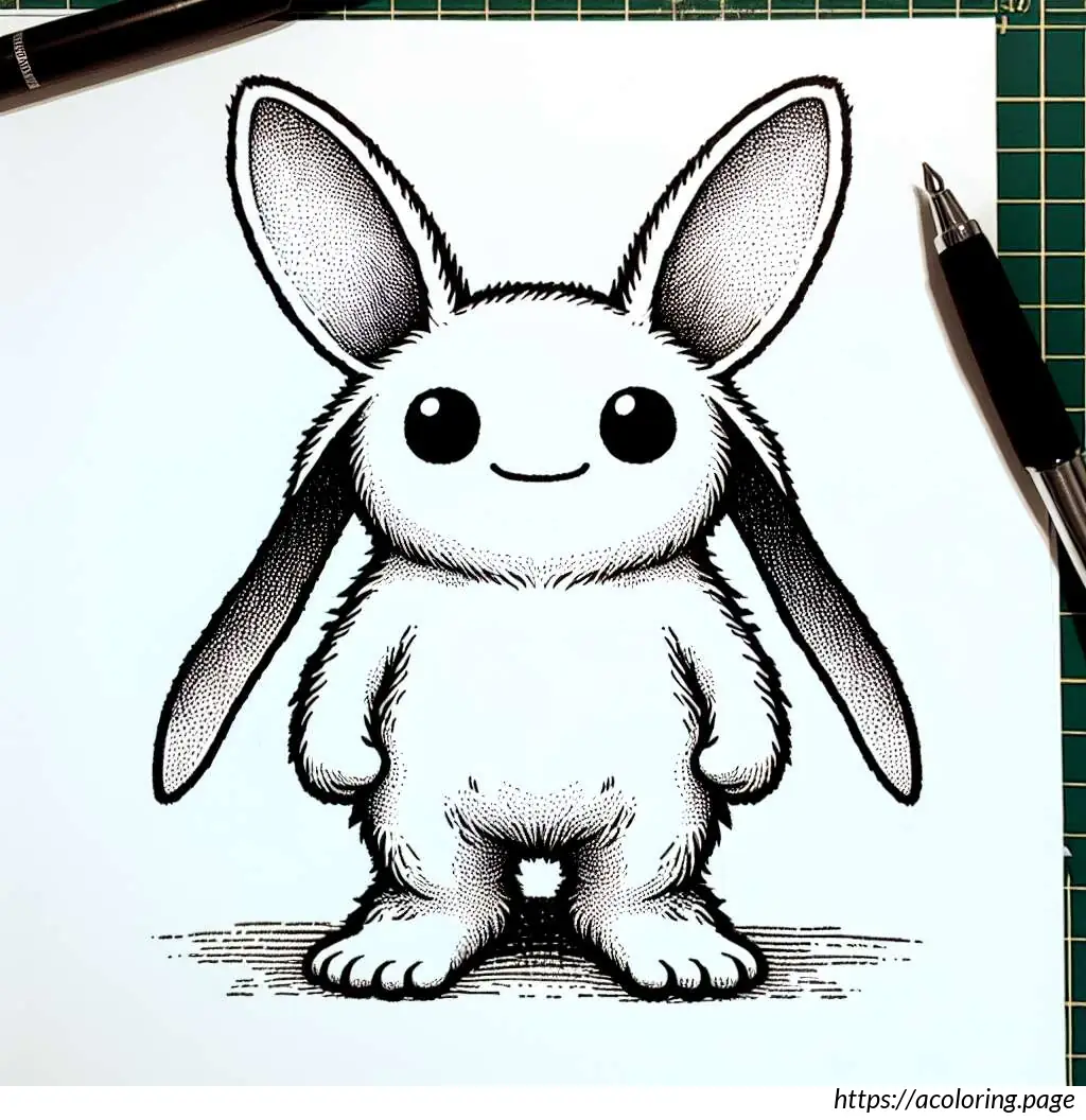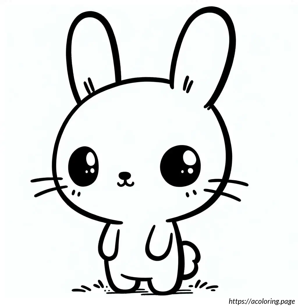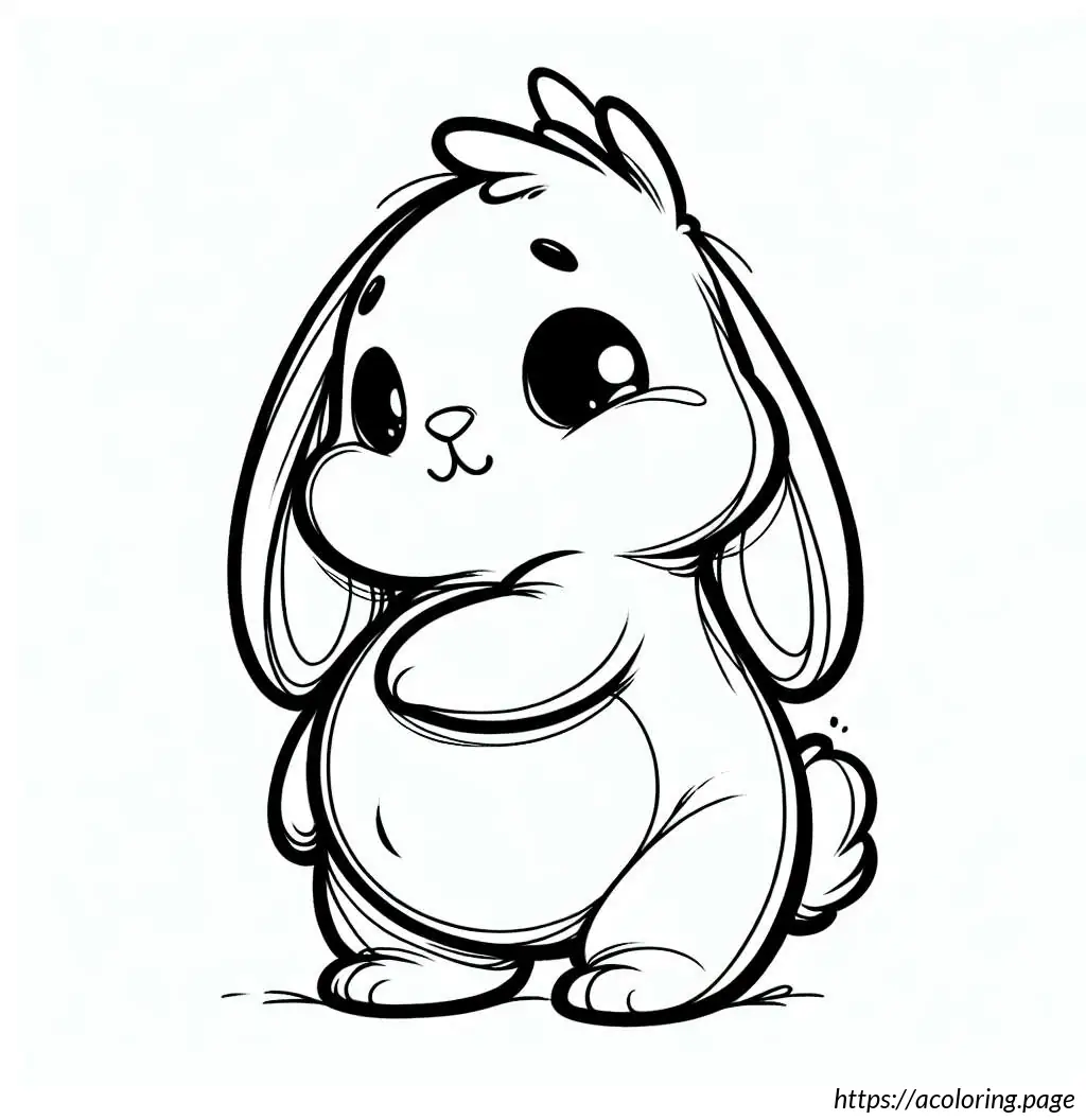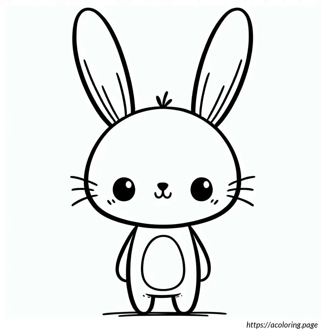 The image is a simple black and white line drawing of a cartoon rabbit. The rabbit appears to be standing upright. It has large, expressive eyes and a small, triangular nose positioned centrally just below the eyes. The ears are long and upright, with a slight curve. Three whiskers project from each side of the face, just above the mouth. The rabbit has hands pressed against its round belly and its feet are simple, with detailing to suggest toes. On the forehead, there’s a hint of hair or fur depicted by little jagged lines. The overall style of the drawing is cute and child-friendly, characterized by its clean lines and lack of color.