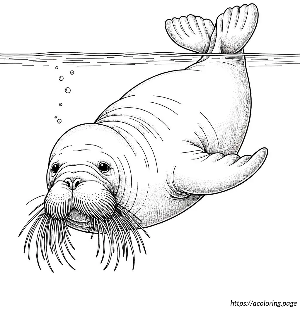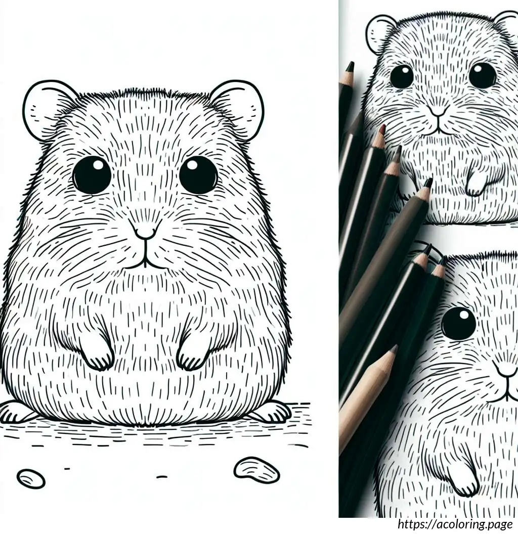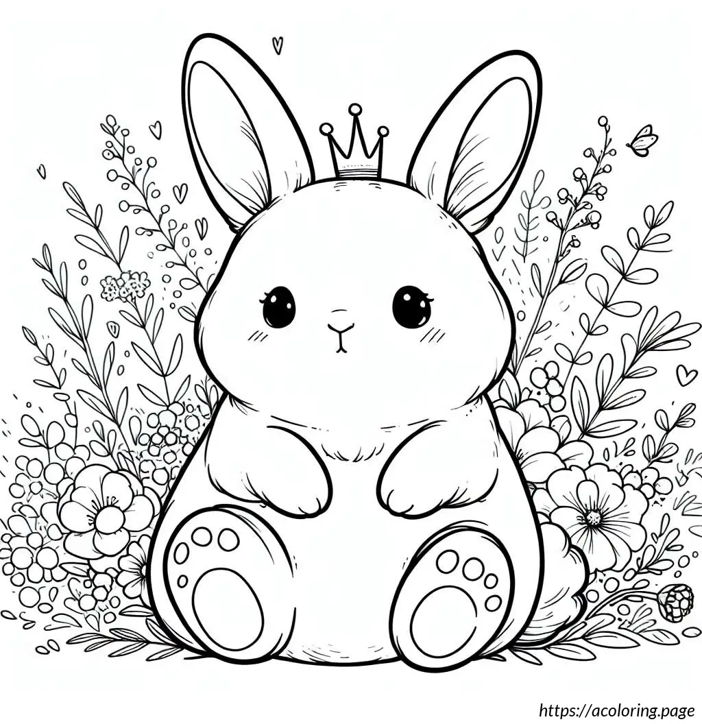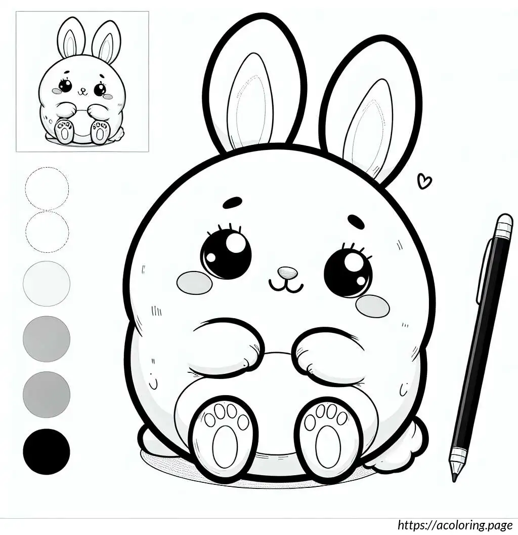 The image is a simple black and white line drawing of a cartoon rabbit. The rabbit appears to be standing upright. It has large, expressive eyes and a small, triangular nose positioned centrally just below the eyes. The ears are long and upright, with a slight curve. Three whiskers project from each side of the face, just above the mouth. The rabbit has hands pressed against its round belly and its feet are simple, with detailing to suggest toes. On the forehead, there’s a hint of hair or fur depicted by little jagged lines. The overall style of the drawing is cute and child-friendly, characterized by its clean lines and lack of color.