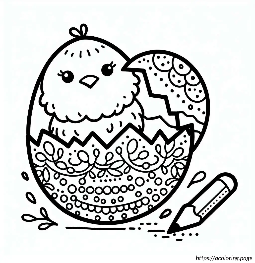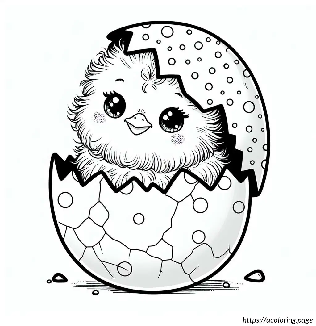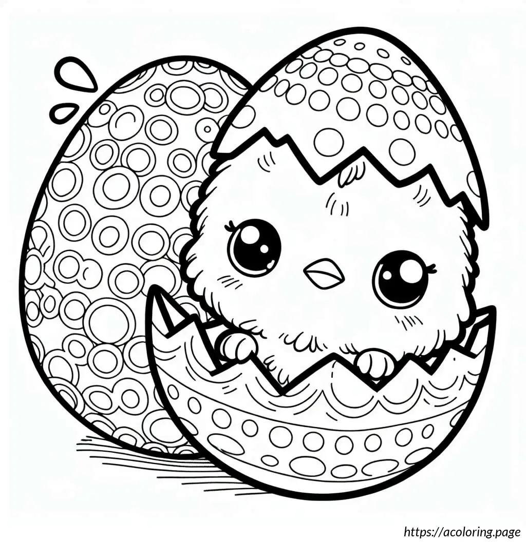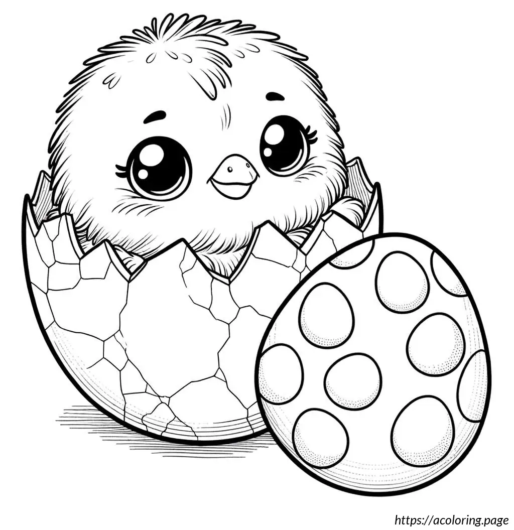 The image features a cute, cartoon-style illustration of a chick hatching from an egg. The chick is peeking out from the top half of a broken egg shell, which is decorated with a pattern of various-sized circles or dots. The chick shows a happy expression with large round eyes, a small beak, and a fluffy outline suggesting soft feathers. The lower half of the egg also has the same circle pattern as the top, reinforcing the playful, whimsical theme typical of children’s illustrations. The design is outlined in bold black lines, making it ideal for coloring activities.