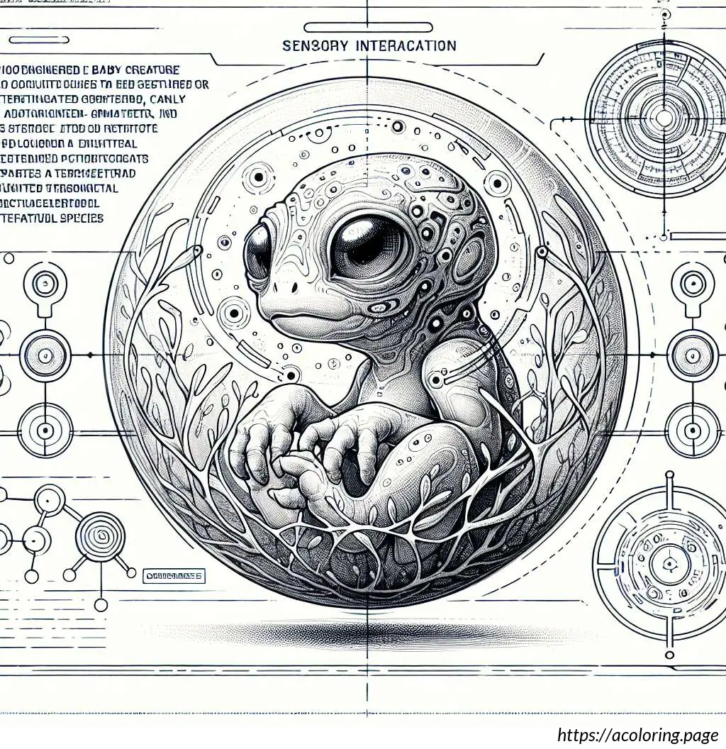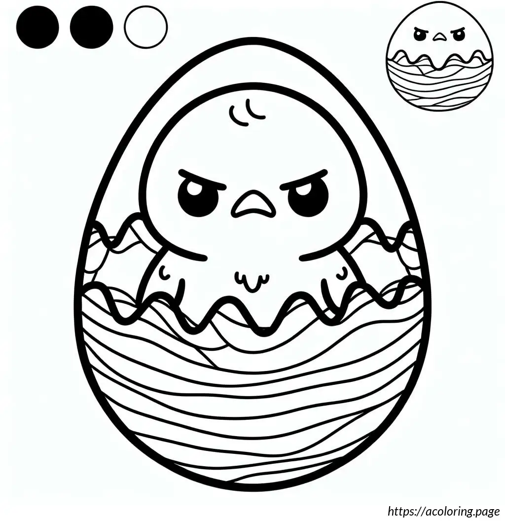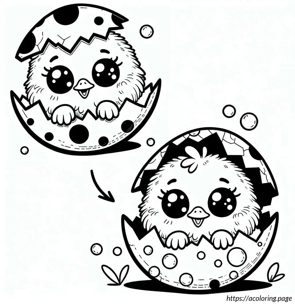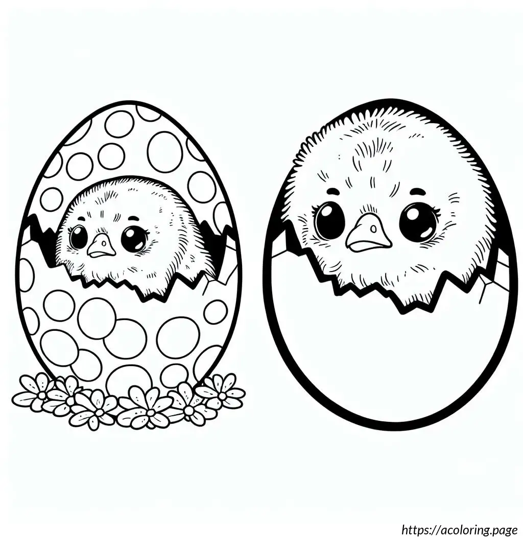 The image features a cute, cartoon-style illustration of a chick hatching from an egg. The chick is peeking out from the top half of a broken egg shell, which is decorated with a pattern of various-sized circles or dots. The chick shows a happy expression with large round eyes, a small beak, and a fluffy outline suggesting soft feathers. The lower half of the egg also has the same circle pattern as the top, reinforcing the playful, whimsical theme typical of children’s illustrations. The design is outlined in bold black lines, making it ideal for coloring activities.